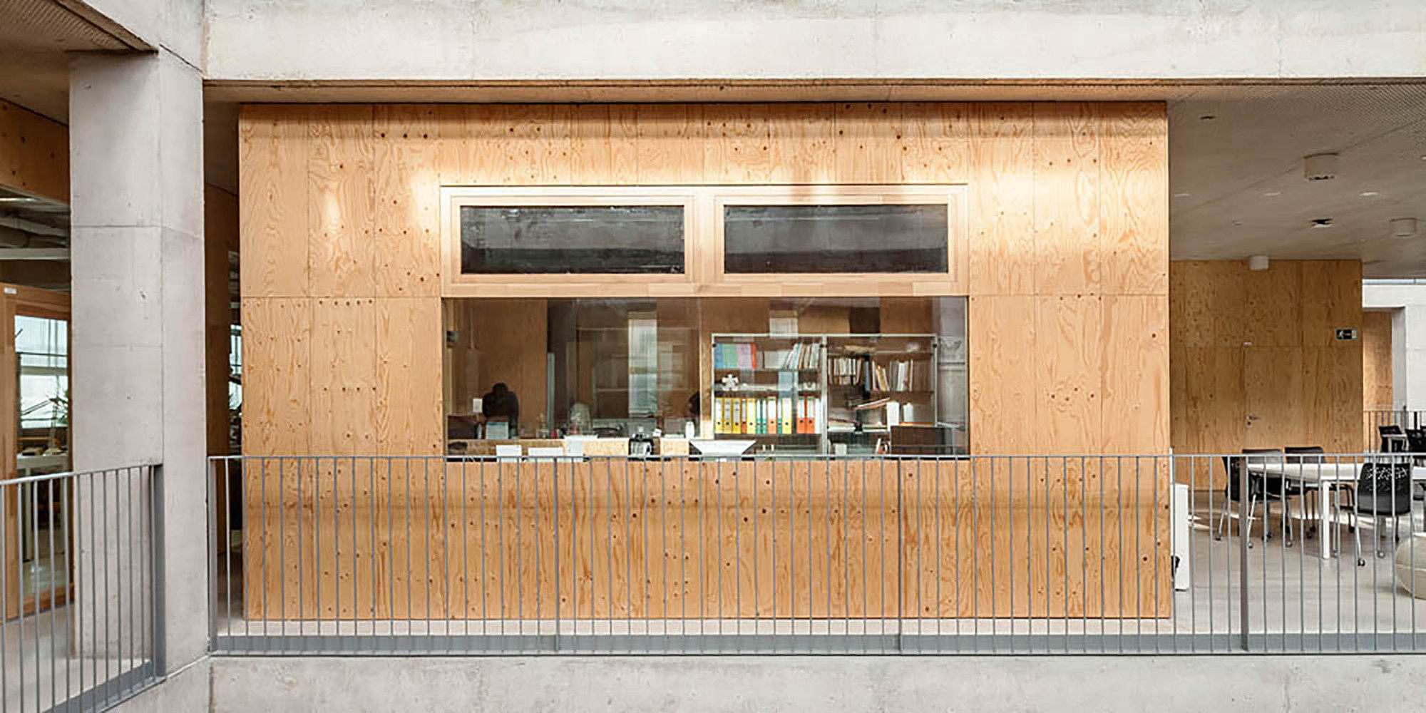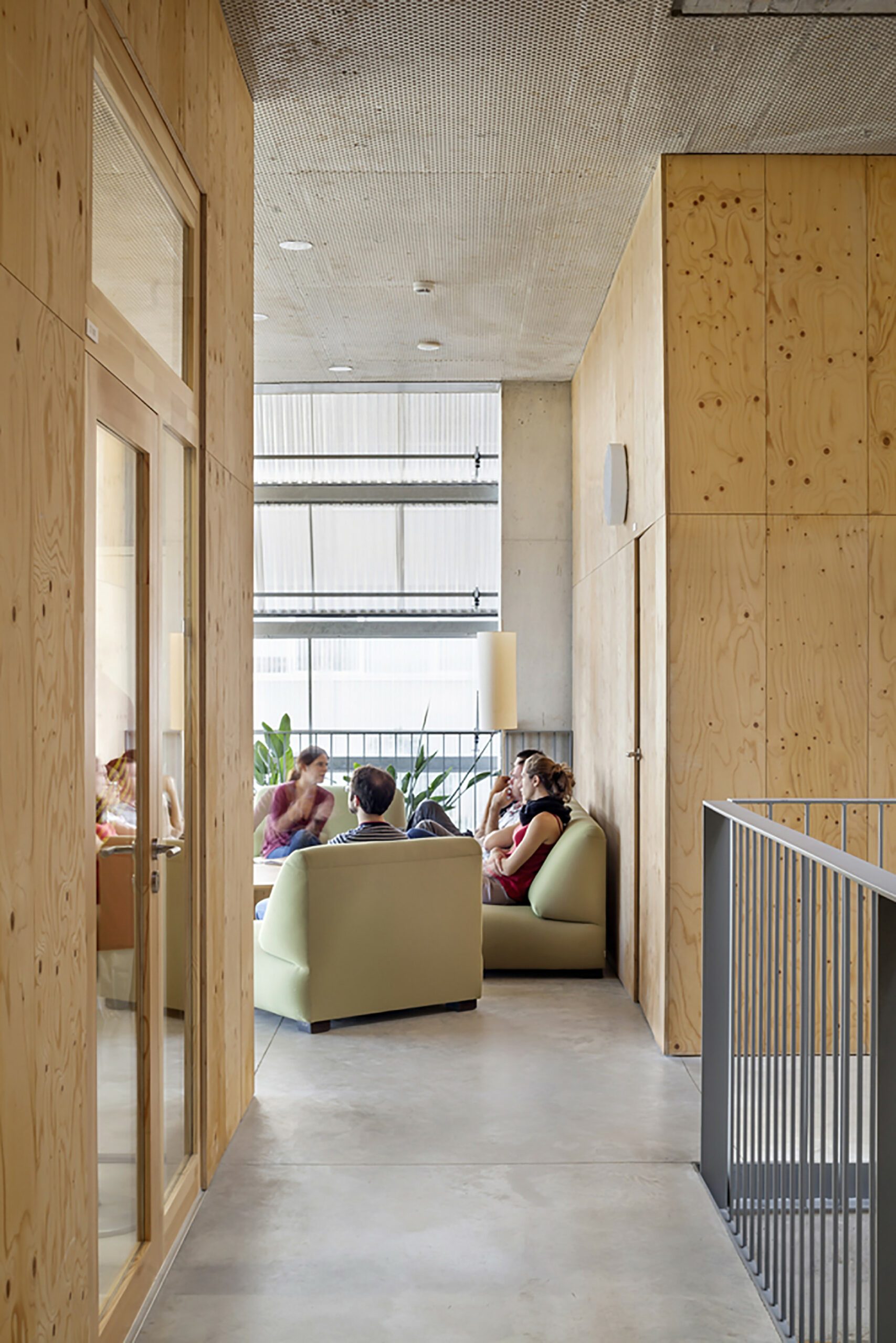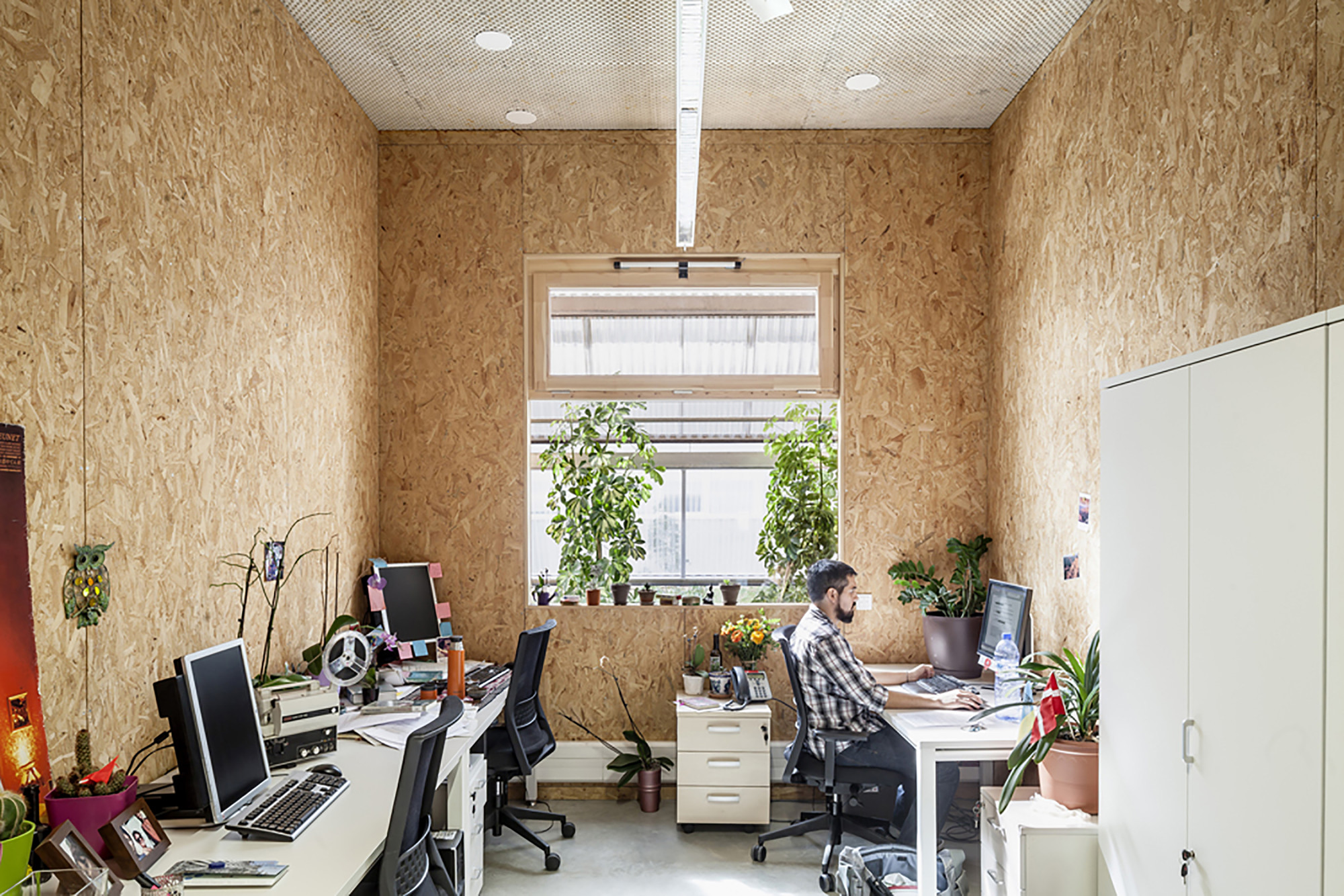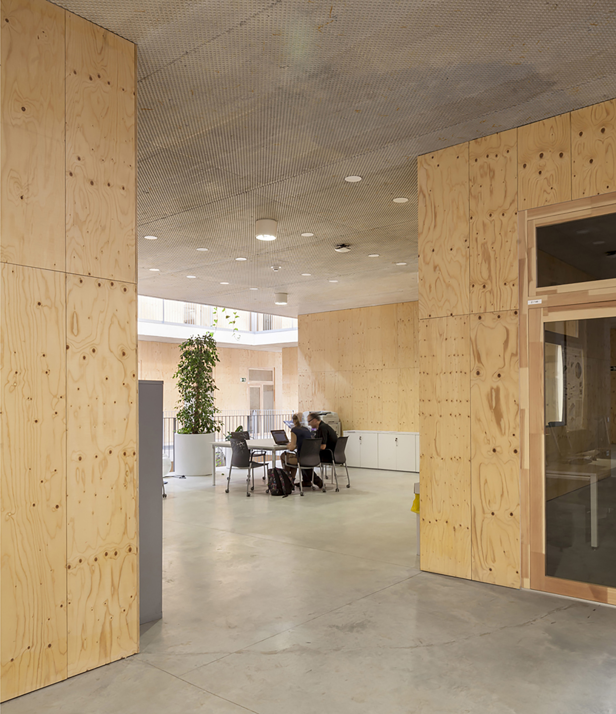 En el interior de este clima mejorado se disponen unas cajas de madera bien aisladas, con aberturas de vidrio practicables, que acaban de dar las condiciones de confort a los espacios de trabajo. La disposición de estas cajas cambia en cada planta ajustándose a las necesidades de los usuarios, creando unos espacios intersticiales generosos e indeterminados, que se encadenan con las circulaciones y conforman espacios de encuentro y descanso más informales.