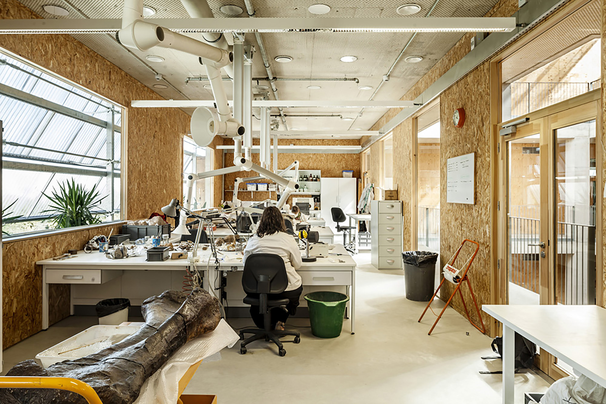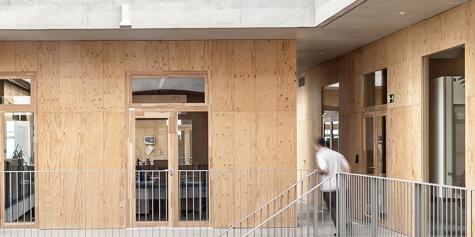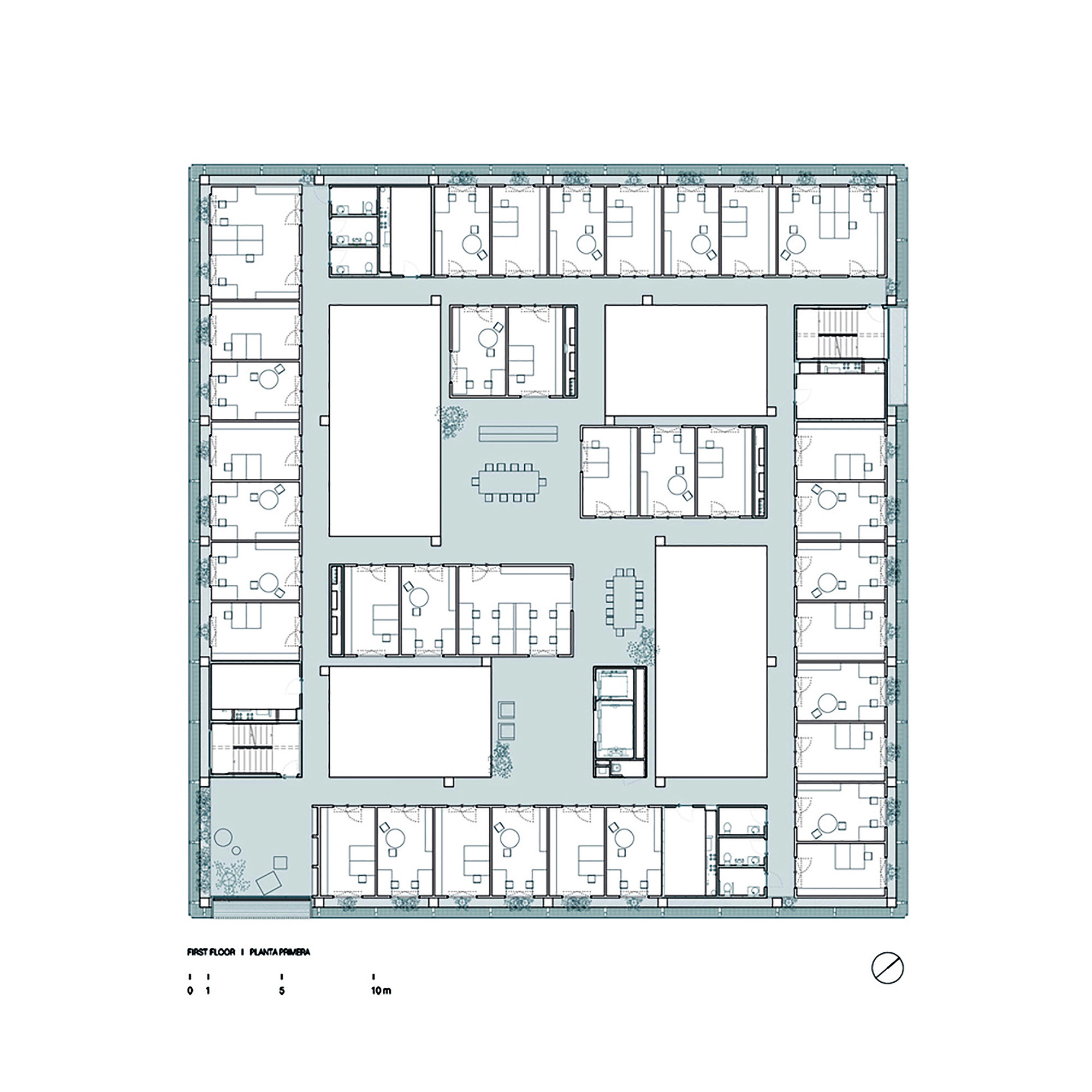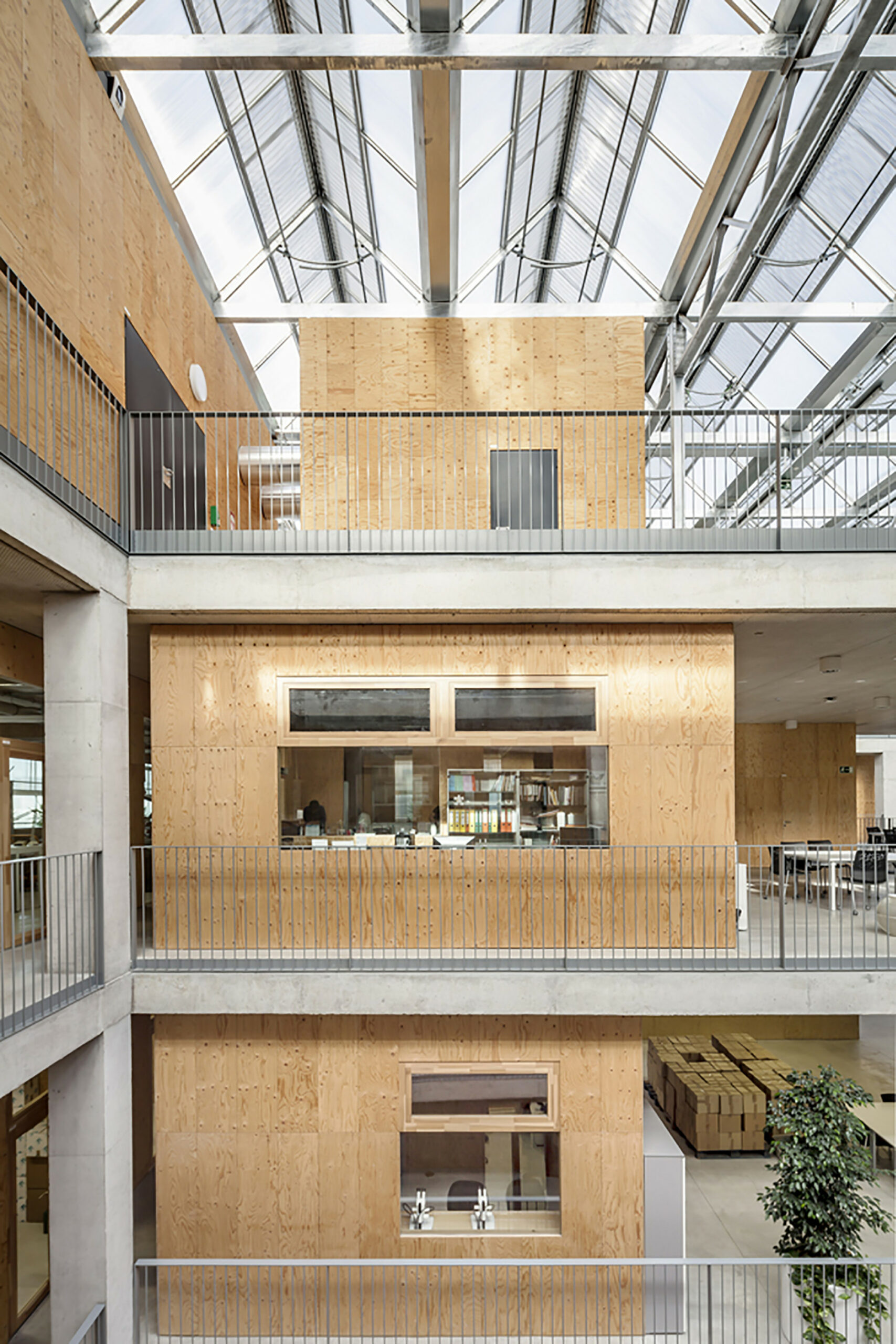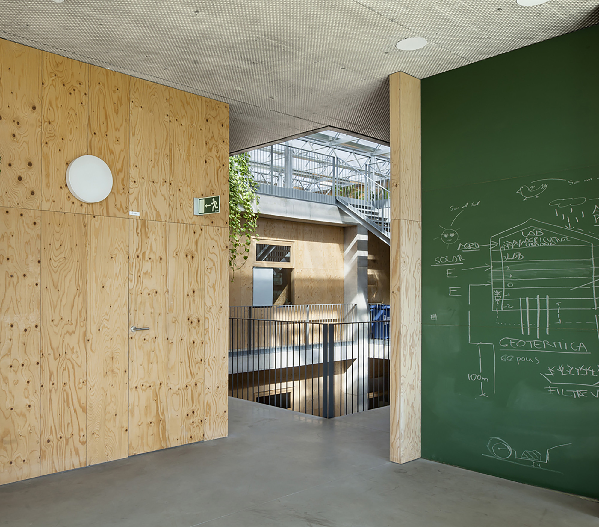 En el interior de este clima mejorado se disponen unas cajas de madera bien aisladas, con aberturas de vidrio practicables, que acaban de dar las condiciones de confort a los espacios de trabajo. La disposición de estas cajas cambia en cada planta ajustándose a las necesidades de los usuarios, creando unos espacios intersticiales generosos e indeterminados, que se encadenan con las circulaciones y conforman espacios de encuentro y descanso más informales.