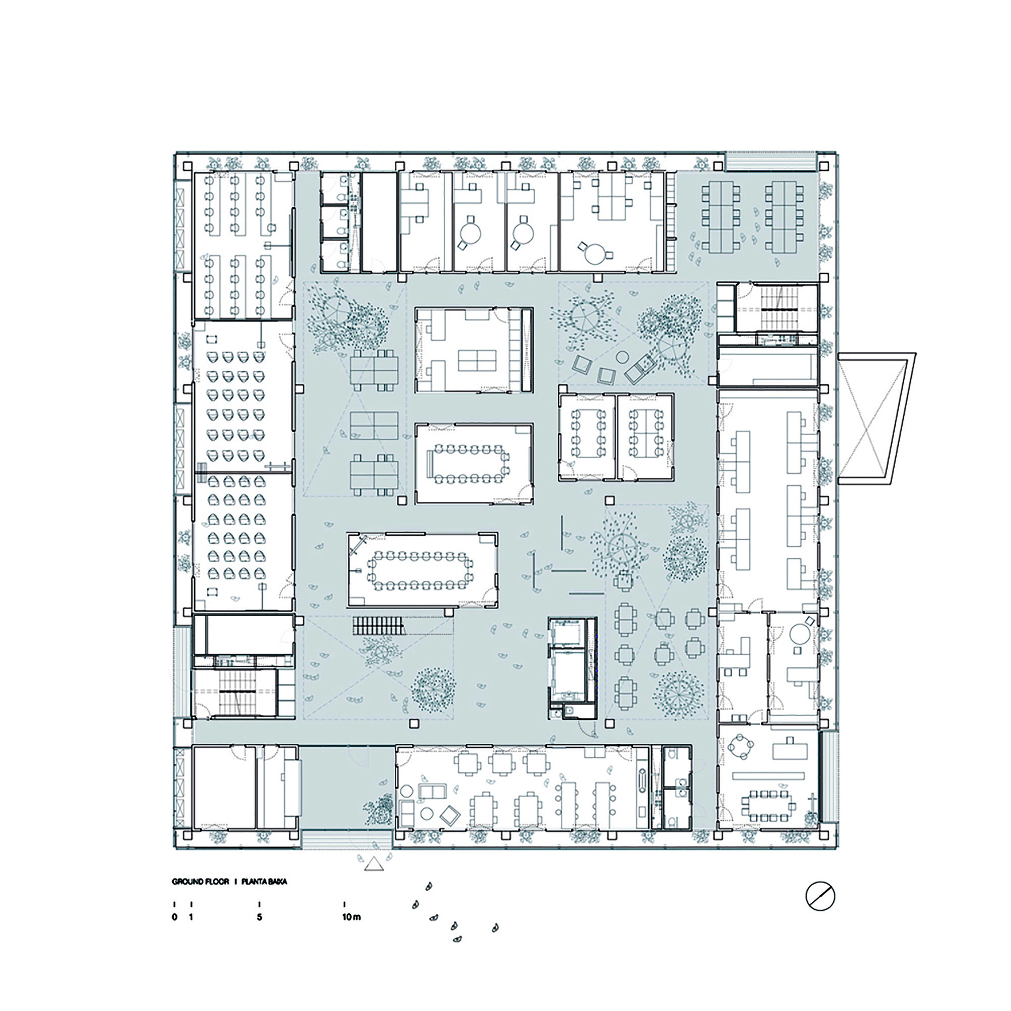 En el medio del edificio, cuatro patios verticales, con escaleras que conectan puntualmente los diferentes niveles, garantizan luz y ventilación a todos los espacios de trabajo, reduciendo el consumo de luz artificial y, por lo tanto, bajando las cargas internas. Estos patios, así como todo el espacio intermedio del edificio y la galería perimetral, albergan diversas especies vegetales mejorando el confort gracias al ajuste del gradiente de humedad.