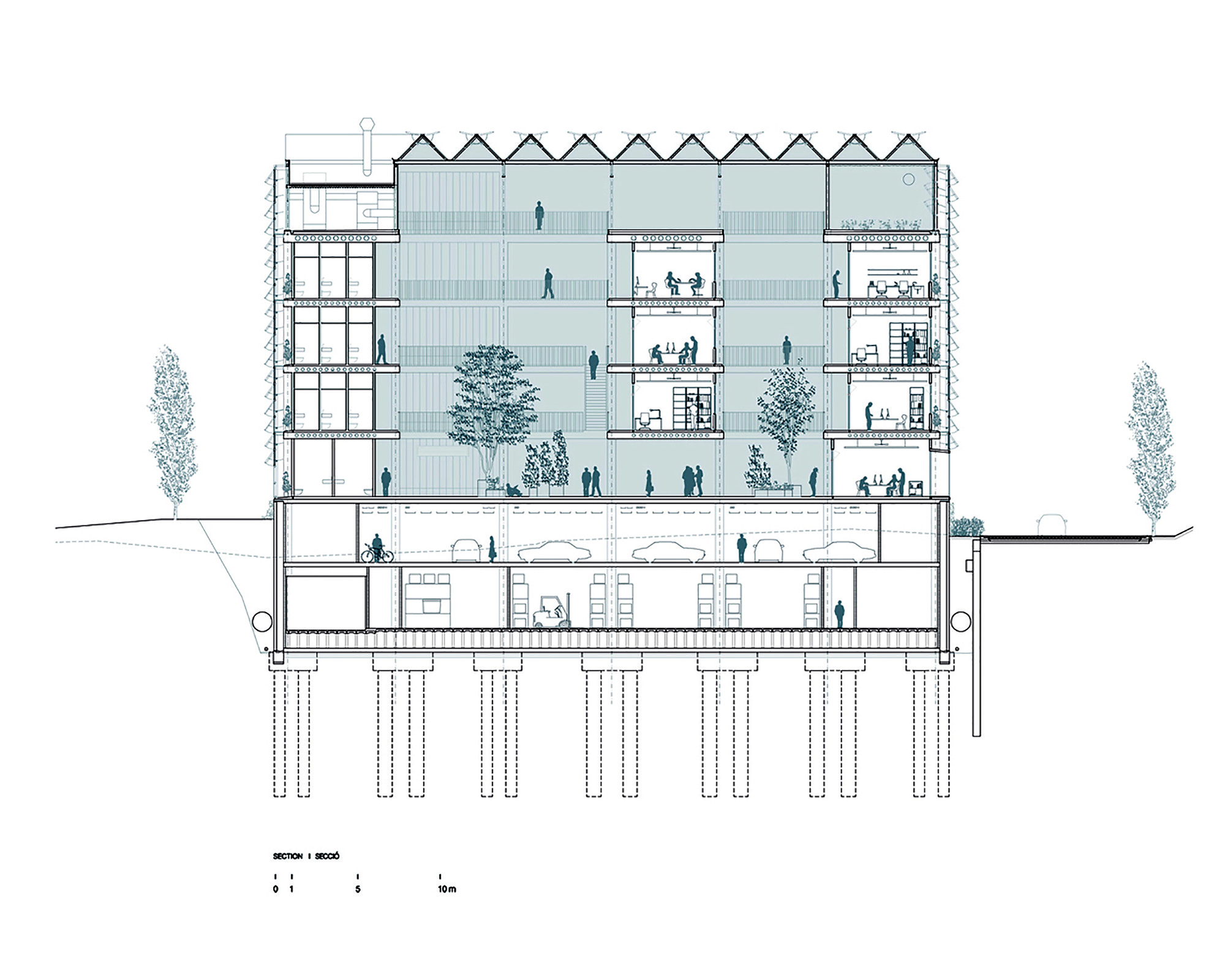 Se ha escogido una estructura de hormigón, de larga vida útil y bajo coste, con mucha inercia térmica, que colabora directamente en el confort pasivo del edificio. Se ha optimizado la cantidad de hormigón distribuyendo su masa a favor del intercambio térmico mediante losas de hormigón postesadas y aligeradas con tubos en la parte central por donde circula el aire. En la parte superior e inferior se activa la masa térmica del forjado con sistemas radiantes a partir de energía geotérmica.