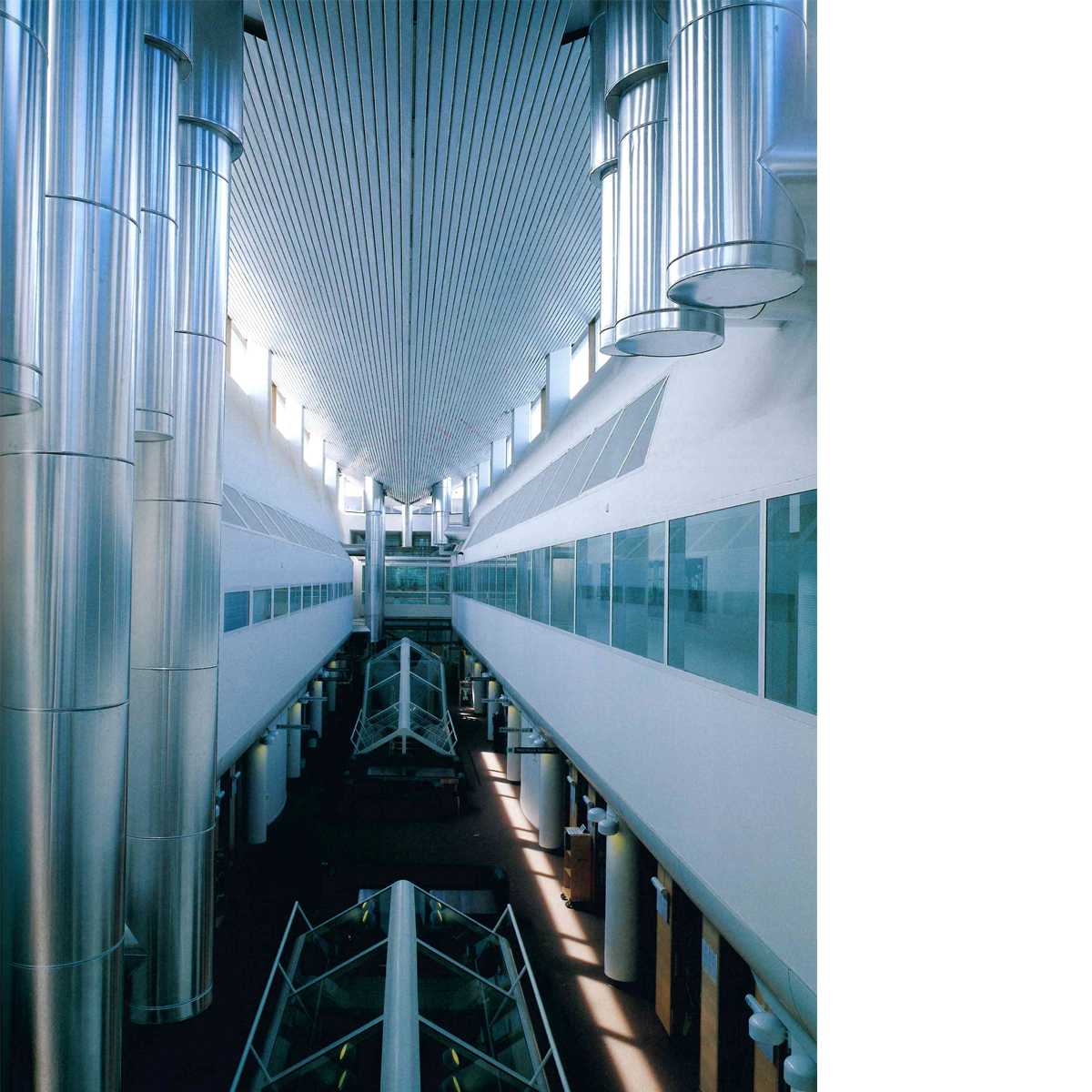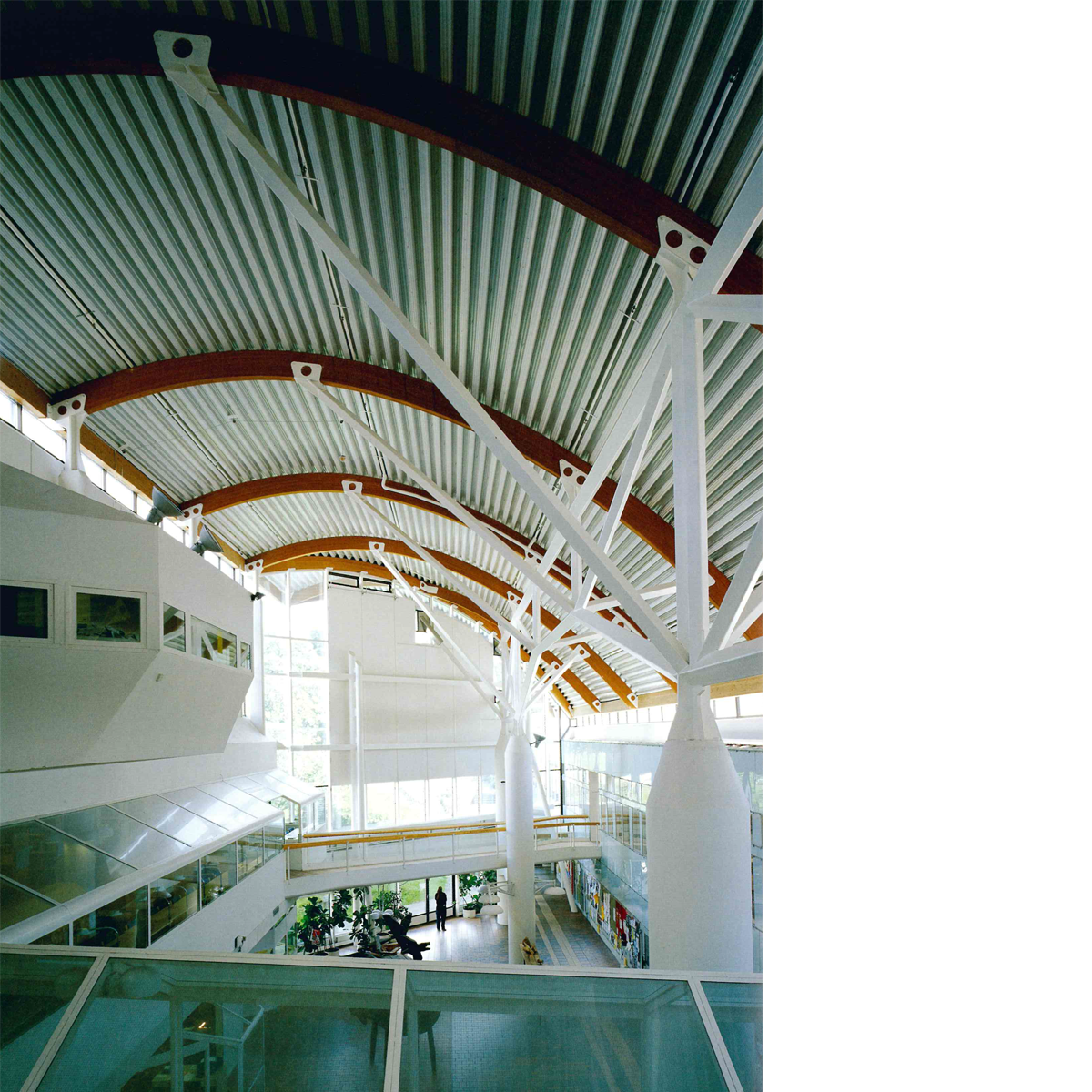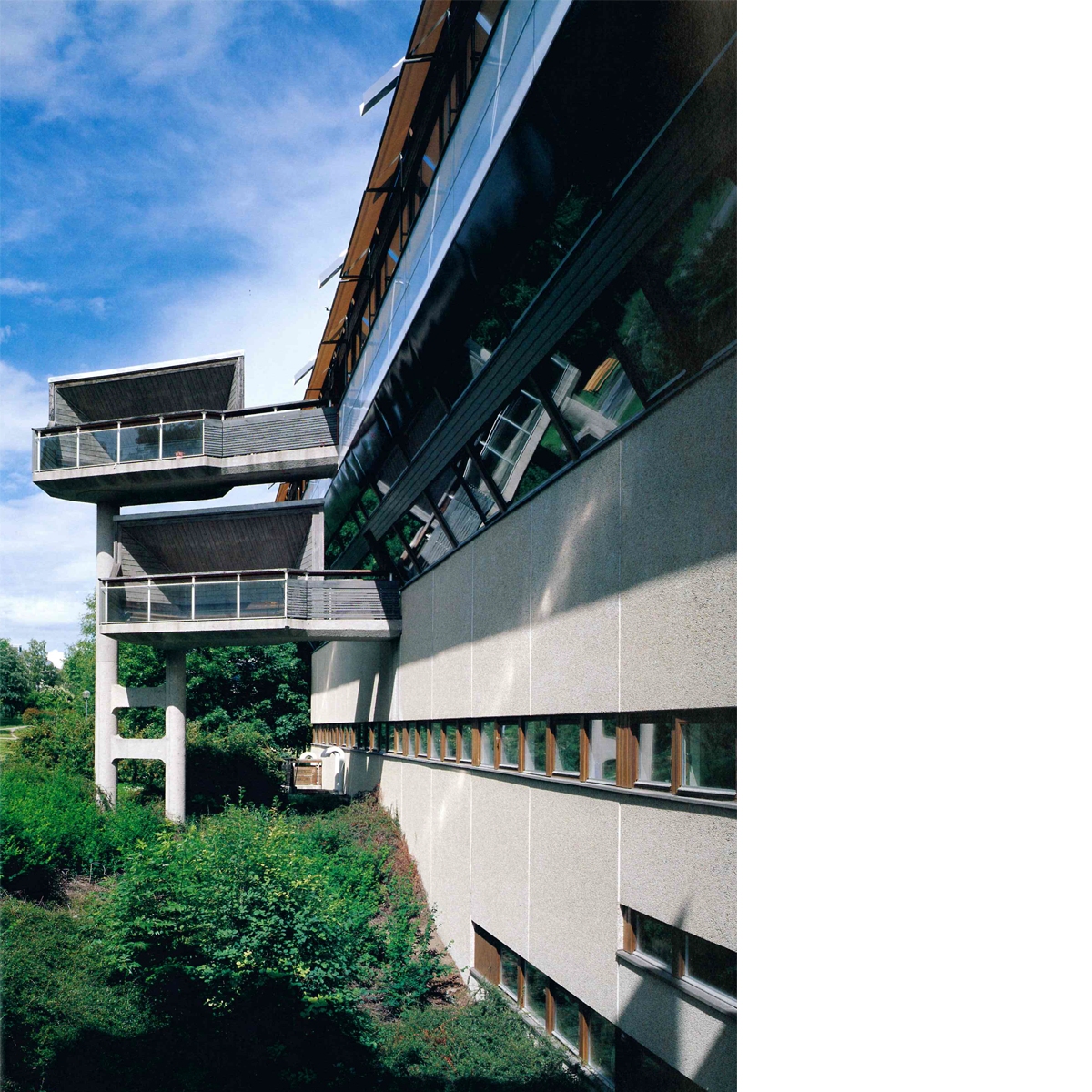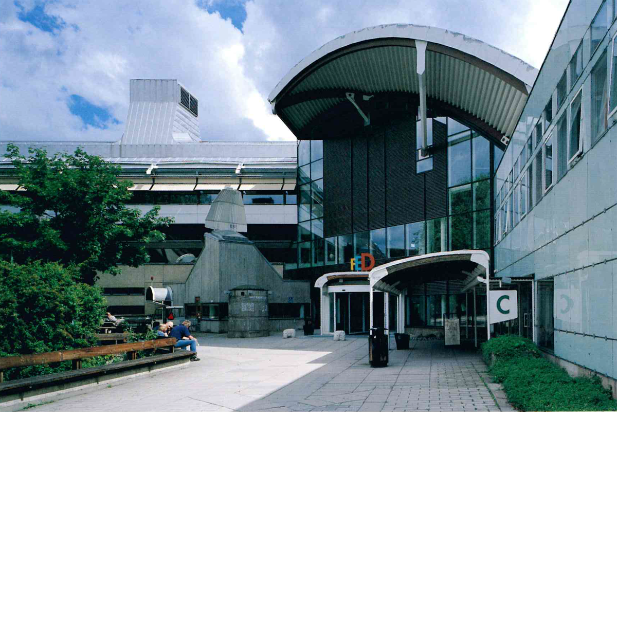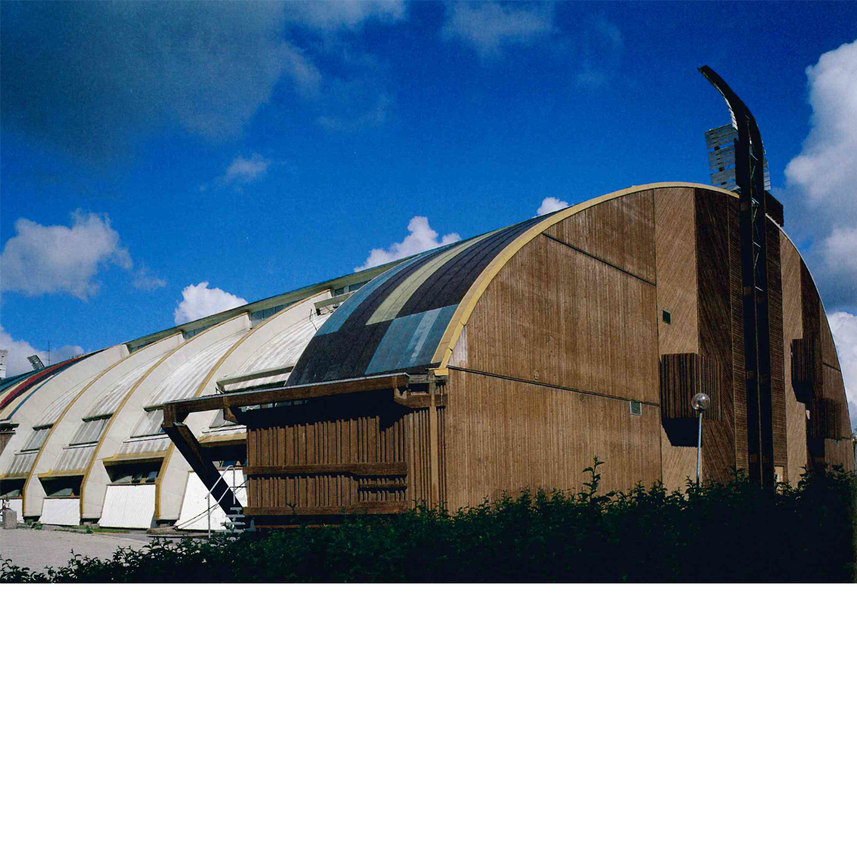 The sports hall was Erskine’s third building at the university campus. The building was subject to a constructor’s competition where building cost was a decisive factor. The hall is a rational construction of arched glued timber beams. An internal building divides the interior in two spaces. The exterior is of large areas of metal sheeting in various colors. The flank pleasing variation. Erskine was keen to incorporate natural daylight into the hall, a feature unusual at the time. Through the interest of the main contractor, sunlight reflectors were realised.