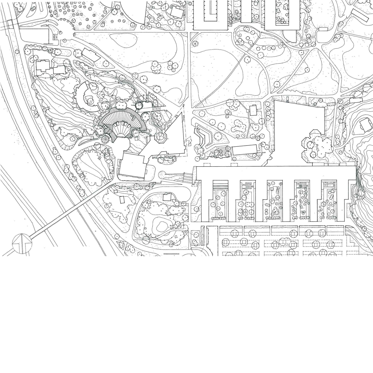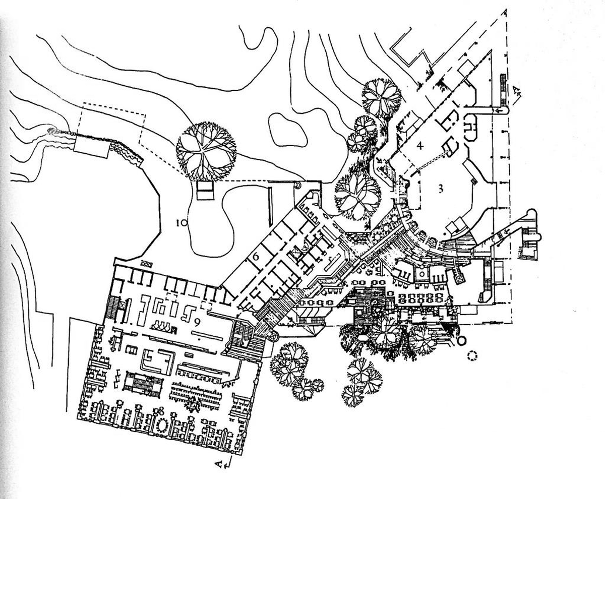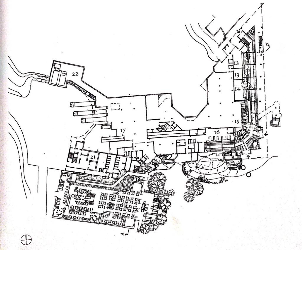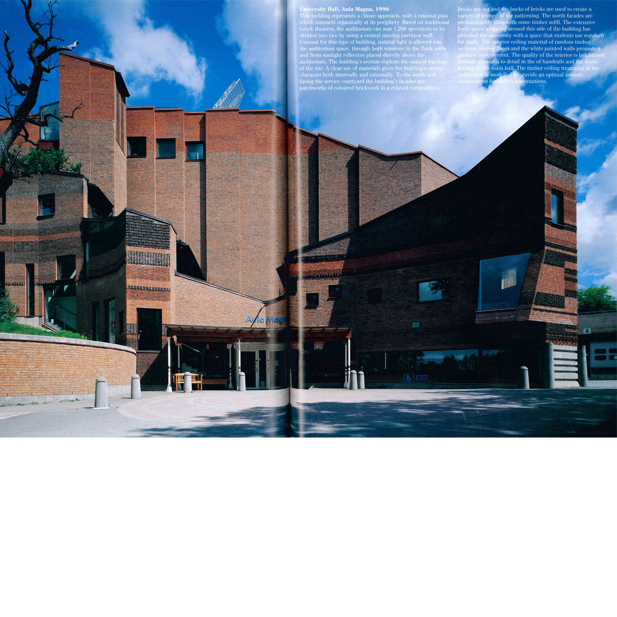 This building represents a classic approach, with a rational plan which interacts organically at its periphery. Based on traditional Greek theatres, the auditorium can seat 1.200 spectators or be divided into two by using a central moving partition wall. Unusual for this type of building, natural light is allowed into the auditorium space, through both windows in the flank walls and from sunlight reflectors placed directly above the auditorium. The building’s section exploits the natural typology of the site. A clear use of materials gives the building a strong character both internally and externally . To the south and facing the service courtyard the building’s facade are patchwork of coloured brickwork in a relaxed composition.