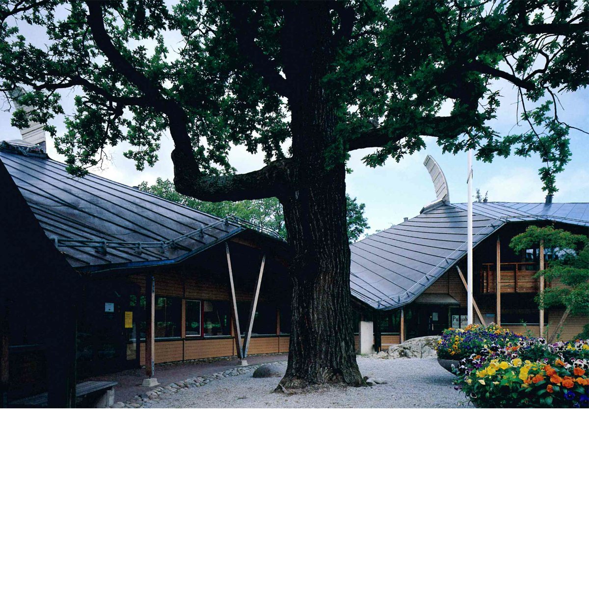The student’s center building completed in 1981 has a roof structure, reminiscent of Borgafjäll Ski Hotel. The strong geometric shapes of the plan interlock and collide to provide a variety of spaces. The new building uses an existing agricultural museum as dining hall.