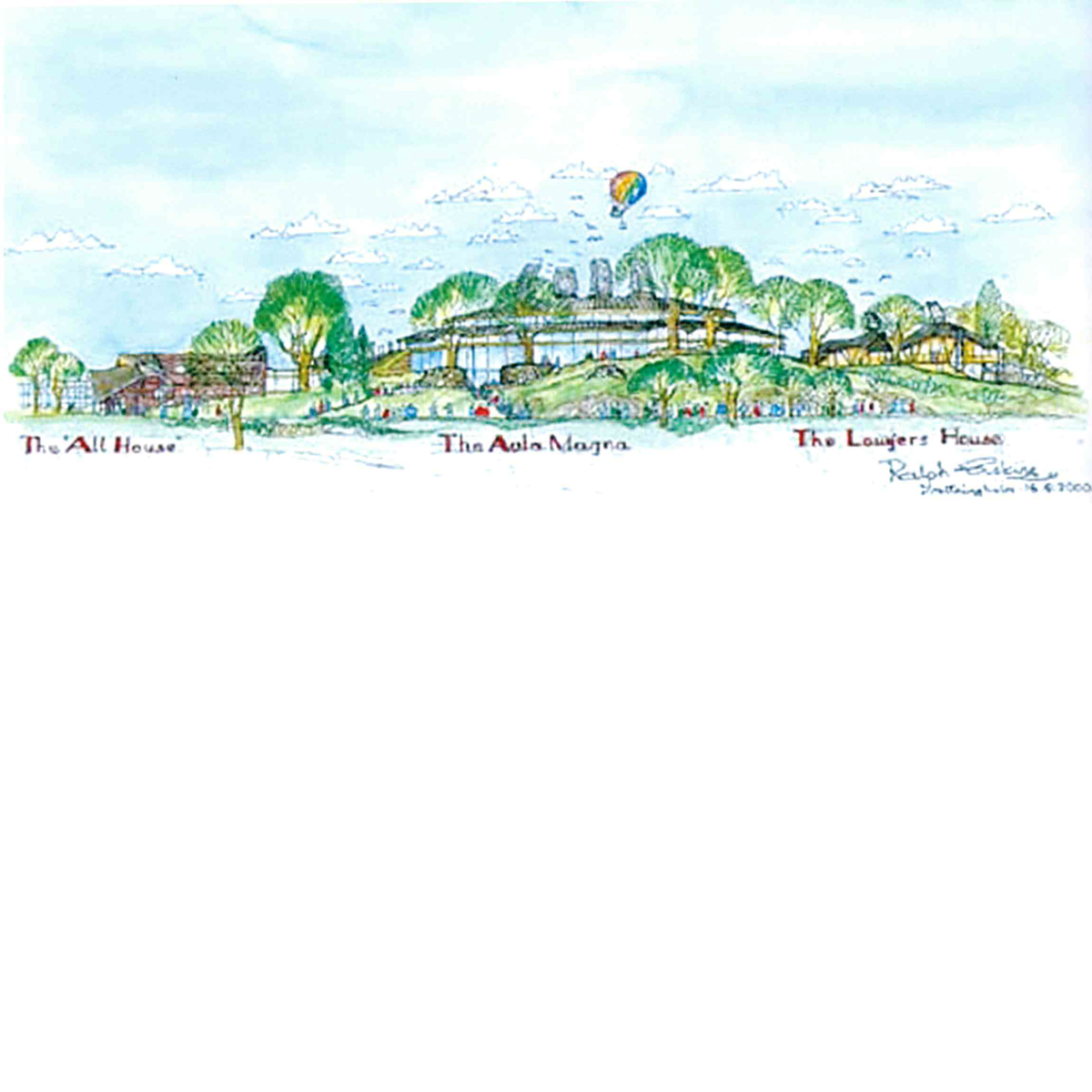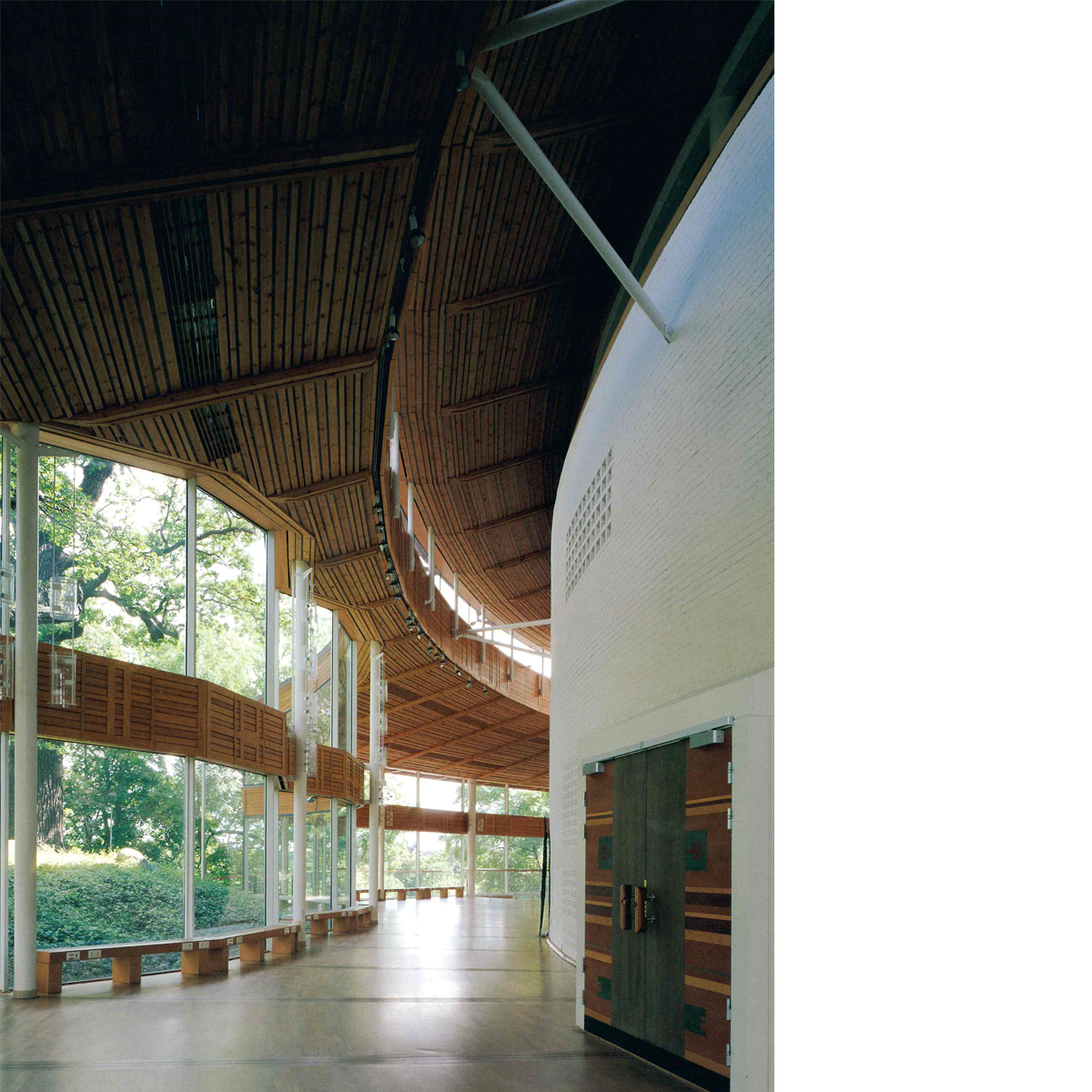 This project for the law student’s building began in 1989. Sited in an oak grove near the main student’s center building it has recognisable geometric plan form. The building shares the same roof detailing of external roof ties and timber facades. The plan form, although being formal, avoids the oak trees and uses the natural slope of the site. The ondulating roof form is a simple method providing a variety of internal spaces.