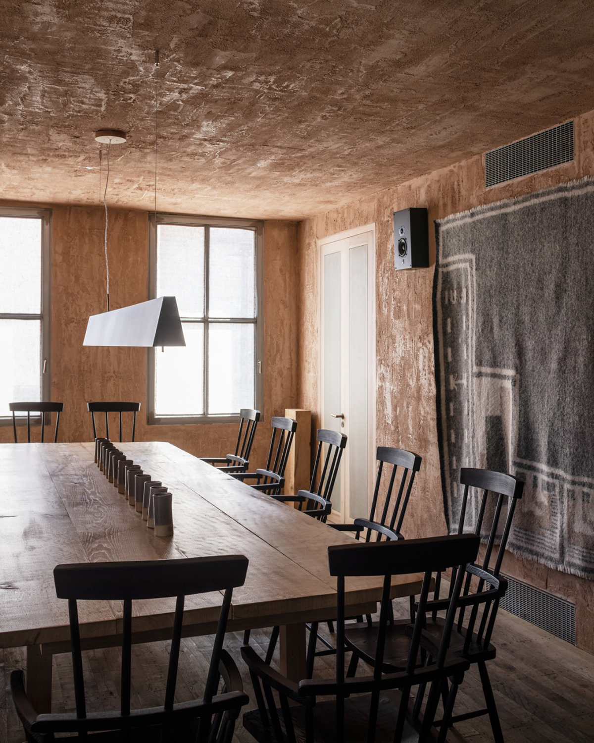 6a led a three-year collaboration with Hostem to transform the six-storey building. A monolithic oak stair is surrounded by walls of galvanised steel and glass bringing transparency and connections to the various multipurpose floors. Soft plaster surfaces cover new and old walls, its natural pinks and greys forming a consistent background to art, clothing and ceramics. Raw oak floors run through the building, aging and patinating over time.