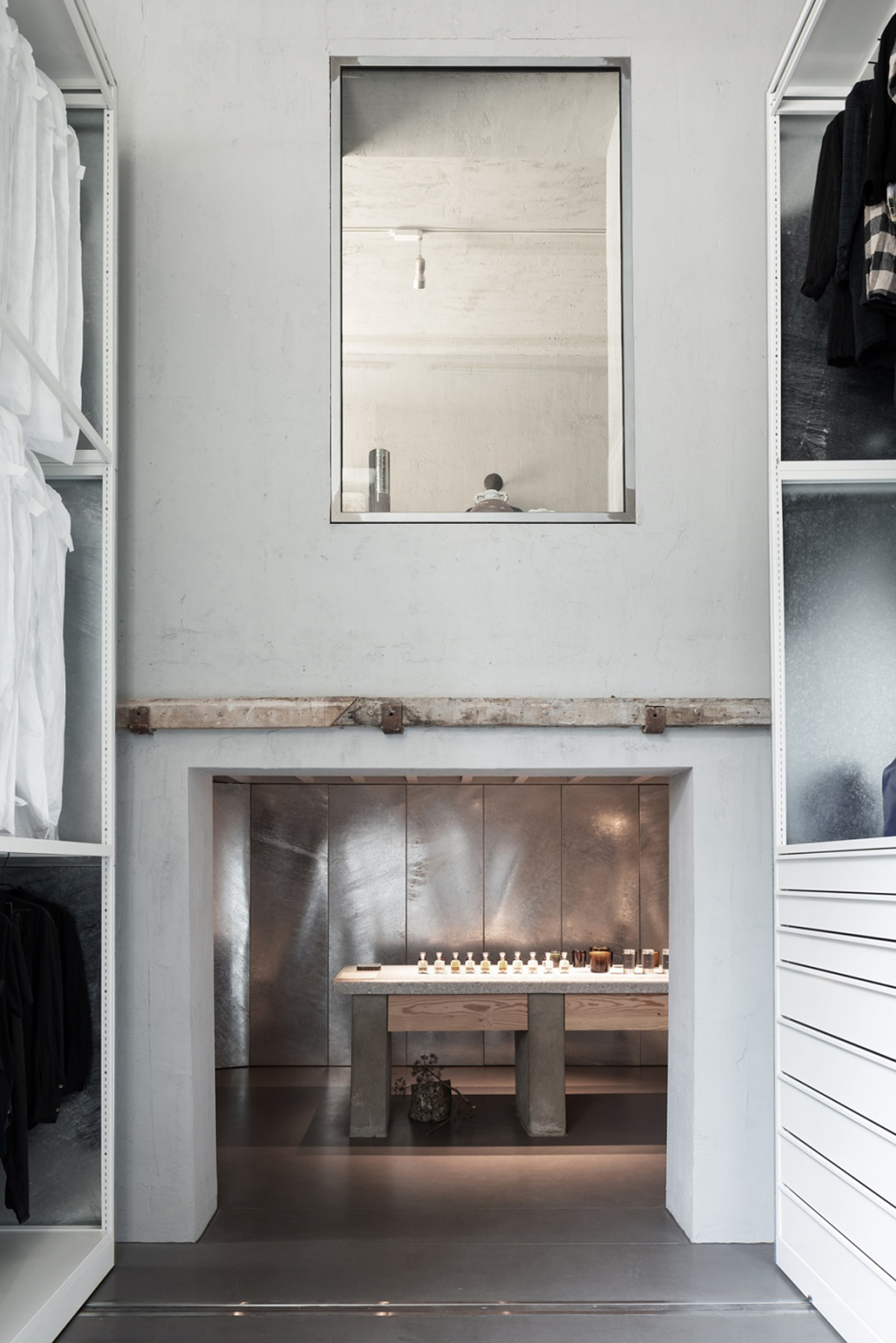 A double height basement archive conserves the distinctive clothing collections of Hostem. The growing collection eschews the commercial transience of fashion retail instead focussing on the preservation and cultural relevance of its unique works, archiving clothing amongst artefacts and art works. Large rolling storage units both seal and expose their contents.