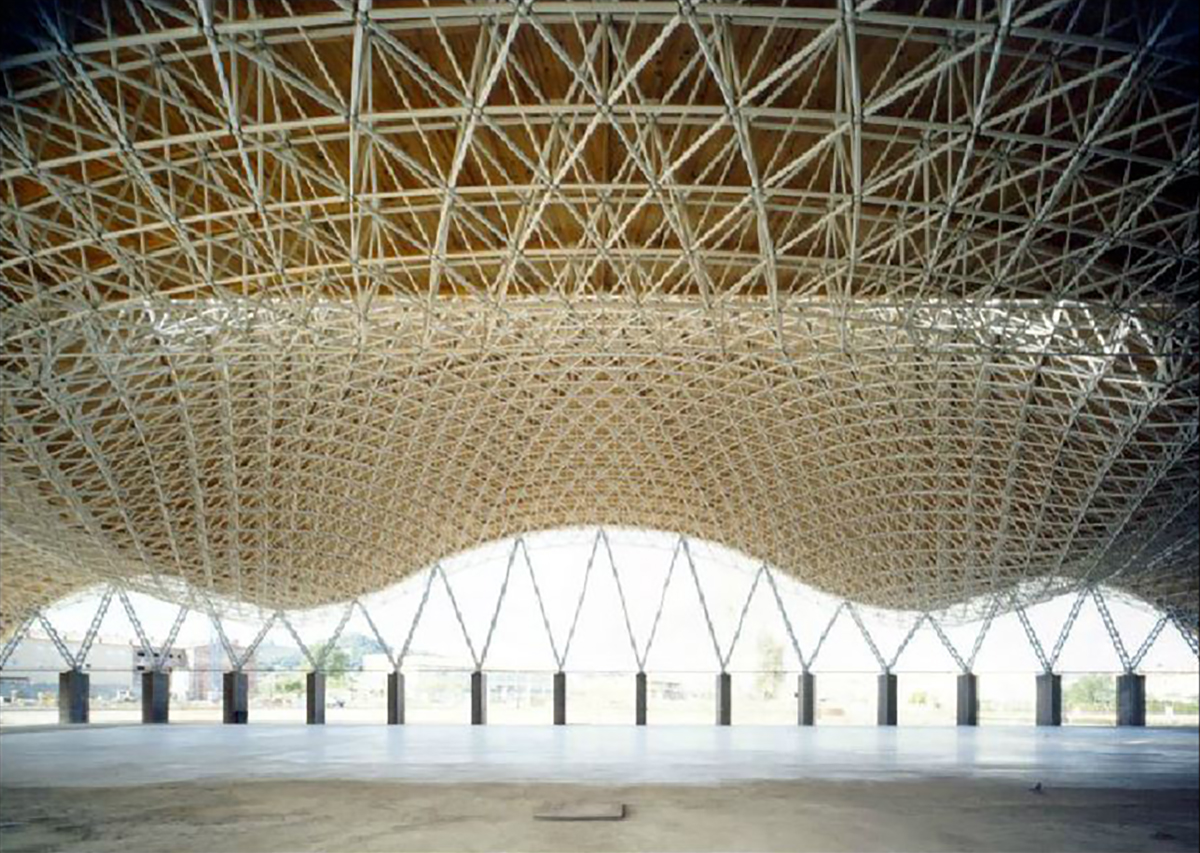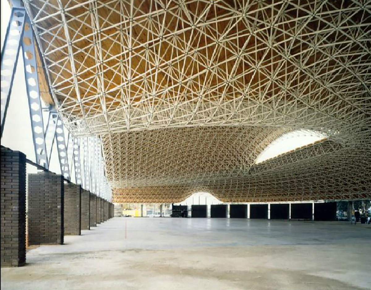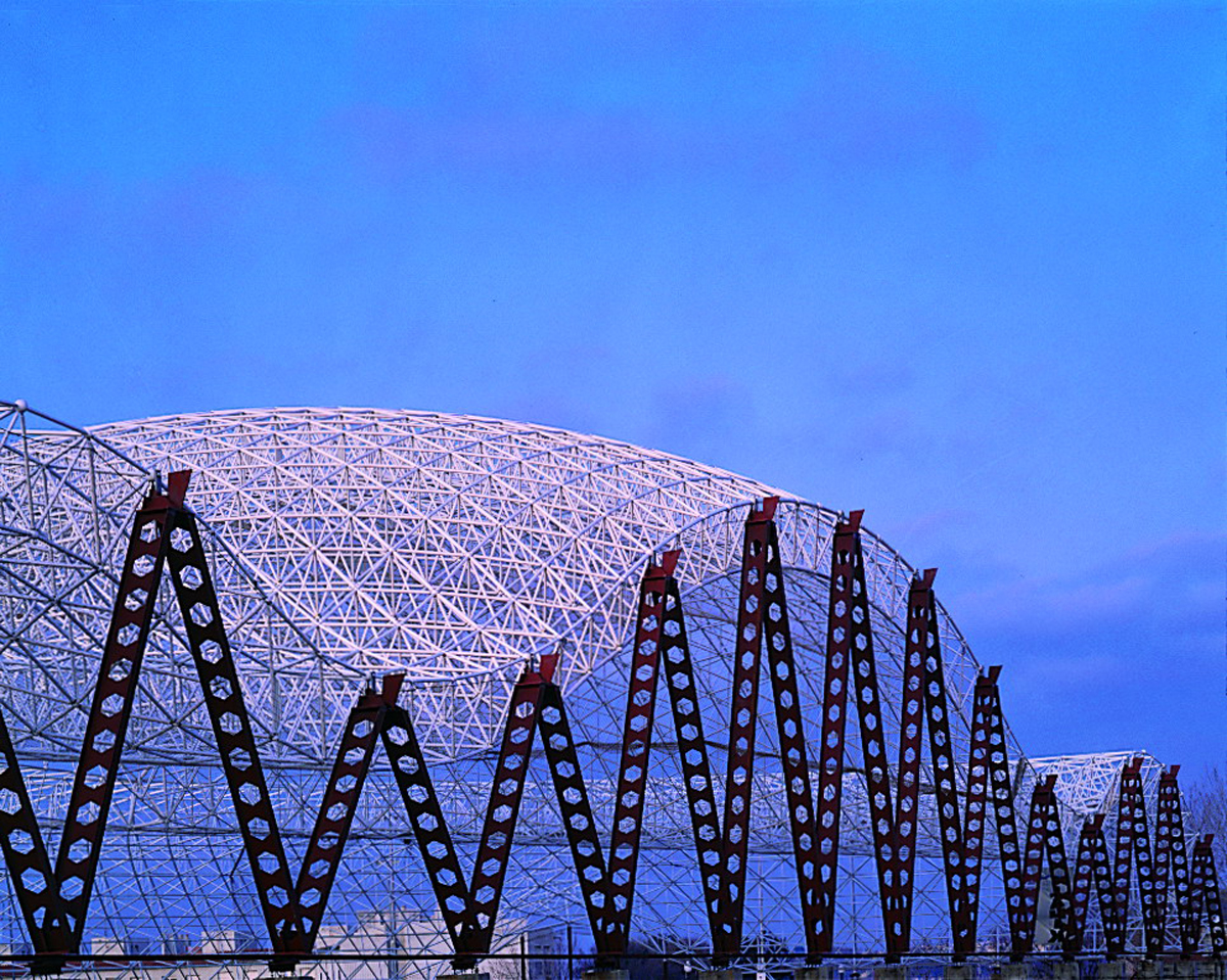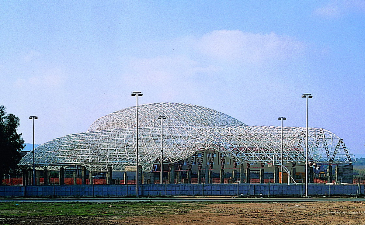 La malla espacial está compuesta por 1.717 nudos y 7.298 barras y está soportada por una estructura triangulada formada por columnas de acero apoyados sobre pilares de hormigón armado revestidos con ladrillo. La cúpula alcanza una altura máxima de 14 m.