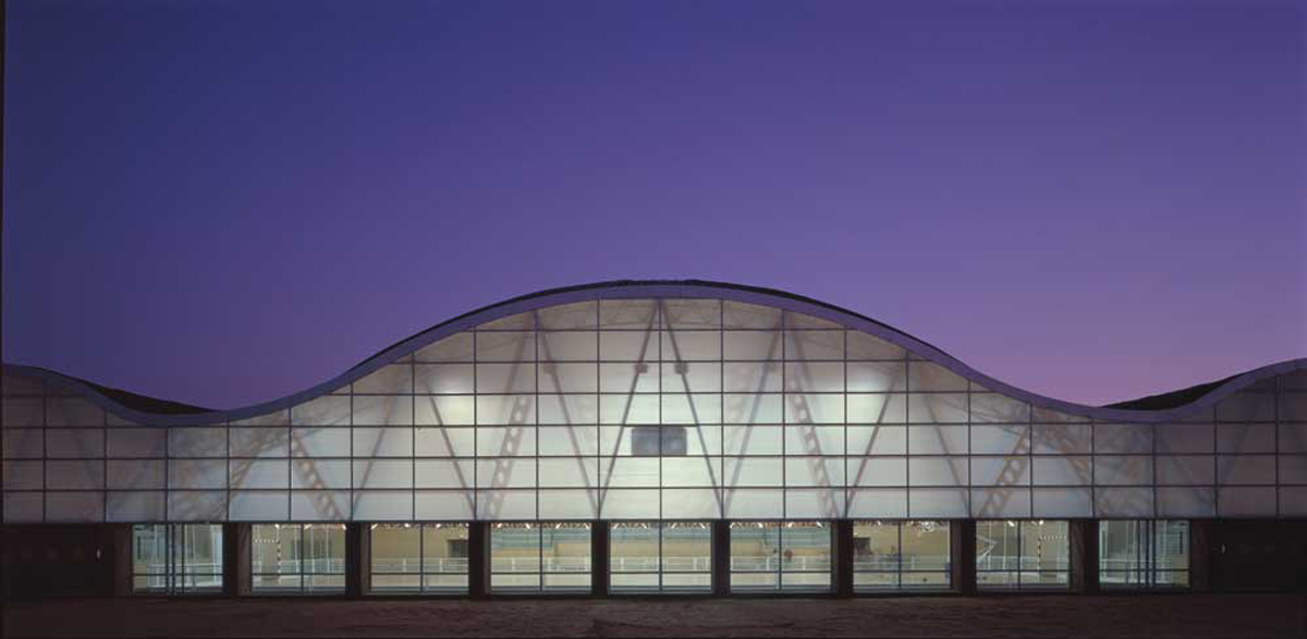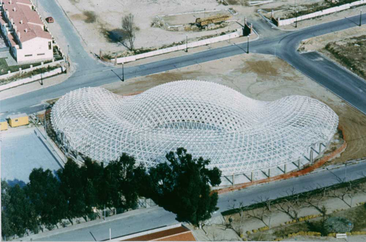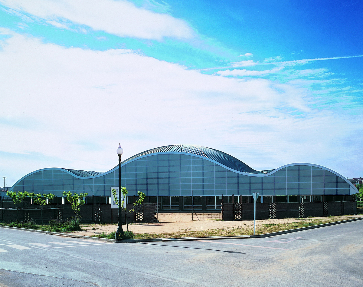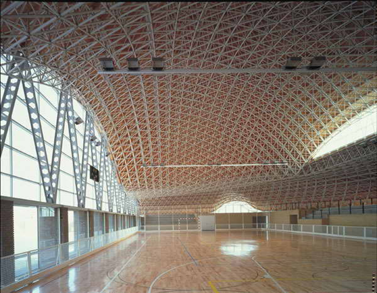 Se decidió delimitar el solar, prácticamente plano, con un muro circular de 67,5 m de diámetro y cubrir la mitad sur con una malla espacial, mientras que la mitad norte se dejó descubierta a modo de patio. La forma de la cubierta obedece a las dimensiones y volumen requeridos por las diferentes normativas deportivas así como el volumen necesario para la zona del público, la iluminación, etc.