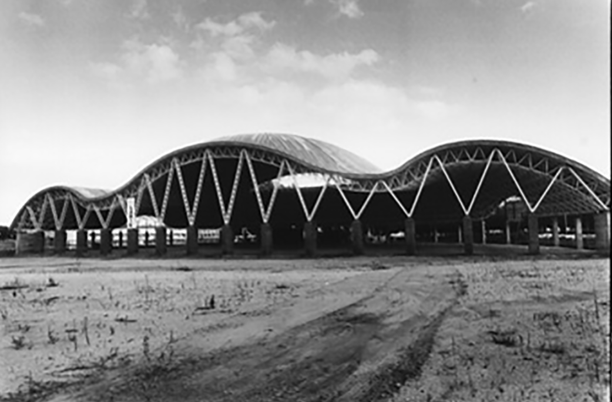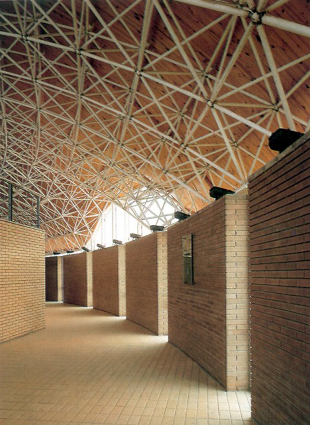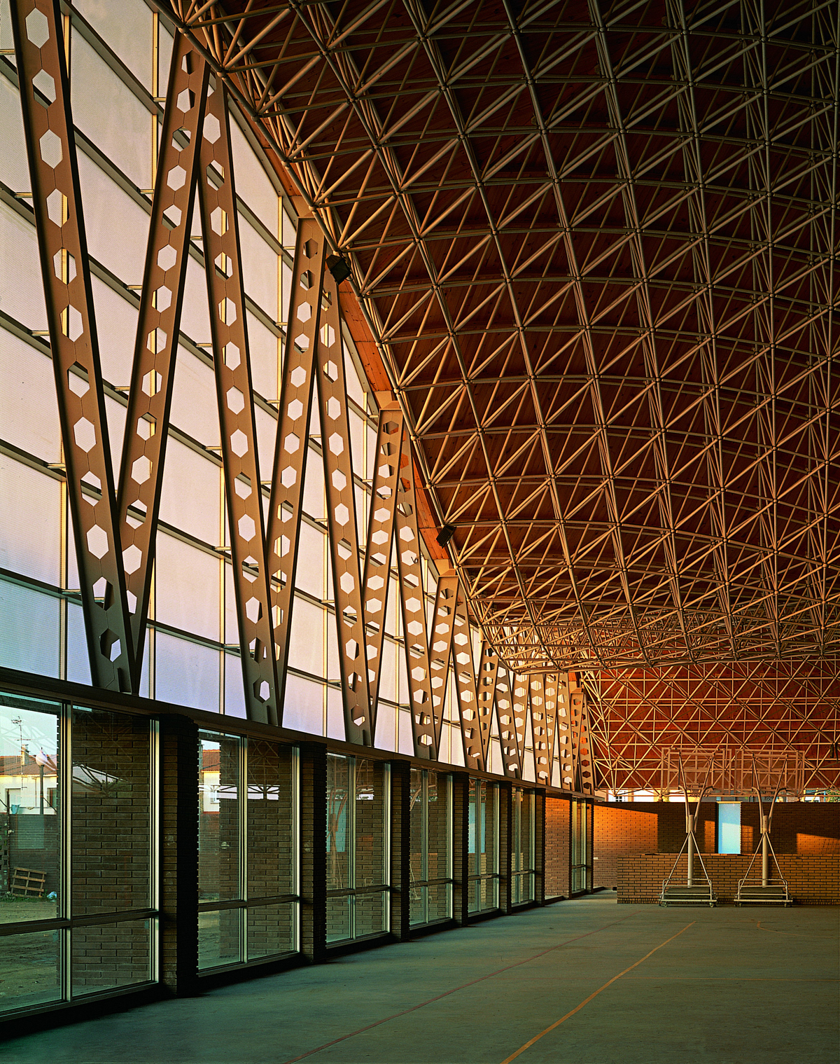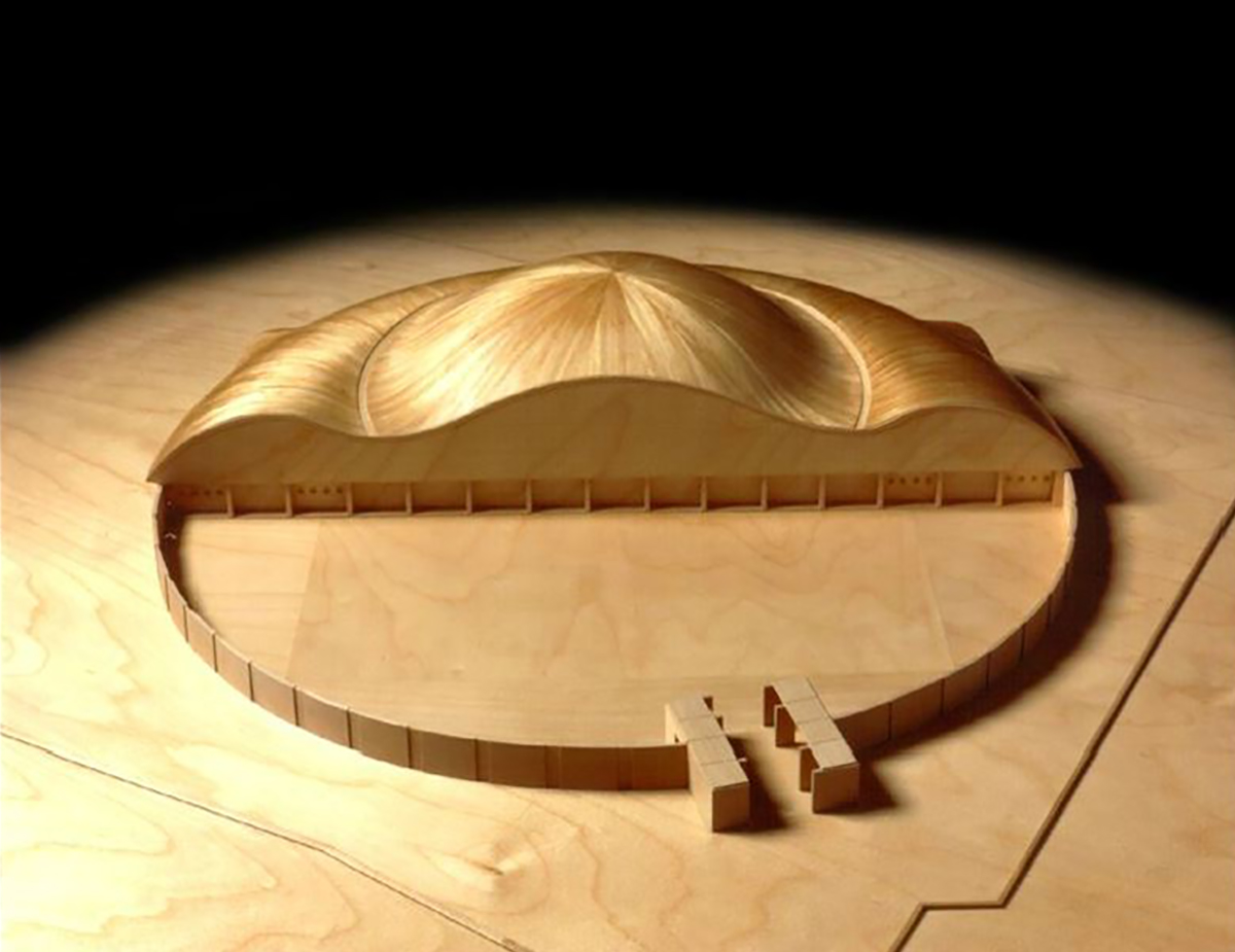 Se decidió delimitar el solar, prácticamente plano, con un muro circular de 67,5 m de diámetro y cubrir la mitad sur con una malla espacial, mientras que la mitad norte se dejó descubierta a modo de patio. La forma de la cubierta obedece a las dimensiones y volumen requeridos por las diferentes normativas deportivas así como el volumen necesario para la zona del público, la iluminación, etc.