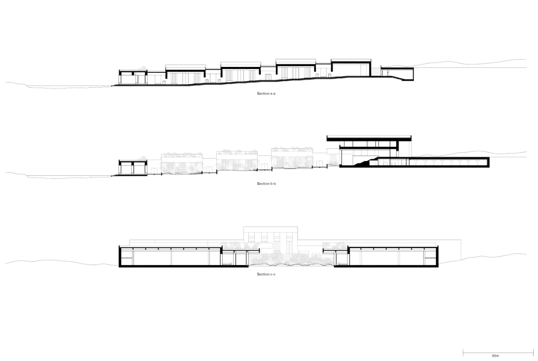 At the northernmost point, an entrance pavilion welcomes visitors and offers views over the central garden and landscape beyond. Located on either side of the garden, each exhibition hall can be accessed directly or in sequence following the stepped loggia. The southernmost pavilion, housing education facilities, faces out towards a lake at the lowest end of the site.