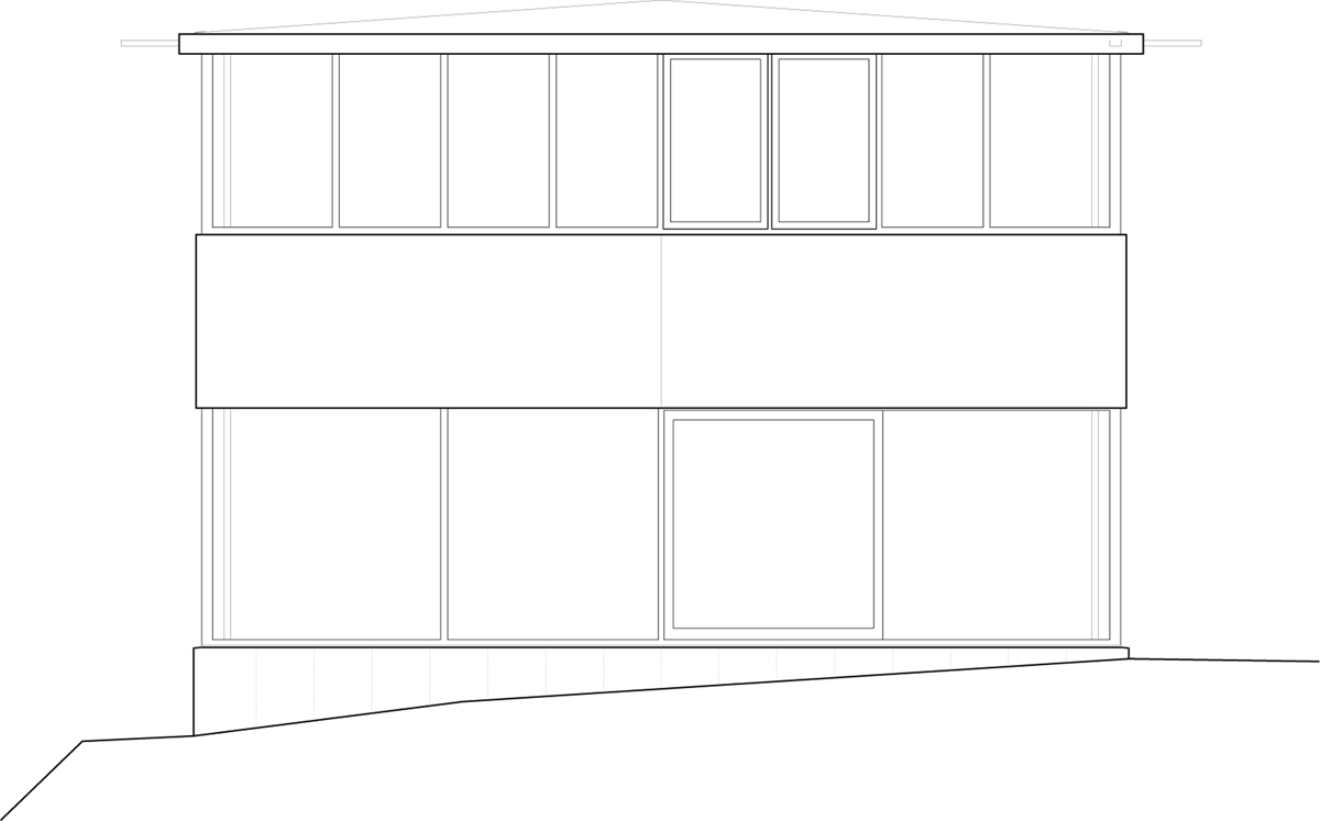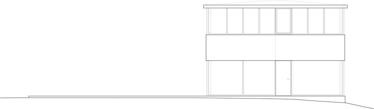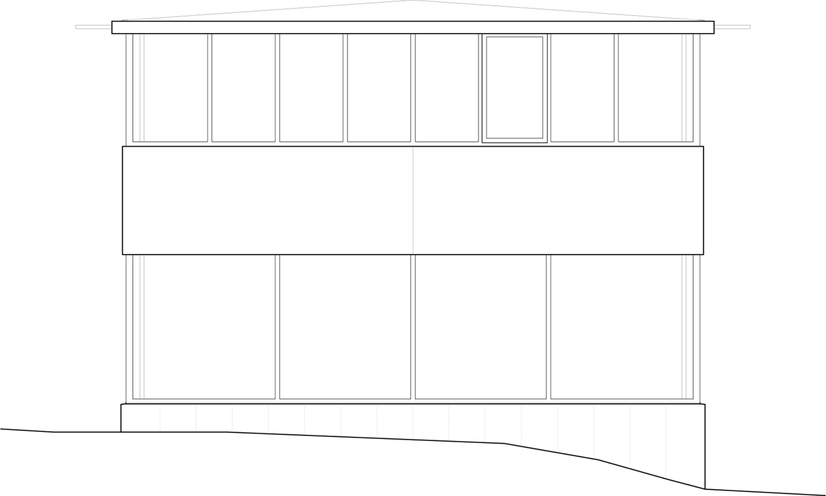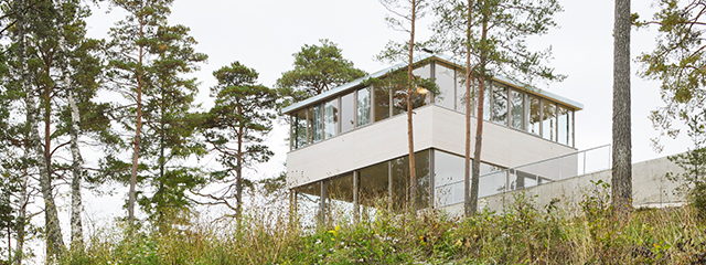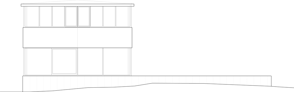 footprint of 9 x 9 meters was made by nine steel columns set on a 4,5 m module, cast into to the base. At six meters tall, the columns support the upper floor slab and roof. Glazing on the upper and lower floor are separated by a wooden facade constructed of prefabricated massive boards, stabilizing the structure. The ground floor has two large sliding doors opening to the terrace and natural surroundings. The upper floor, with a 90cm window sill, is encircled in windows to maximize views to the forest and sea. A thin sloped roof encloses the structure with hidden drainage, appearing only as a thin galvanized band from the ground.