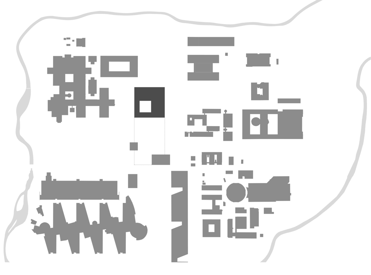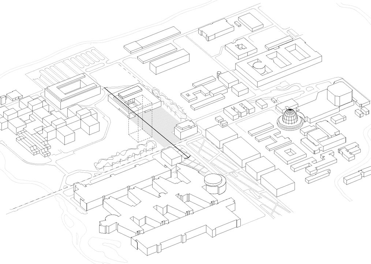 El diseño urbano debe entenderse como una respuesta a las estructuras existentes de Campus Garching: al igual que la masa del edificio, que se establece con referencia a la estructura de cuadrícula existente y los edificios existentes circundantes, el nuevo edificio está vinculado a su entorno inmediato y lo ubica en este inmueble. Con el desmantelamiento de la meseta existente del antiguo refectorio, continuamos construyendo el centro central hacia el norte y continuando. Esta medida conduce a un posicionamiento evidente de la estructura solitaria, que, después de la demolición de la antigua cafetería, se vuelve claramente visible y conciso desde el centro central.