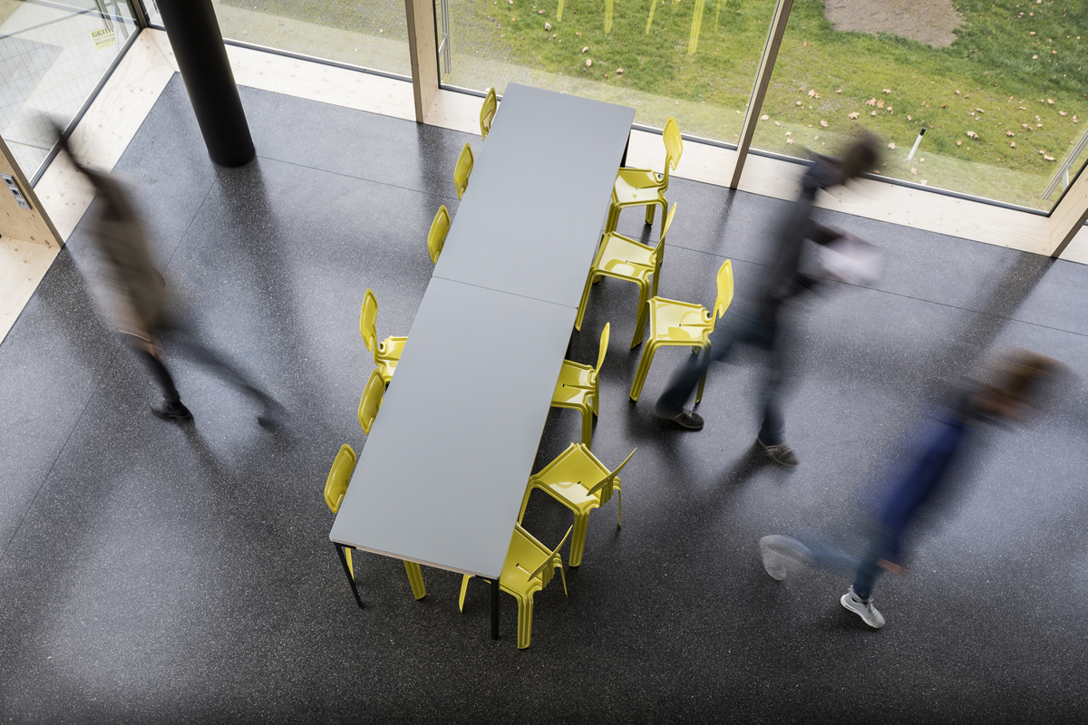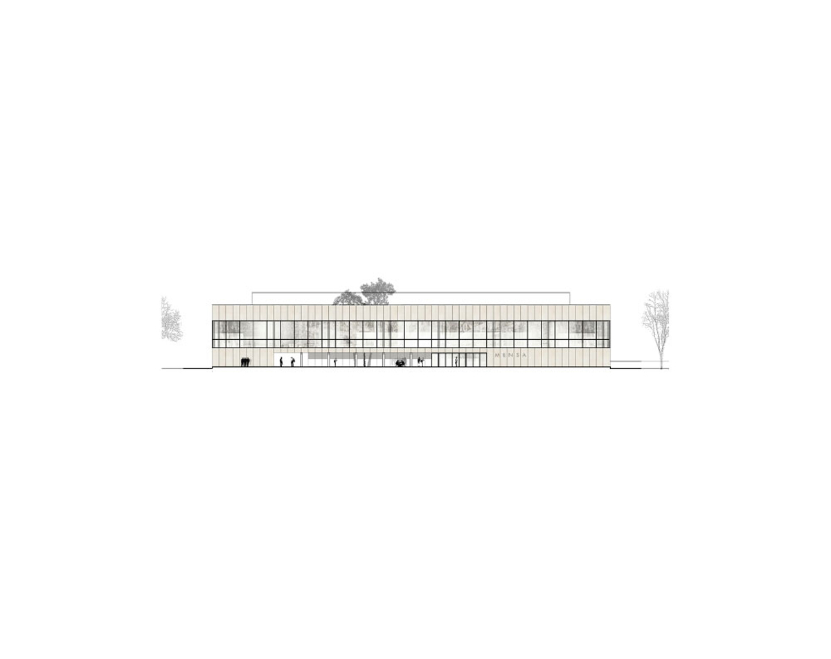 El paso del nuevo edificio de sur a norte responde al espacio abierto recién creado en el período previo al centro. De esta manera, los edificios existentes del instituto, así como los posibles nuevos edificios y la redensificación, que se encuentran en el norte de la nueva cantina, están muy bien conectados. La forma organizativa del cuadrado cumple la función interna y está tomada de la idea de una estructura solitaria sin dirección, que representa y encarna el “medio” tanto desde el exterior como en sí mismo. Evitamos conscientemente la formación de “partes traseras” poco atractivas.