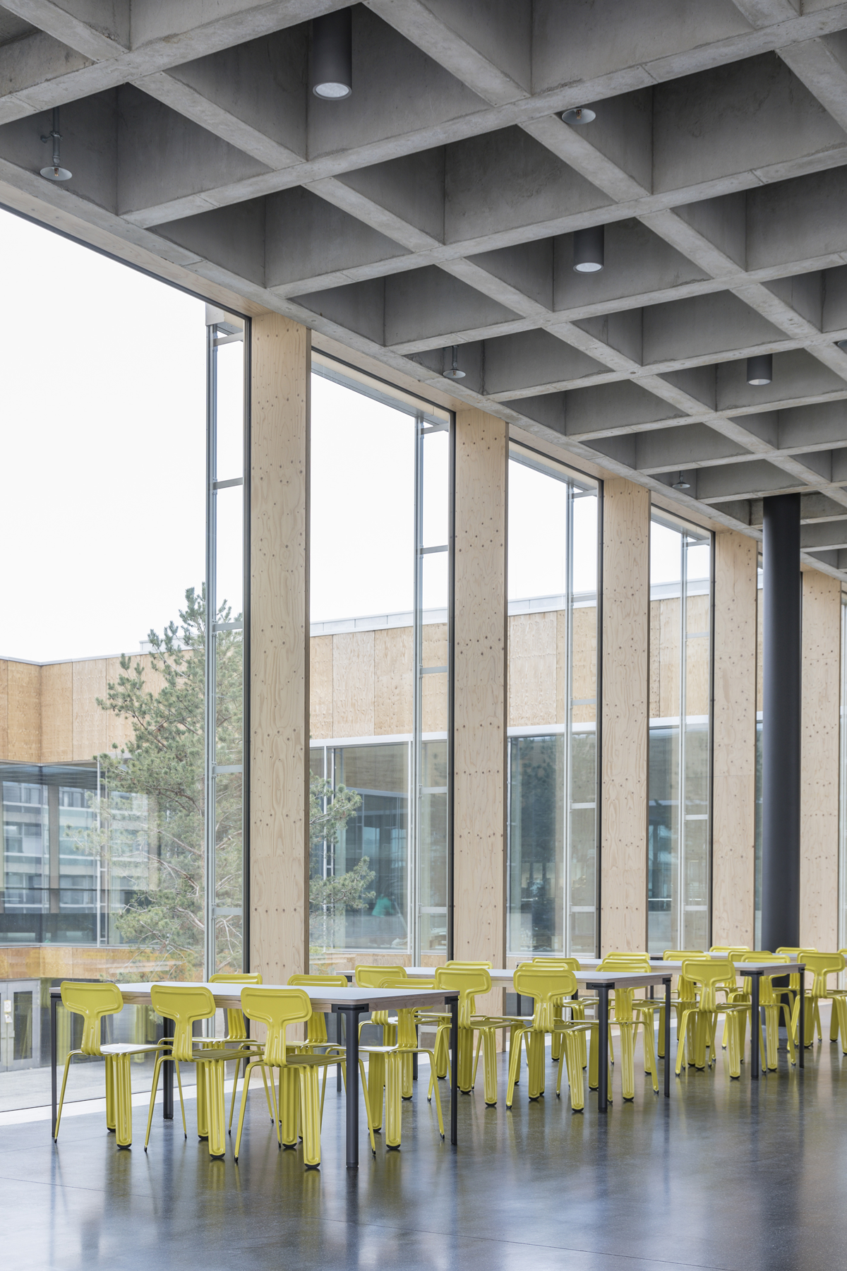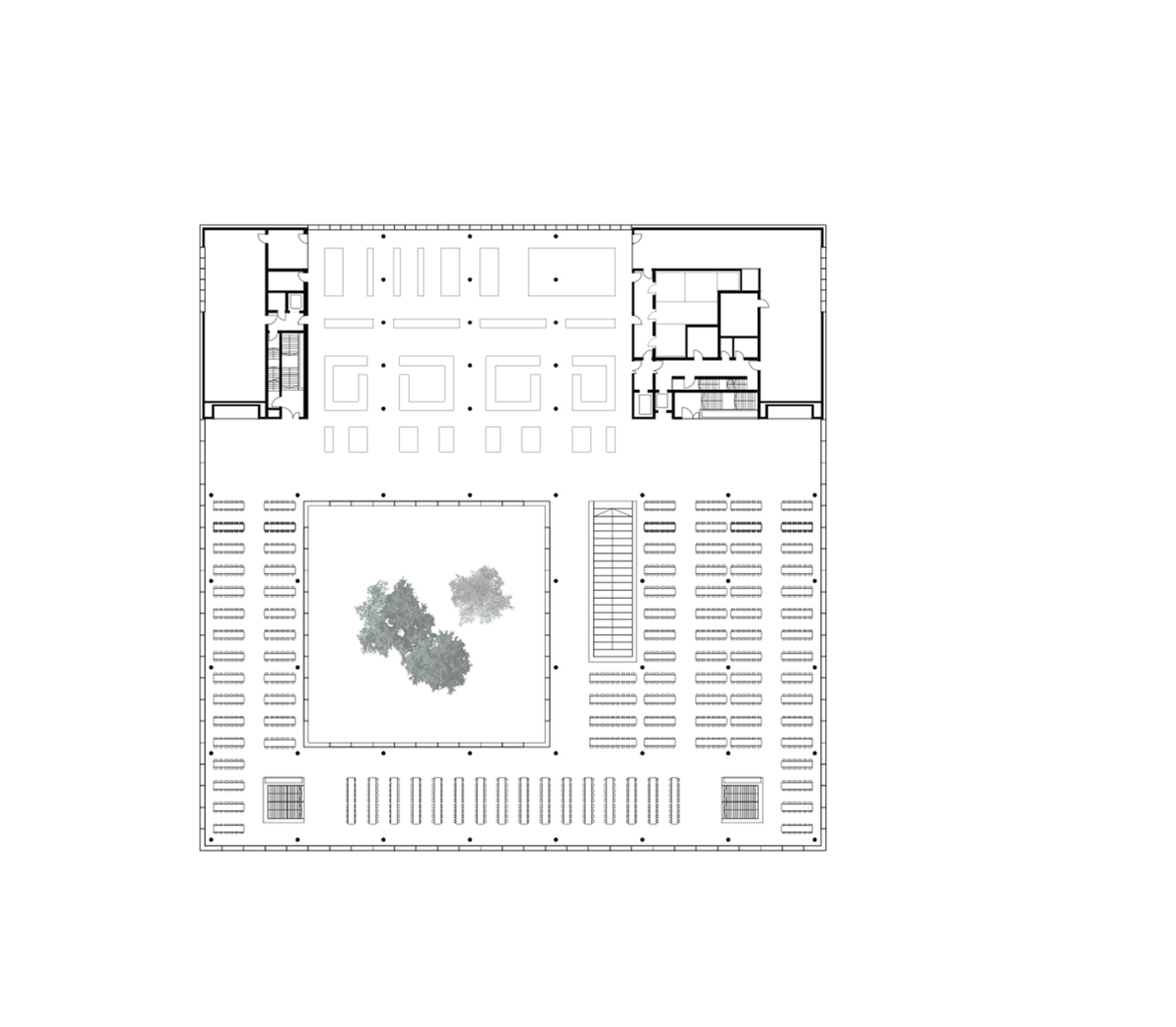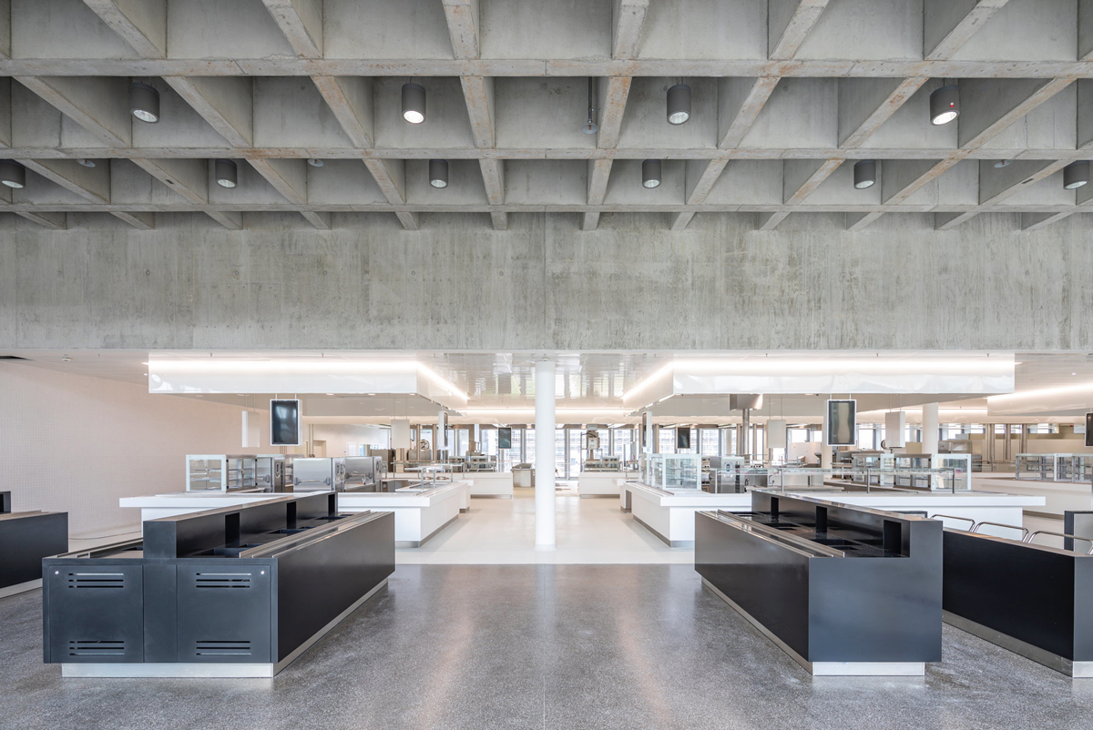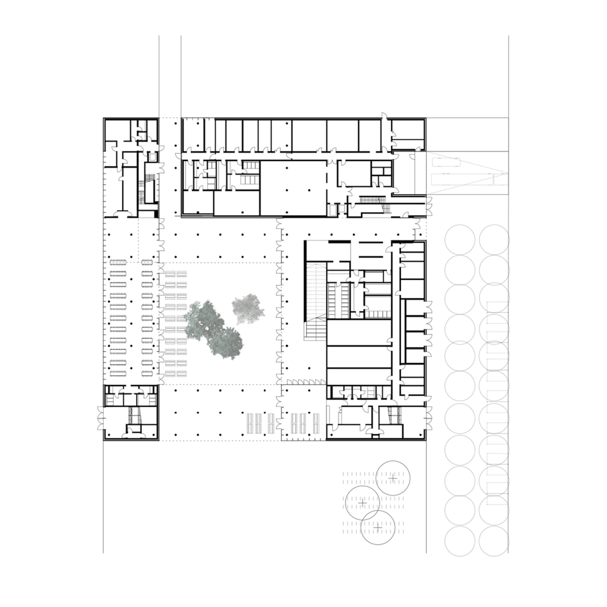 Se accede a las áreas individuales a través de un patio, un punto de encuentro central como un ‘ágora’ que une funciones. Sirve como un espacio abierto para la cafetería y es un lugar de encuentro y comunicación. El vestíbulo, como una extensión espacial del “ágora”, alberga el acceso vertical que une la base y el comedor. En la base, las áreas públicas se agrupan alrededor del “Ágora”.