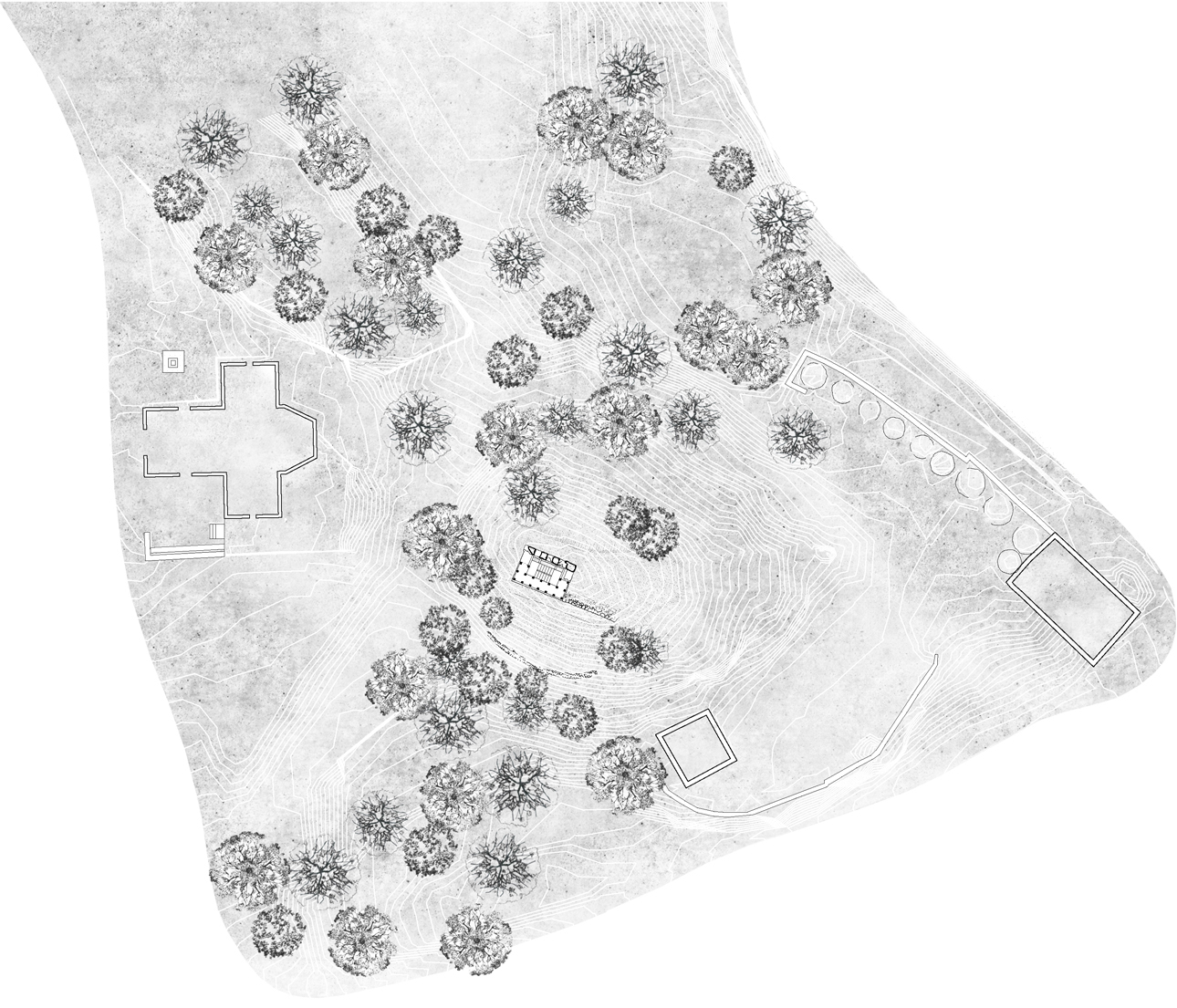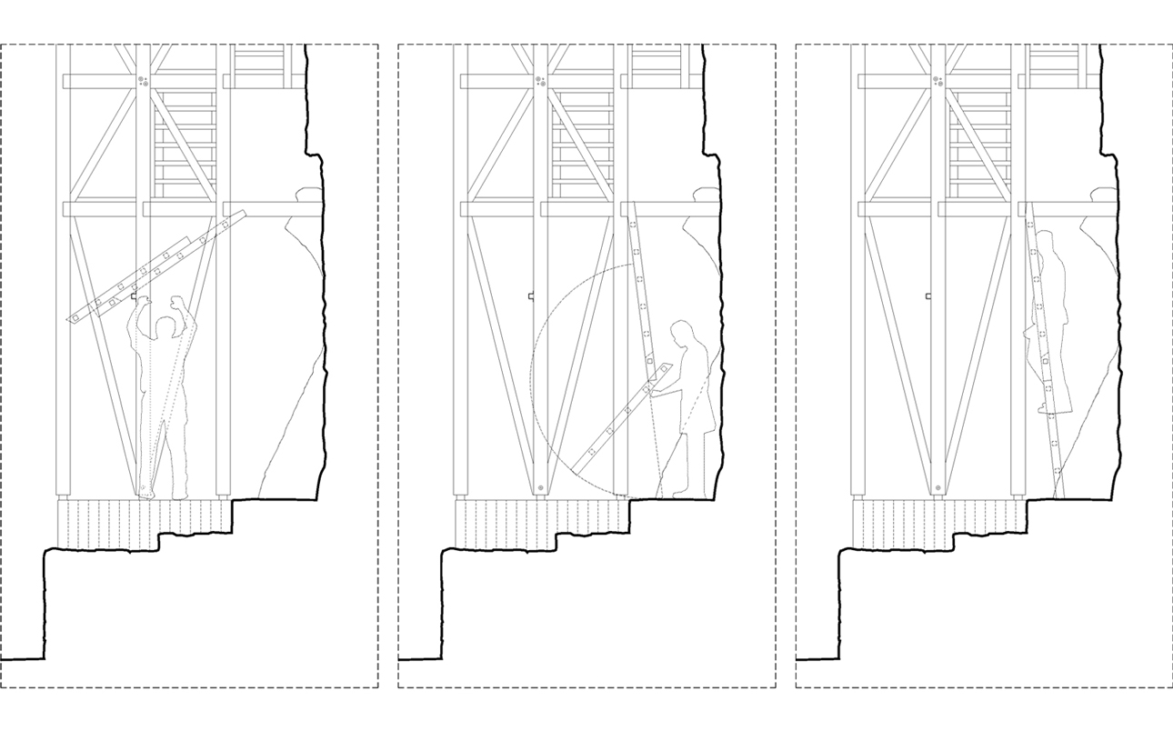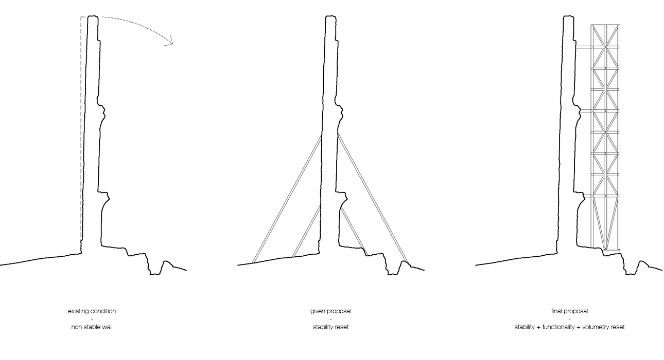 perimeter of the stone wall. Like scaffolding, it structurally stabilizes the pre-existing
