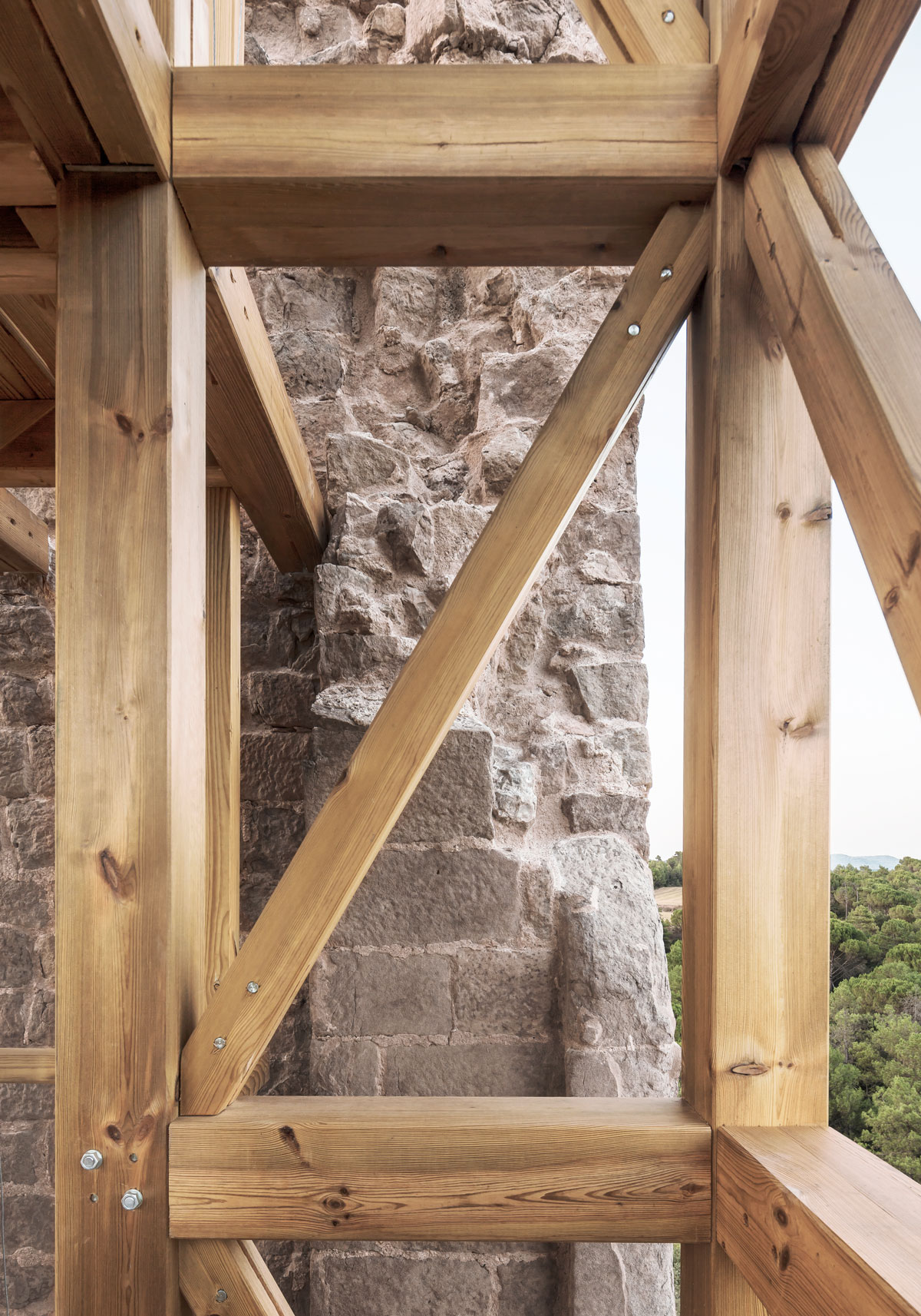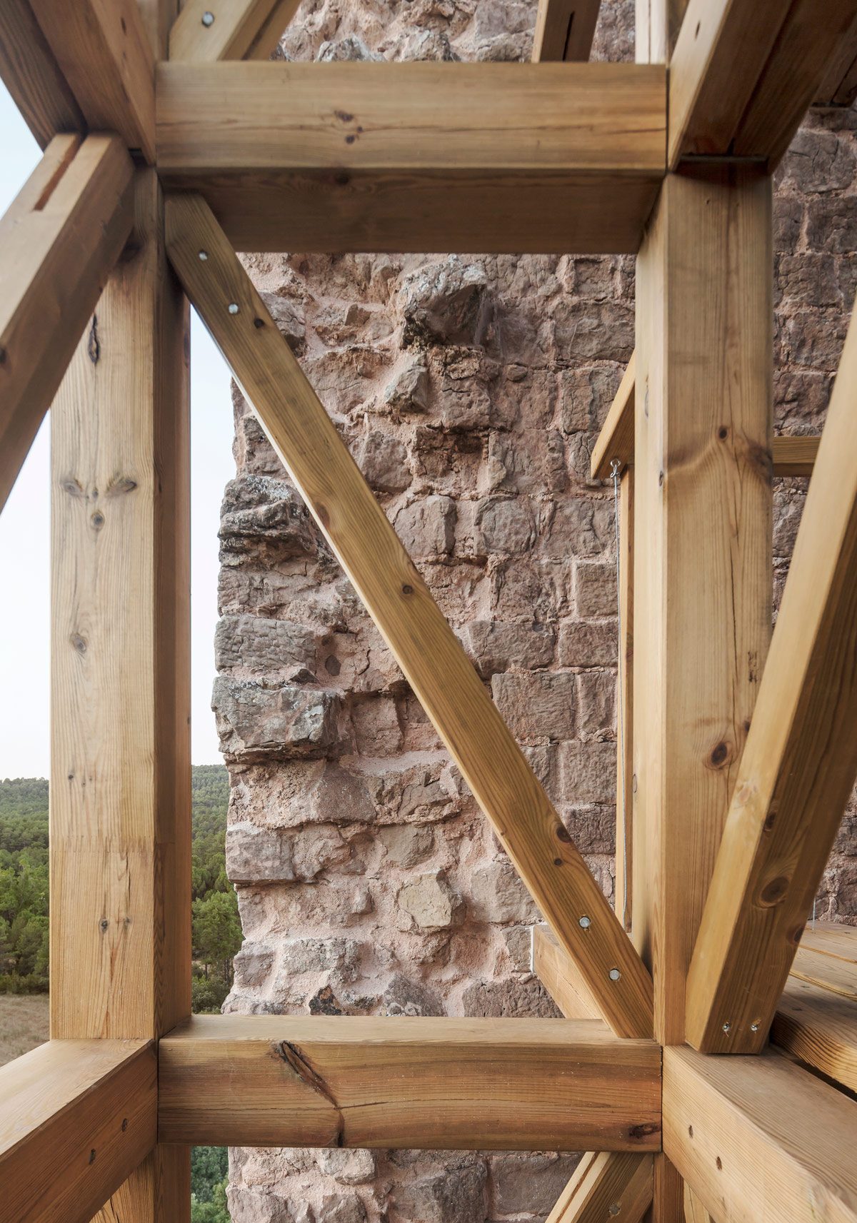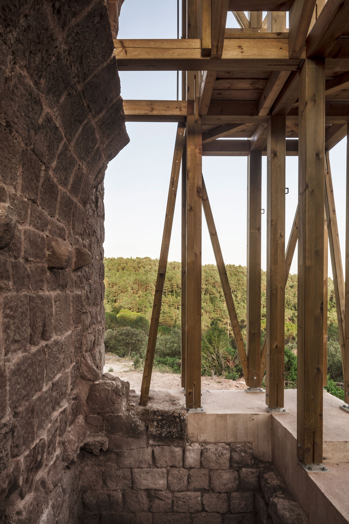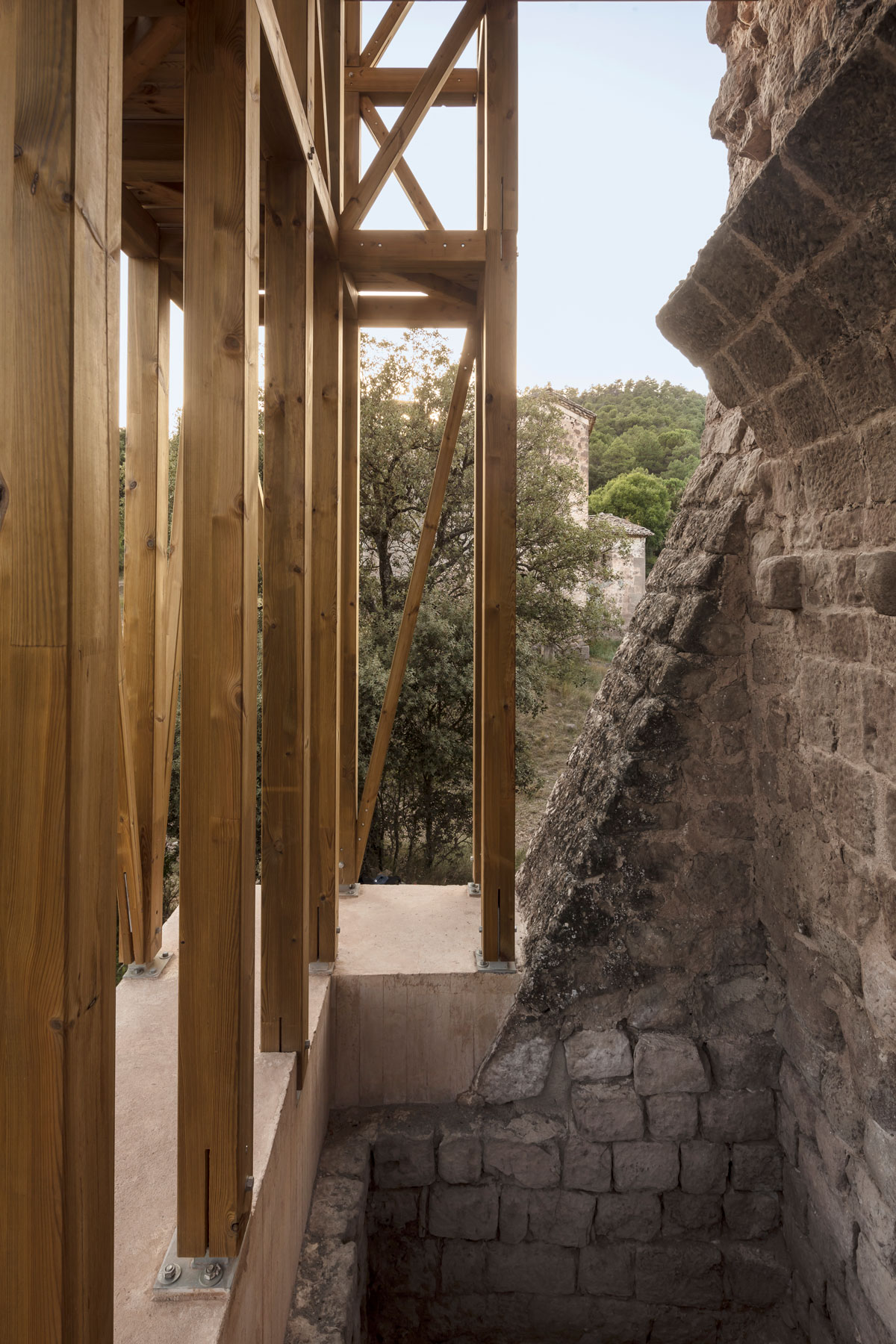 Una intervenció tant potent com simple, amb una qüestió interessant: la pedra inerta, és el patrimoni a mantenir i la fusta viva, la nova intervenció.