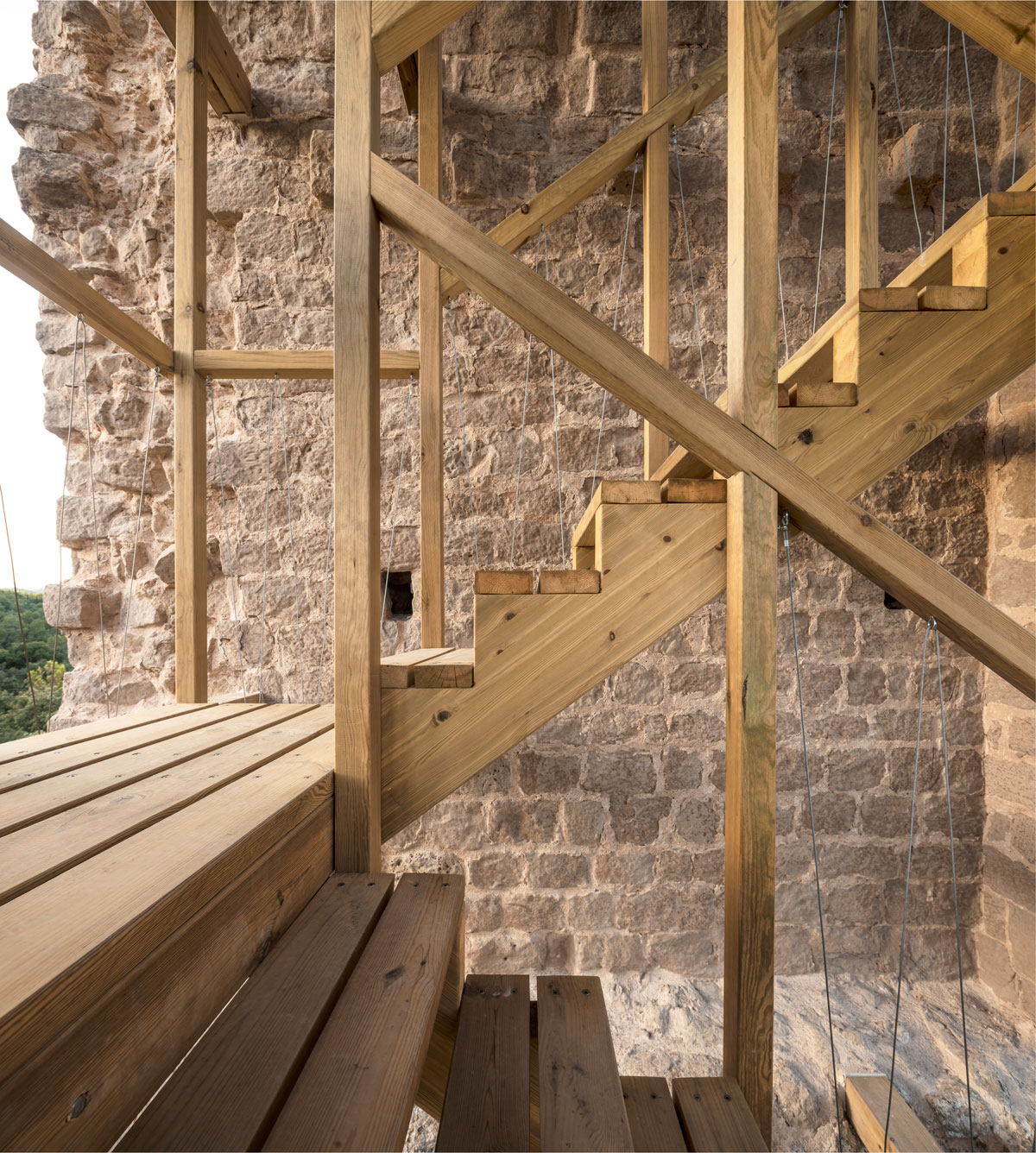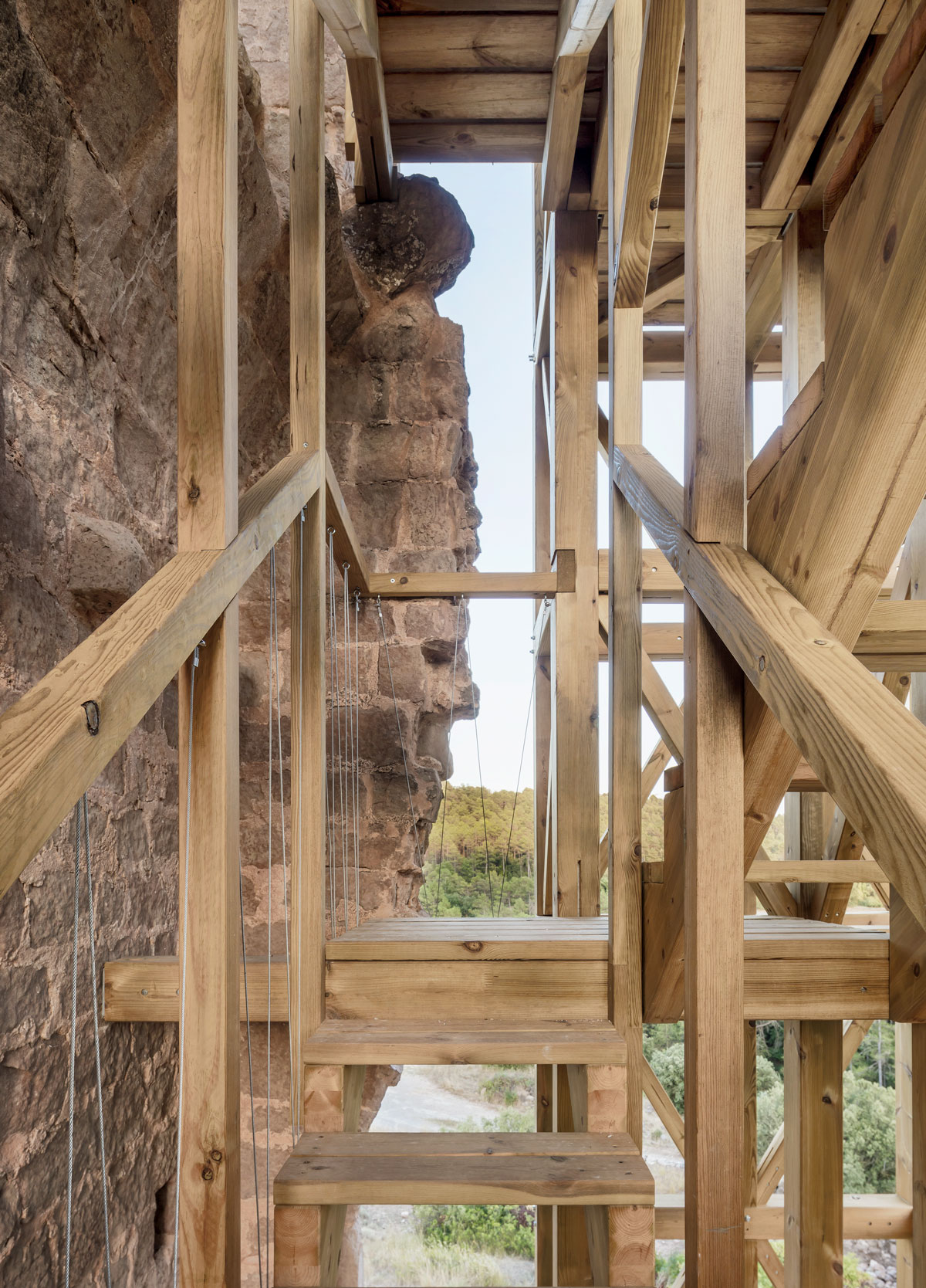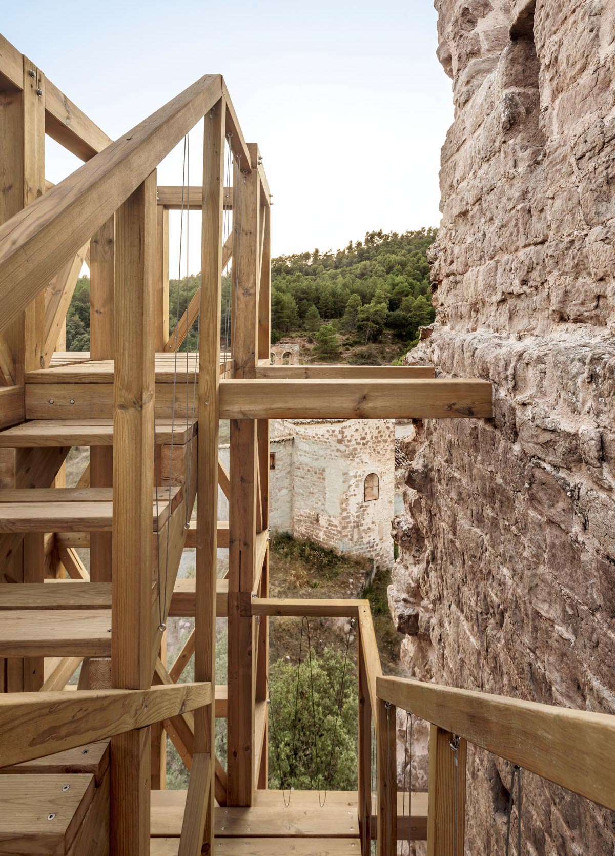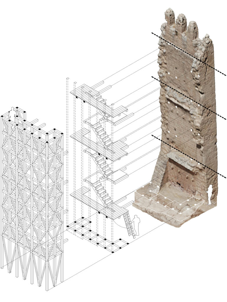The insertion of a stairway inside the structure provides access to the three original levels of