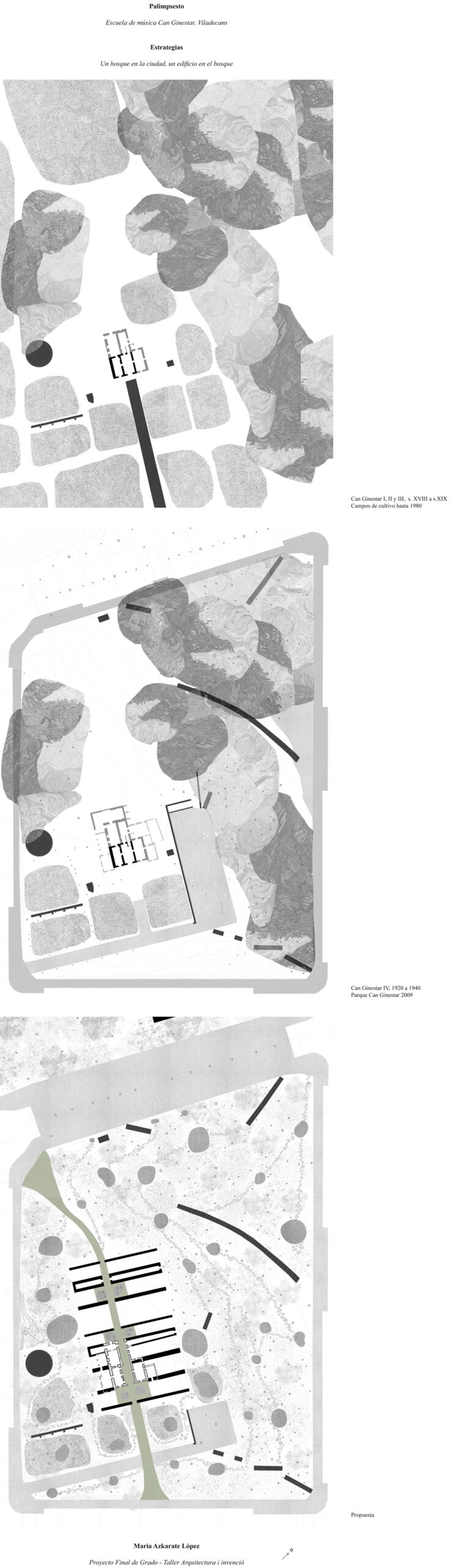 La Masía fue creciendo a lo largo de su vida útil por ampliaciones, según sus campos de cultivo iban haciéndose más numerosos. Actuaciones que acaban convirtiéndola en un palimpsesto, al igual que el lugar donde se sitúa. El proyecto quiere ser la siguiente actuación en la evolución arquitectónica de la masía. Un todo, resultado de la suma de partes, que vas descubriendo conforme recorres el edificio. En ese sentido la intención es conservar la masía, no como un objeto museístico si no generando nuevas relaciones espaciales entre ella y la nueva actuación, difuminando el límite entre ellas.