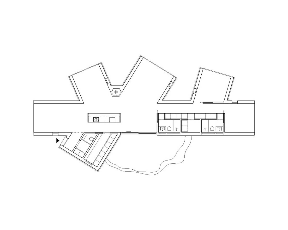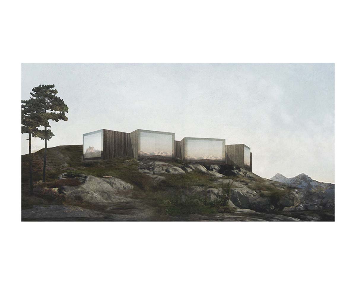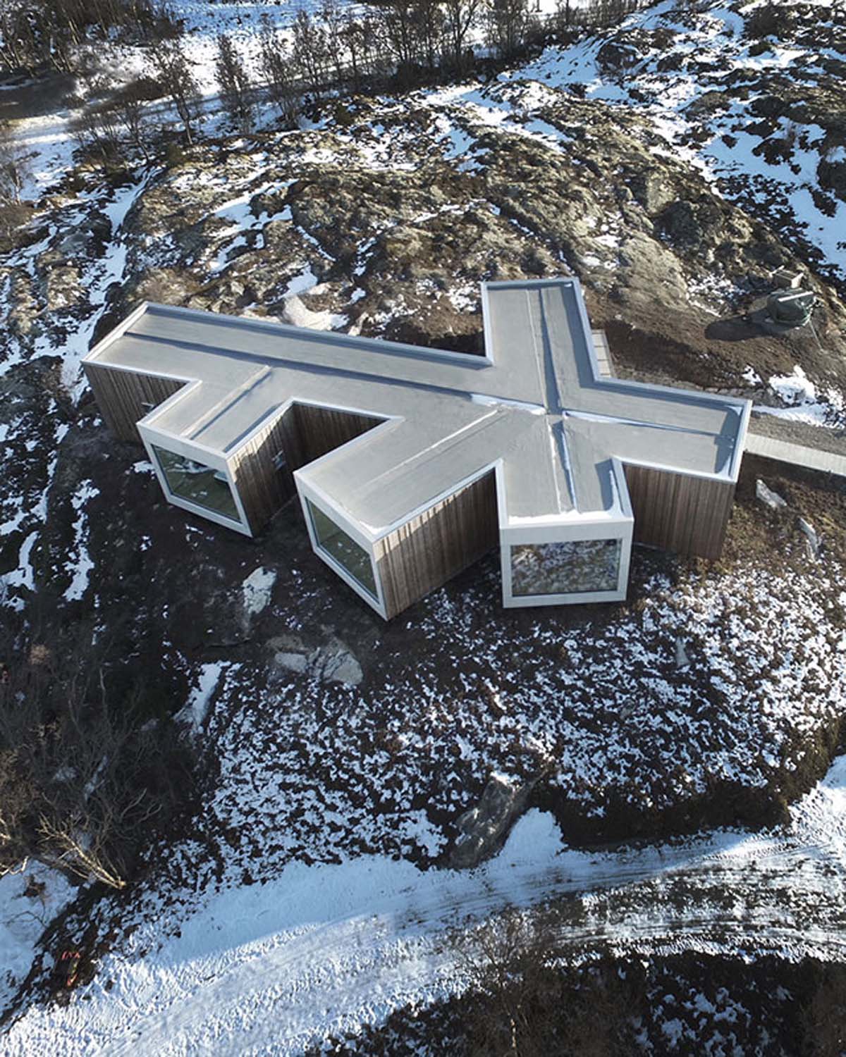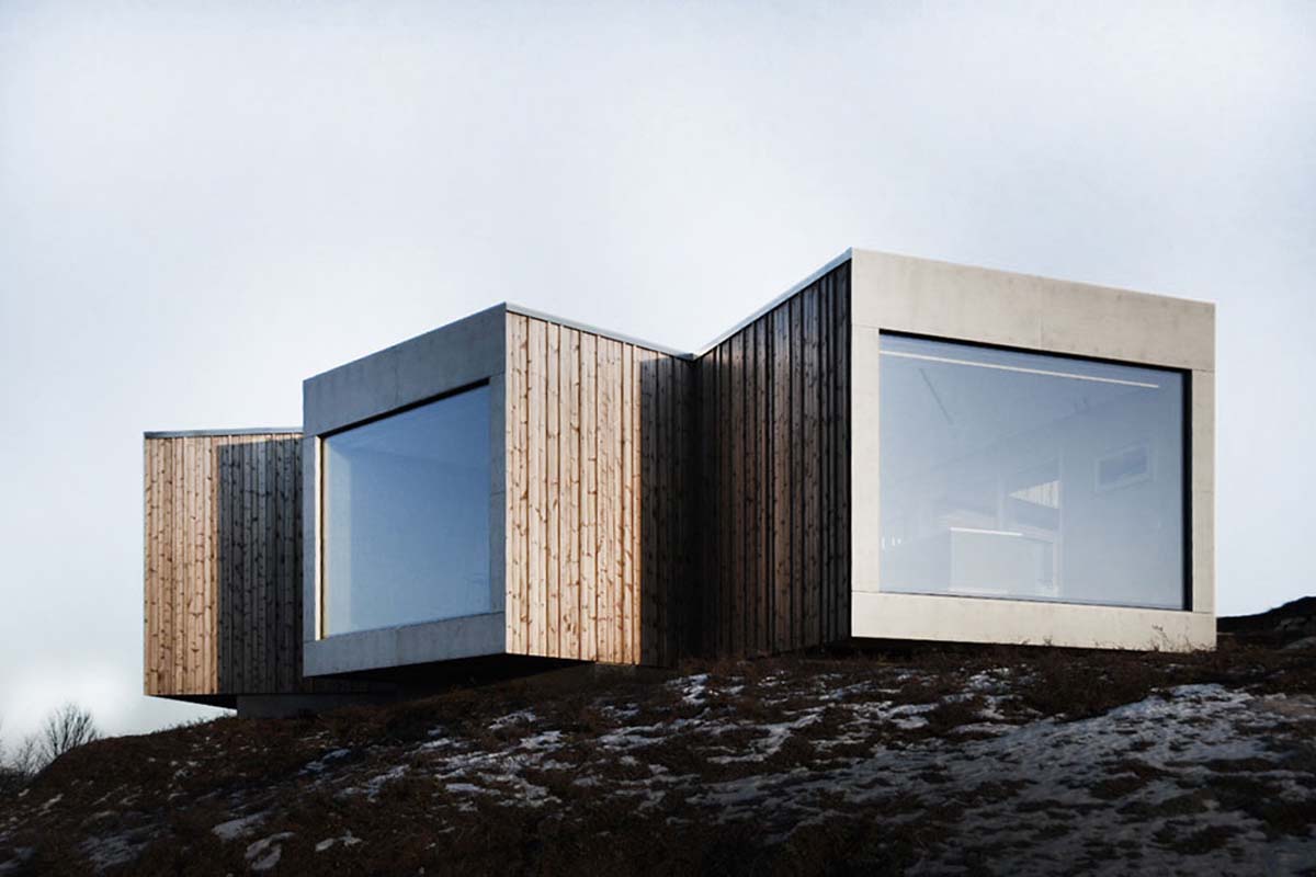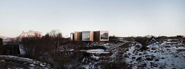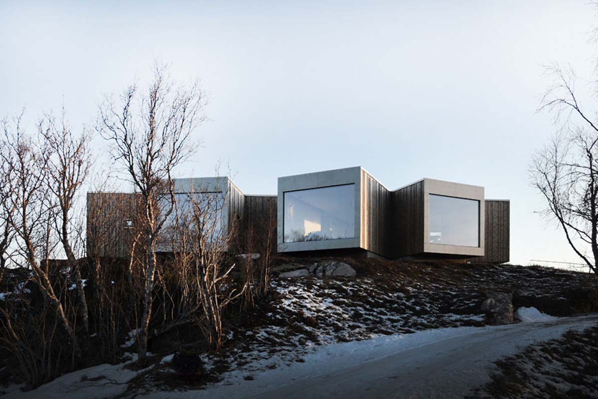 This project is located in northern Norway on a rocky, coastal landscape, situated just above sea level. Both houses comprise living rooms and bedrooms for the owners, and a spa and guest area. The spaces echo the shape of a branch or root system and create an organic link to the rocky, mossy ground. The panoramic view towards Lofoten and the lush scenery of mountains and fjords is captured in individual, specifically oriented picture windows.