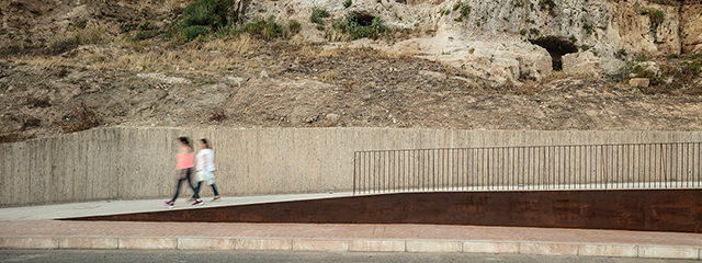 Para la puesta en valor del Caño de Hierro se propone un paseo peatonal, que parte de la carretera de acceso al pueblo y que culmina en la mayor de las cuevas, la Cueva de las Carretas. El paseo debe salvar los nueve metros en altura y el margen en superficie para resolver el ascenso es limitado. Se trazan seis muros de contención, seis cortes en el terreno, de los cuales resulta el paseo peatonal, un trazado geométrico que resuelve el ascenso y la transición de una vía rodada a un entorno natural, agreste.