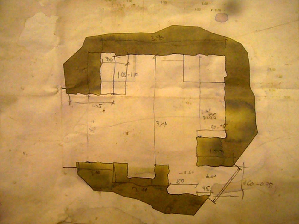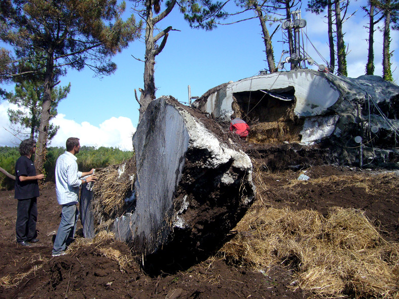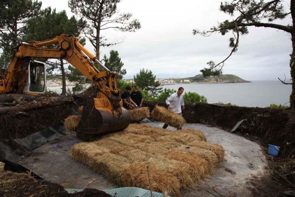 Se hizo un agujero en el terreno con tierra vegetal sin consistencia mecánica, un dique de contención. Luego, materializamos el aire construyendo un volumen con fardos de paja e inundamos el espacio entre la tierra y el aire construido para solidificarlo. El hormigón en masa vertido envolvió el aire y se protegió de tierra. Pasó el tiempo y retiramos la tierra descubriendo una masa amorfa.