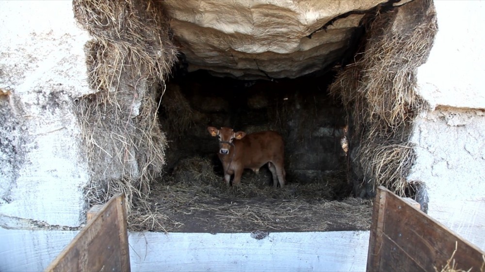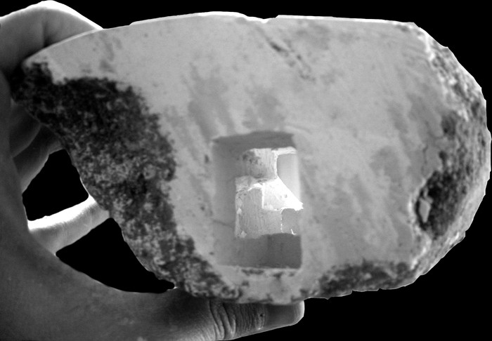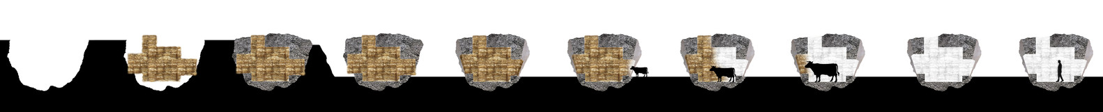 Con maquinaria de cantera hicimos unos cortes para explorar su núcleo y descubrimos la masa de su interior construida con paja, ahora comprimida por la presión hidrostática que ejerció el hormigón sobre la endeble estructura vegetal. Para vaciar el interior, llegó la ternera Paulina, que disfrutó de 50m3 de su más rico alimento, del que se nutrió durante un año hasta que abandonó su hábitat, ya adulta y pesando 300 kilos. Se había comido el volumen interior, y aparecía el espacio por primera vez, restaurando la condición arquitectónica de la trufa tras haber sido cobijo del animal y de la masa vegetal durante un tiempo largo.