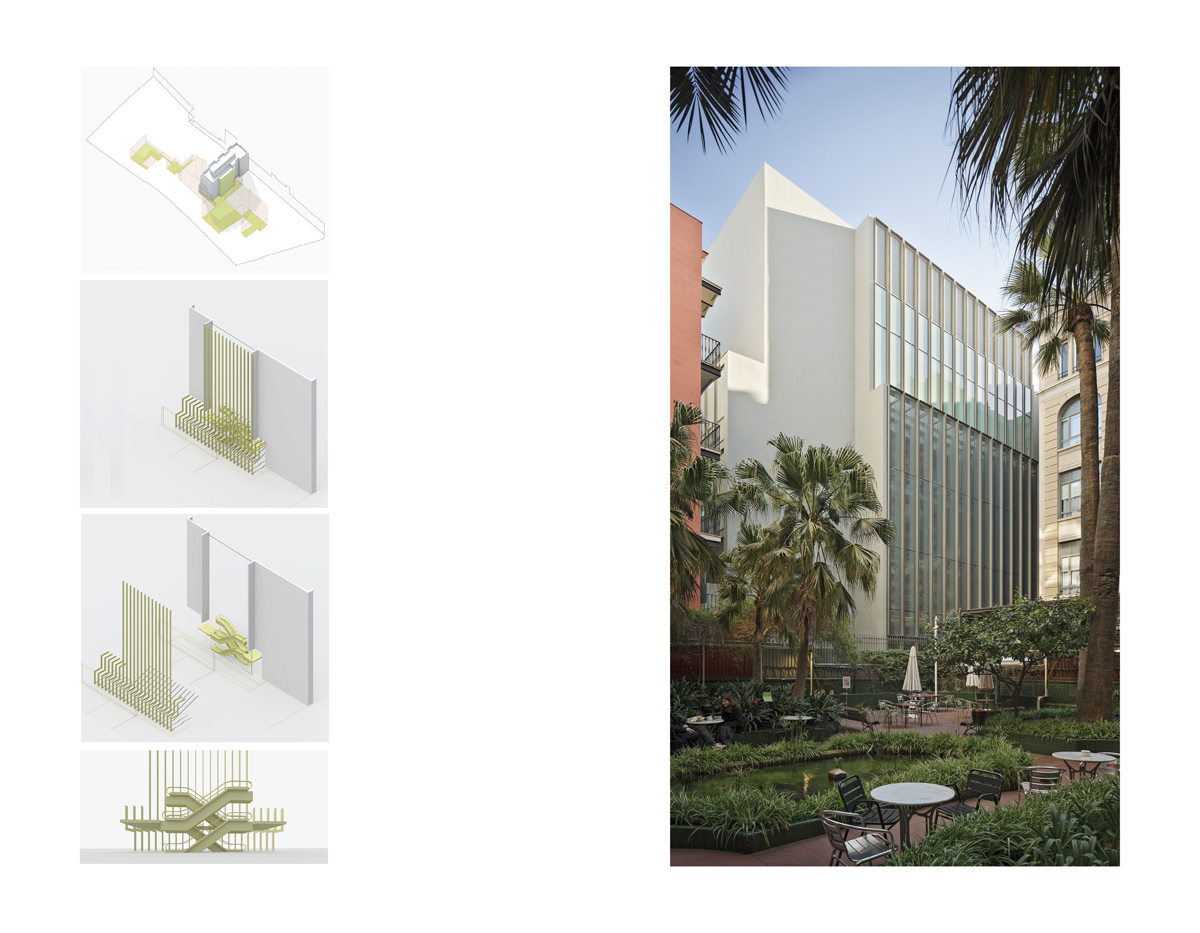 Por último, el proyecto reduce el volumen del edificio inicial en las plantas superiores, cuarta y quinta, para ceder al jardín del Ateneu una mayor cantidad de aire, luz y visión, ayudando así a esponjar la ciudad.