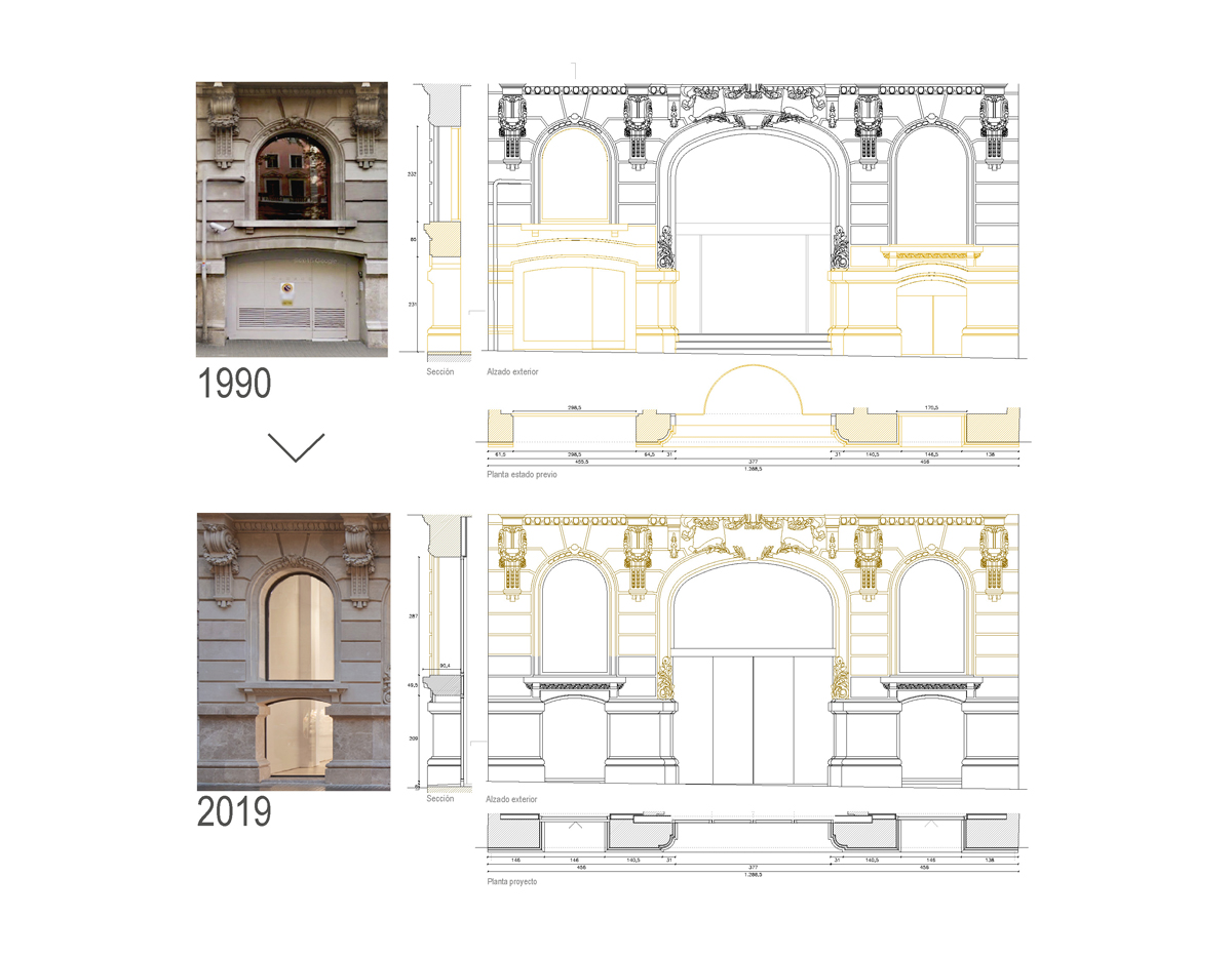 Para adaptar la planta baja a un uso público y accesible, se han eliminado los escalones del vestíbulo y la rampa de acceso al sótano. Se ha substituido el forjado de planta baja, inicialmente a la cota +1,40m, por un nuevo forjado a la cota ±0,00m. Esto ha supuesto el desmontaje, restauración y restitución del vestíbulo de mármol del acceso, y la construcción de un nuevo basamento.