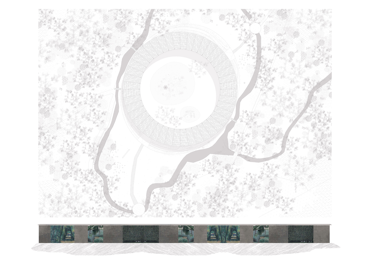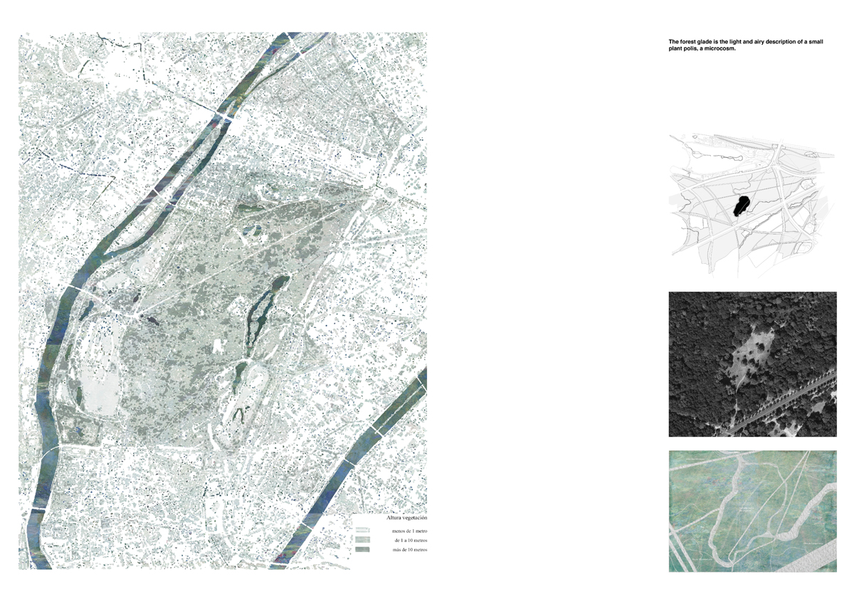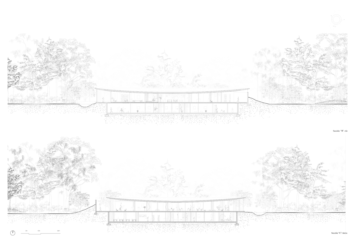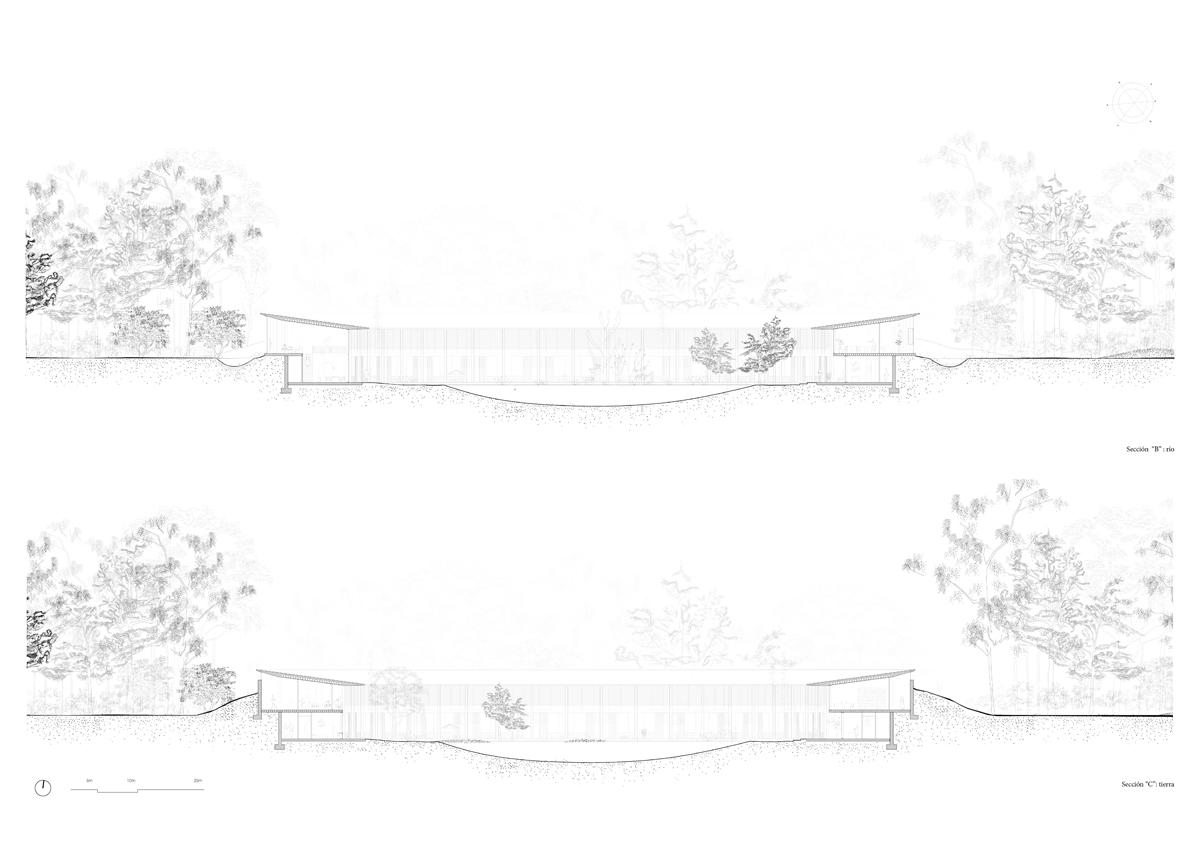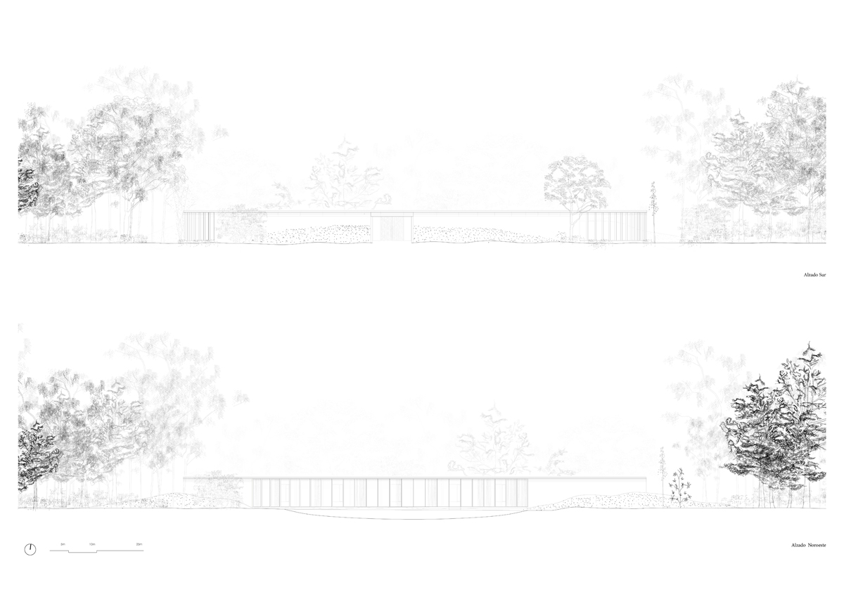 Volume appears occupying the invisible strip that separates the density of the forest and the void from the clearing: light. How can we achieve an atmosphere and a space of pleasure without generating a fence? The architecture will become a great intermediate space, connecting atmospheres. A ring, a space without references.