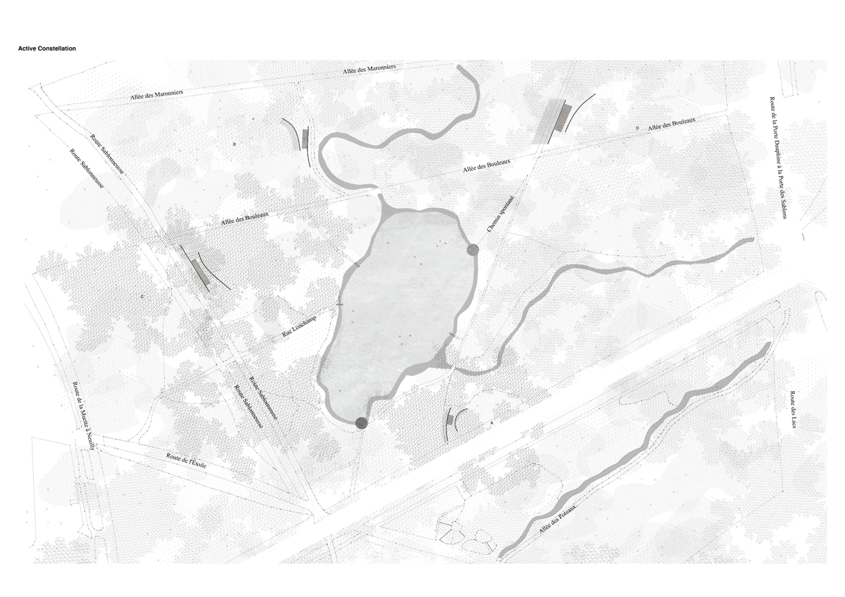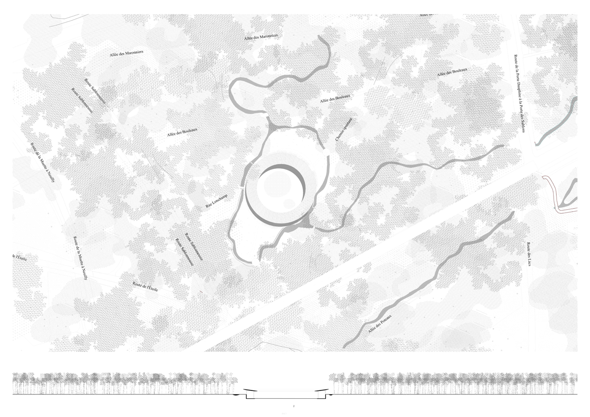 This part of the proposal is reminiscent of the founding idea of the Bois de Boulogne: to build a kiosk at every access point, at every crossroads. With the intention of creating points of connection between the long paths that surround the forest in silence.