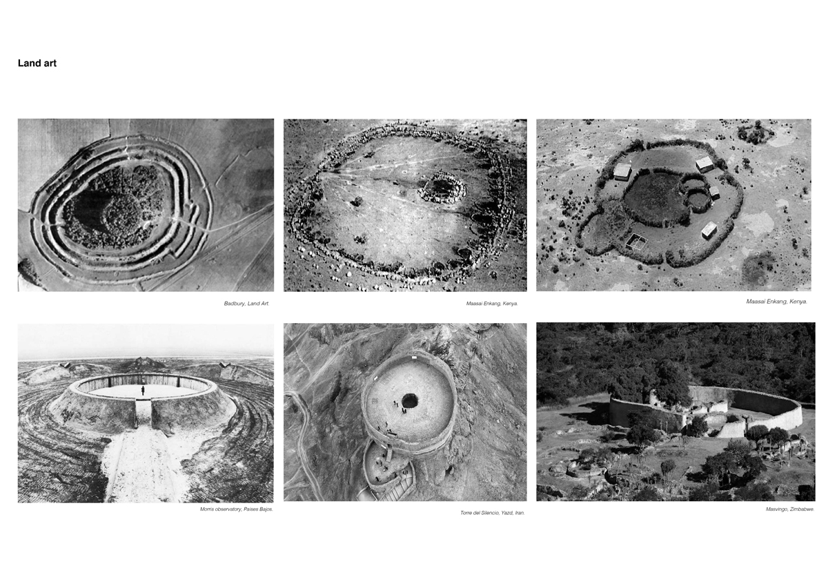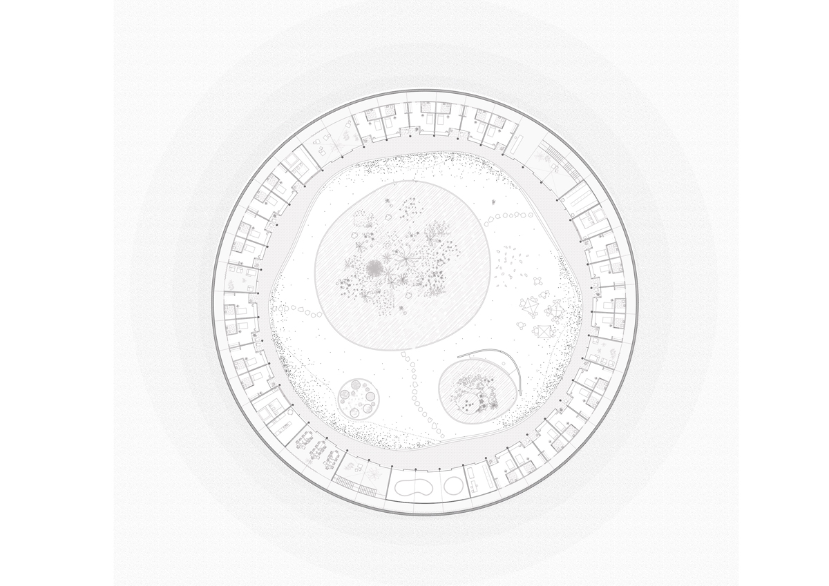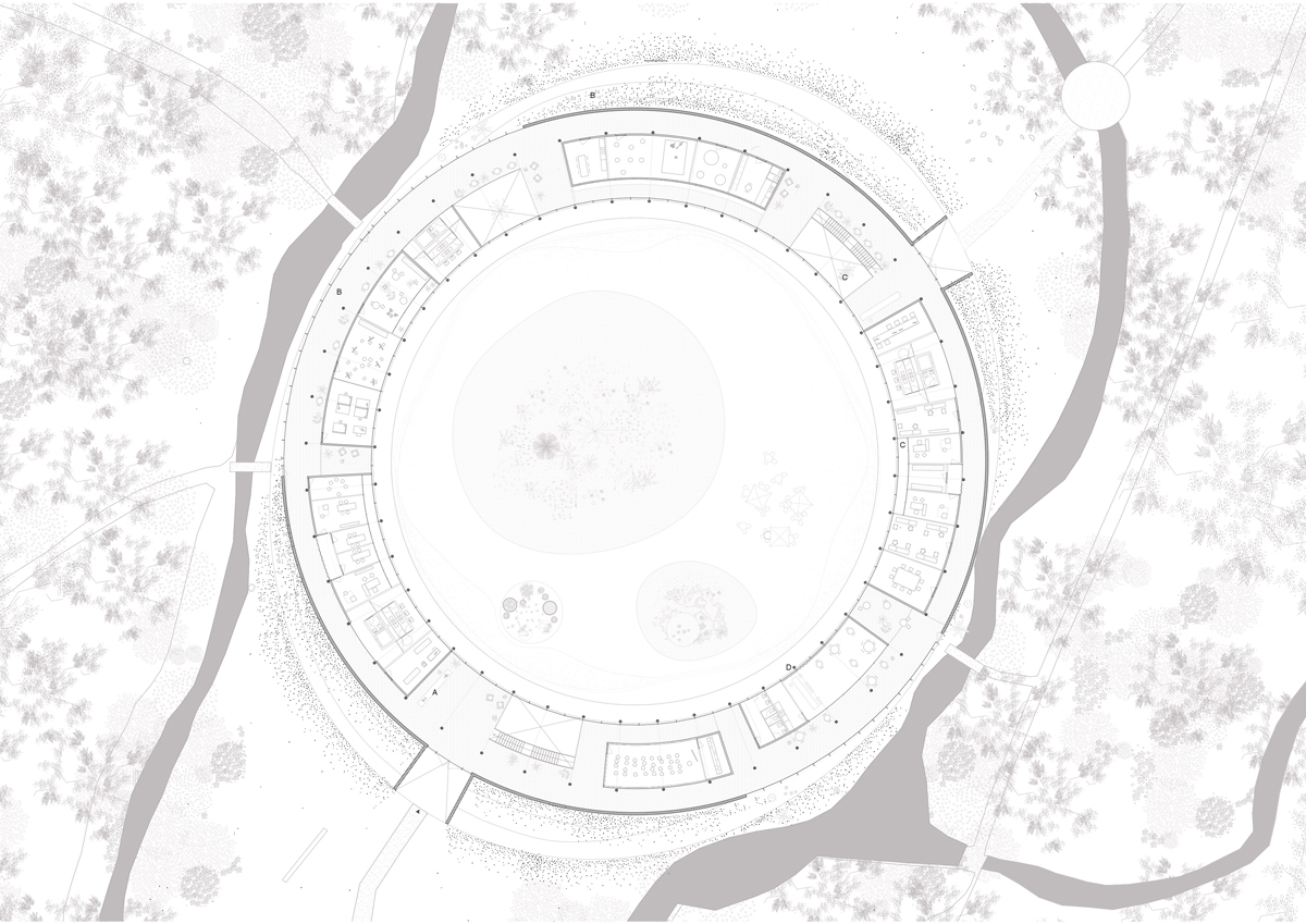 A circular structure that, due to its scale, dilutes with the surroundings. In this way, the building becomes an artifact, which is integrated into the landscape by contrast with it.