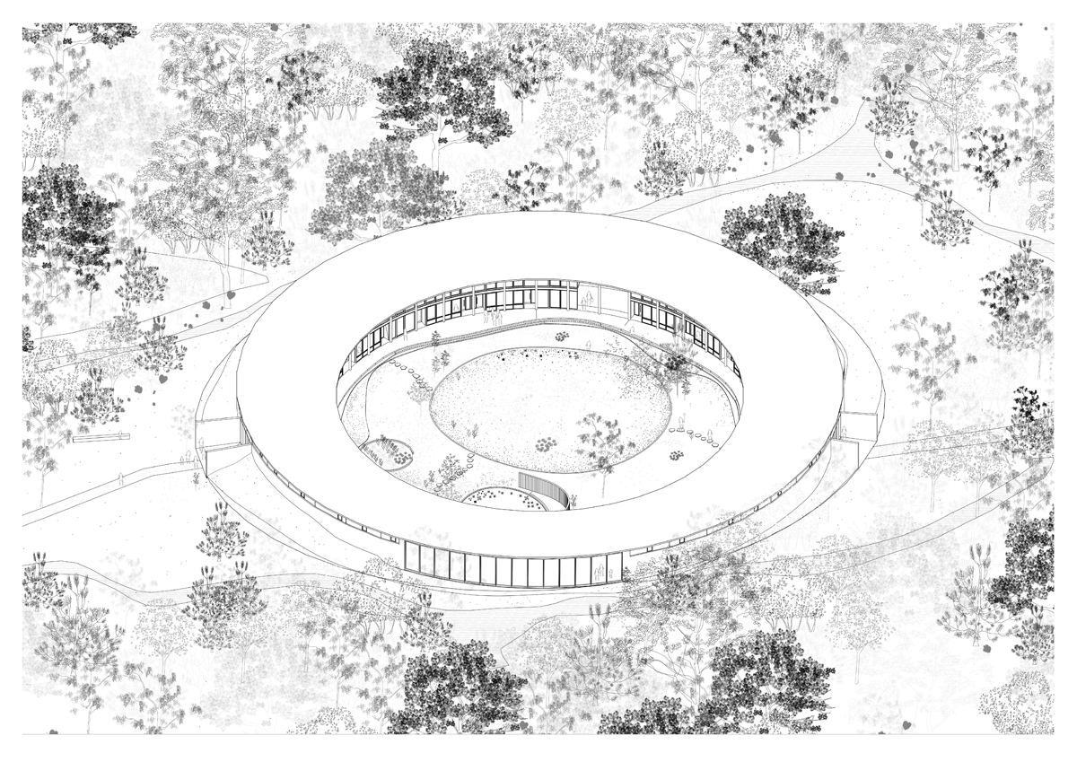 In this proposal, in the same way that excavation is done to provide privacy, the earth from the excavation is also used to provide intimacy by placing it around the building.