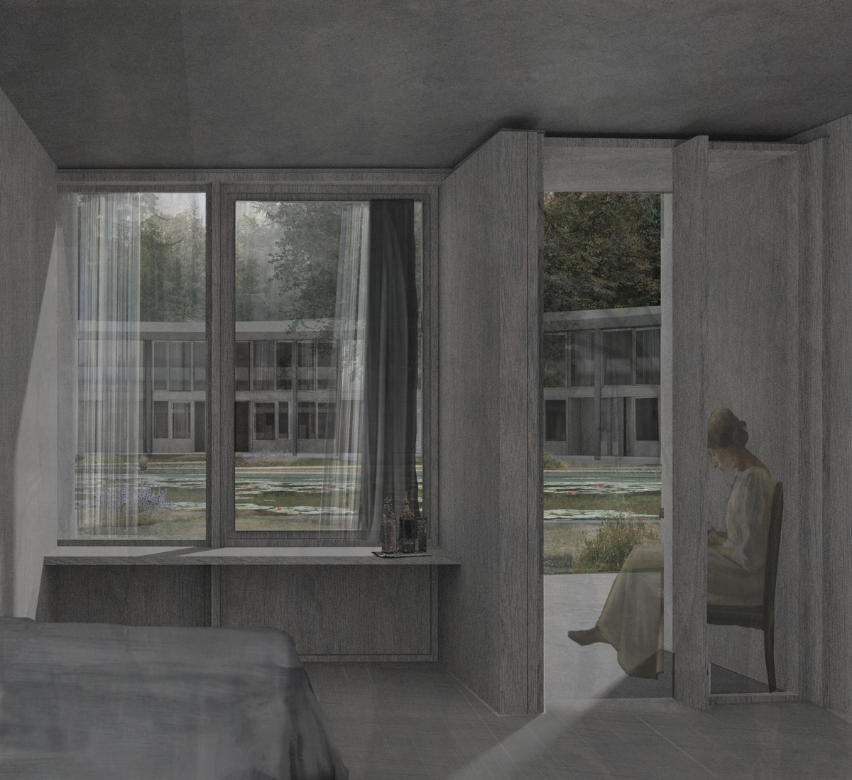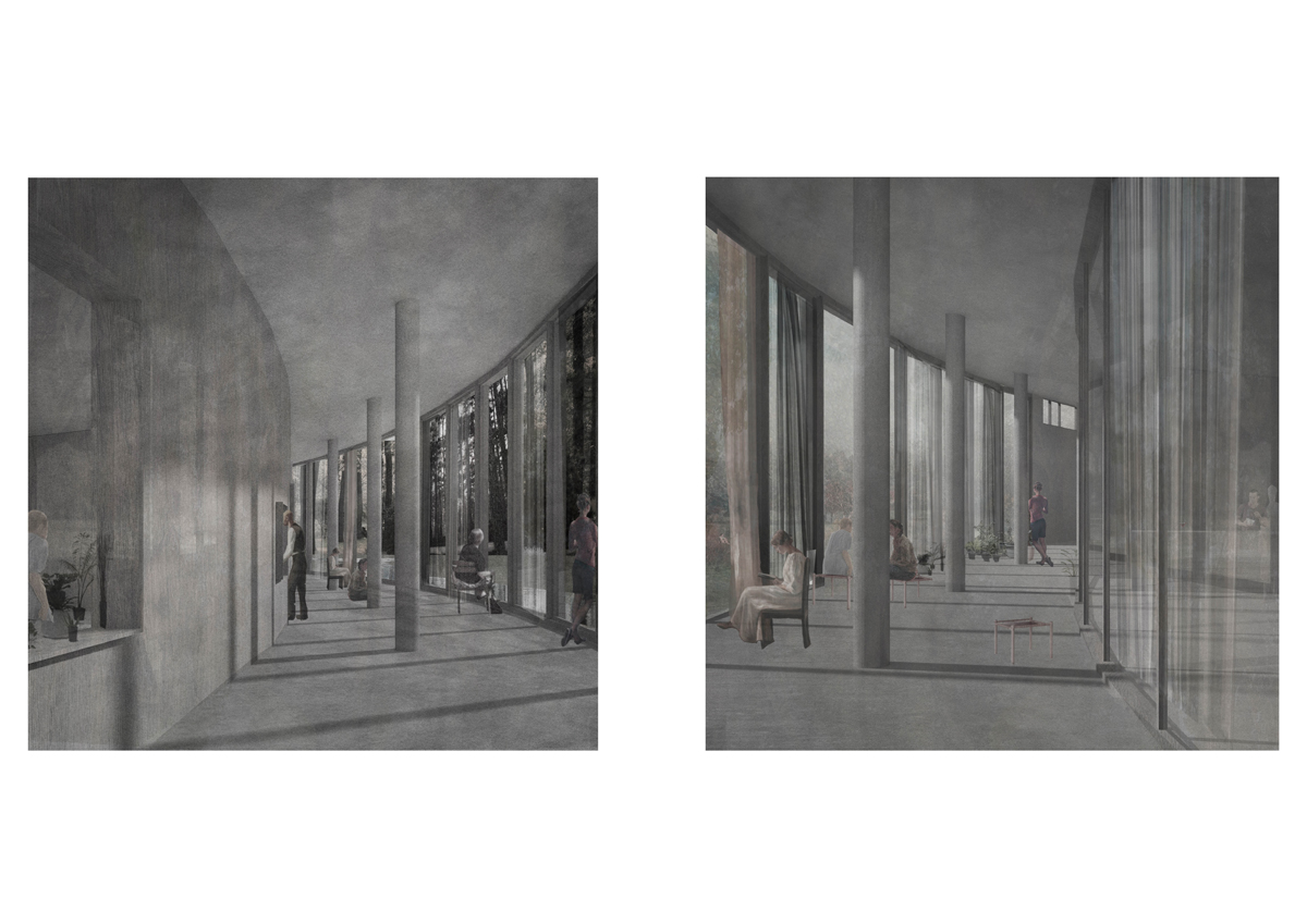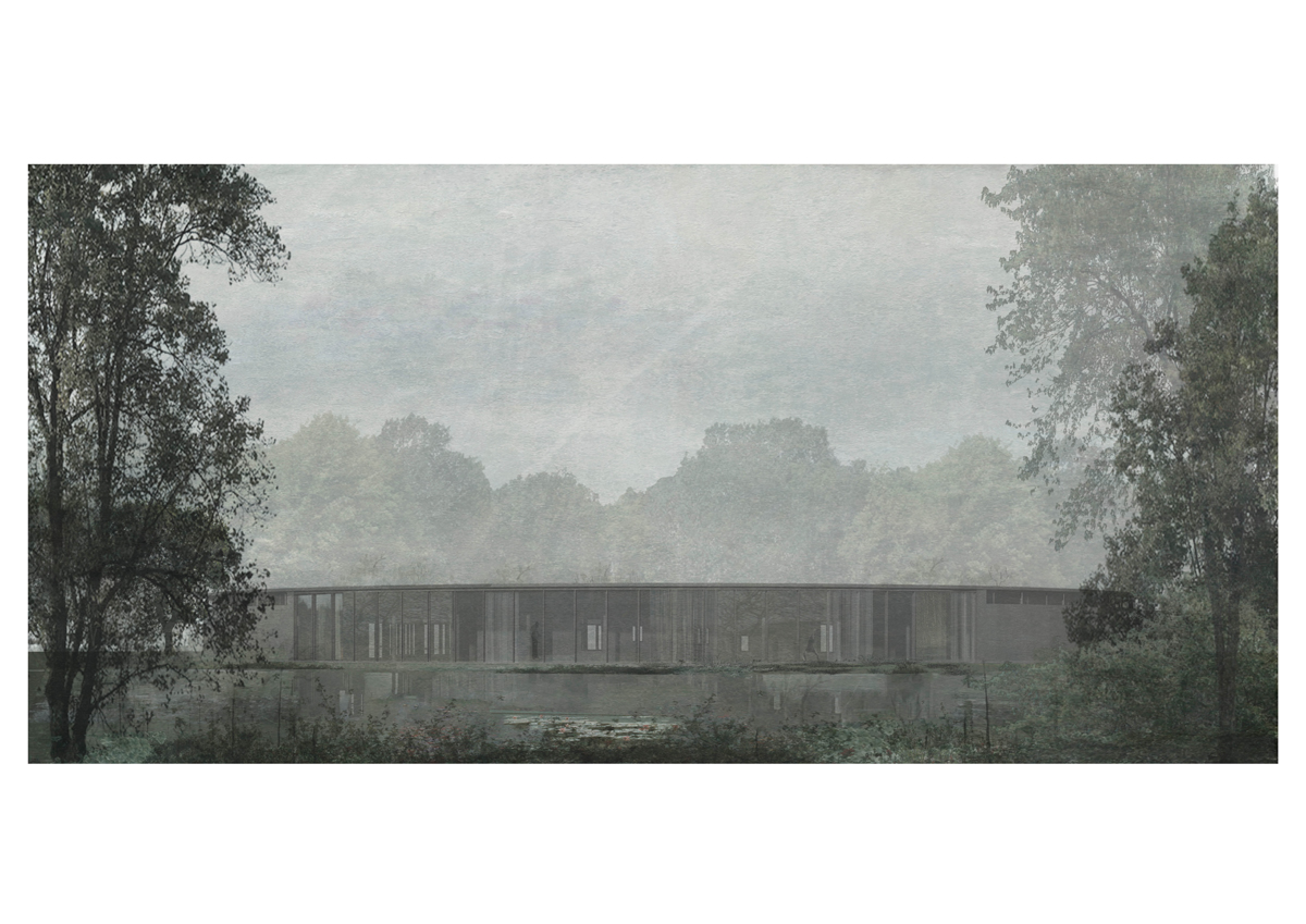 A community centre for mental rehabilitation and pleasure. To integrate architecture into therapy and to integrate these atmospheres into society.The project is based on a humanistic approach. The ambition to create a peaceful space for a vulnerable group of patients and families, combined with an optimal setting for all those working there. Architecture and greenery enrich each other in a dependent symbiosis, engendering an association of harmony and peace.