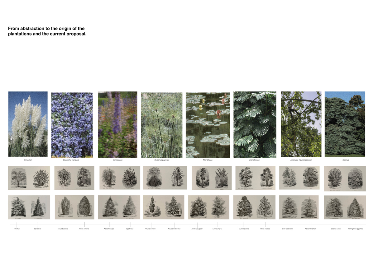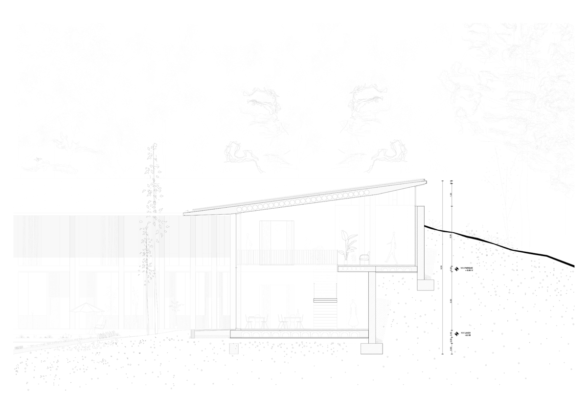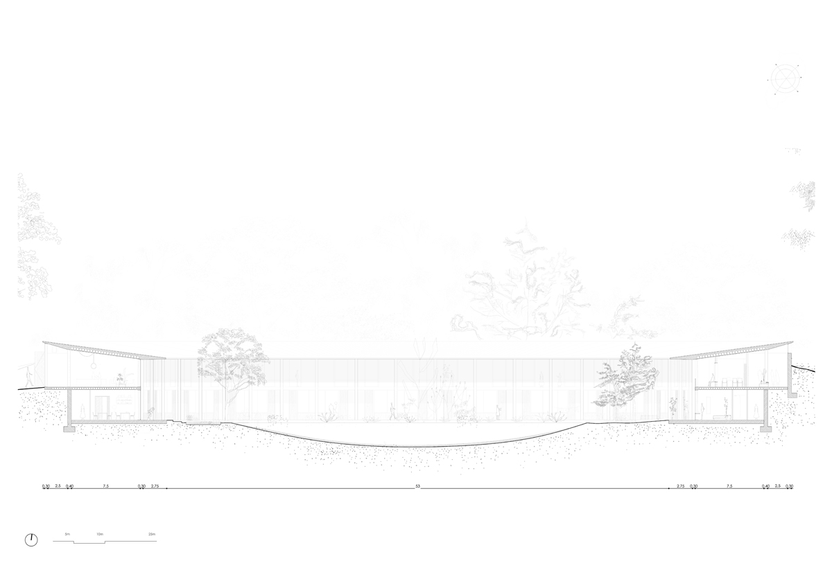 - Interior view: A rhythm of pillars appears inside the volume that marks the elevation of the garden. A double height dialogues with the scale of the forest.