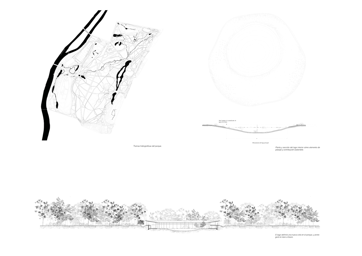 The integration of water surfaces in the project is understood as one more element of the landscape planning of the park, incorporating a % of lakes and rivers in the total surface but also serving as an element that will define the atmosphere of the interior garden and will participate as an energy system.