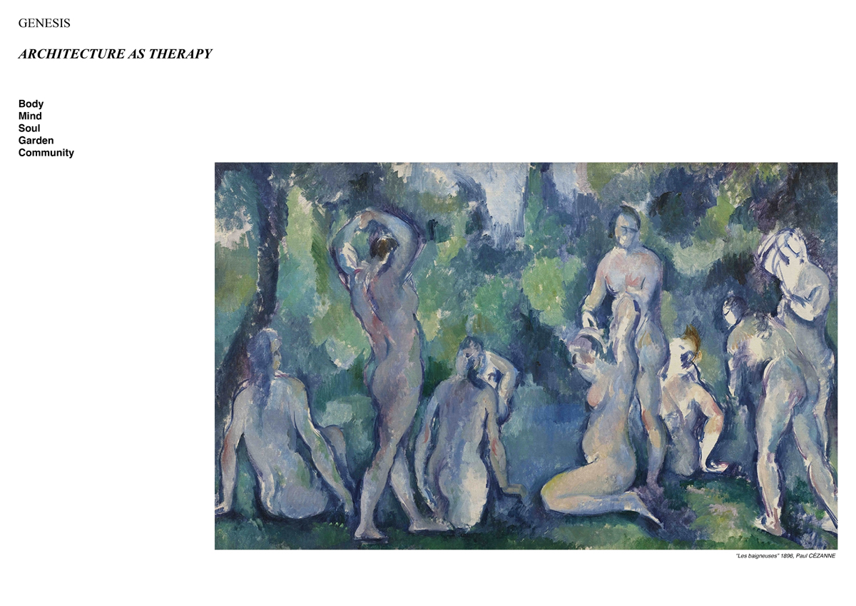 Therapeutic architecture consists of re-humanizing the world physically constructed. It focuses on anthroposophical visions and provides users a sequence of atmospheres: from intimacy to reconnection with others and nature.”