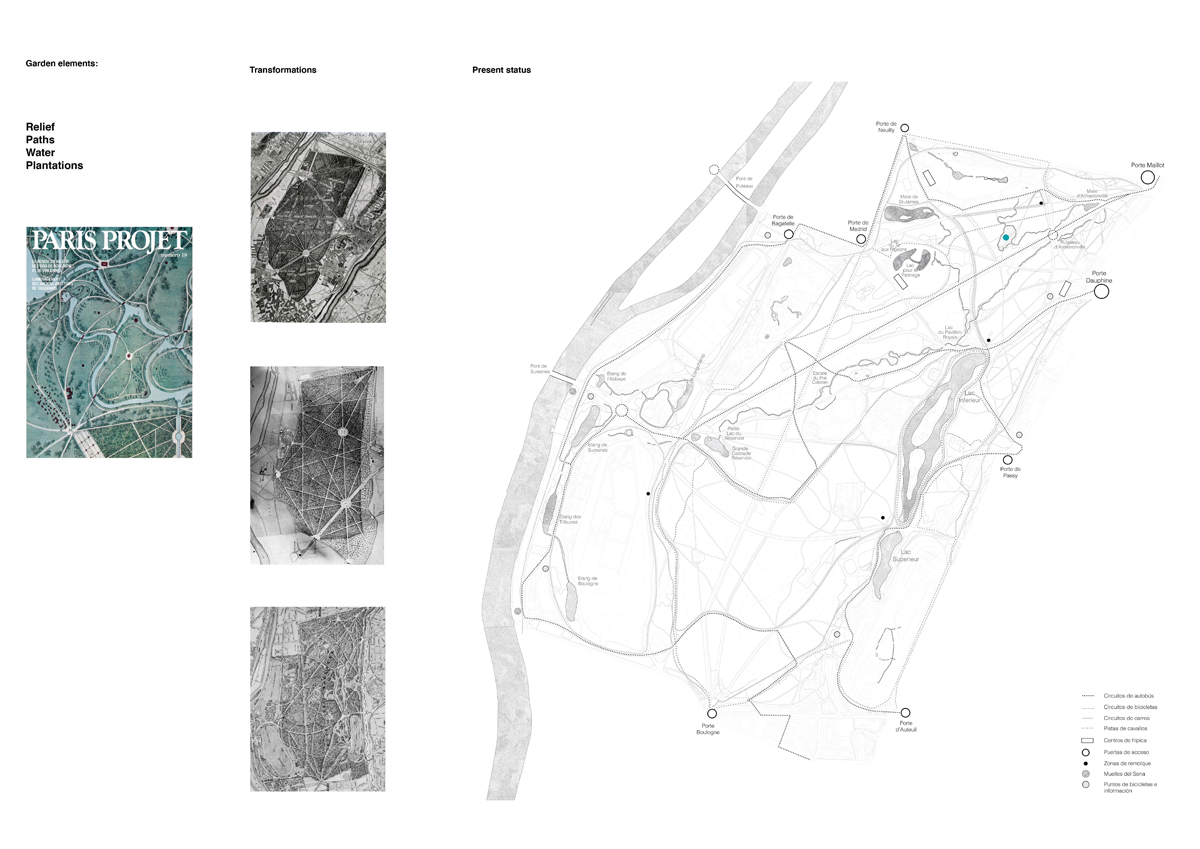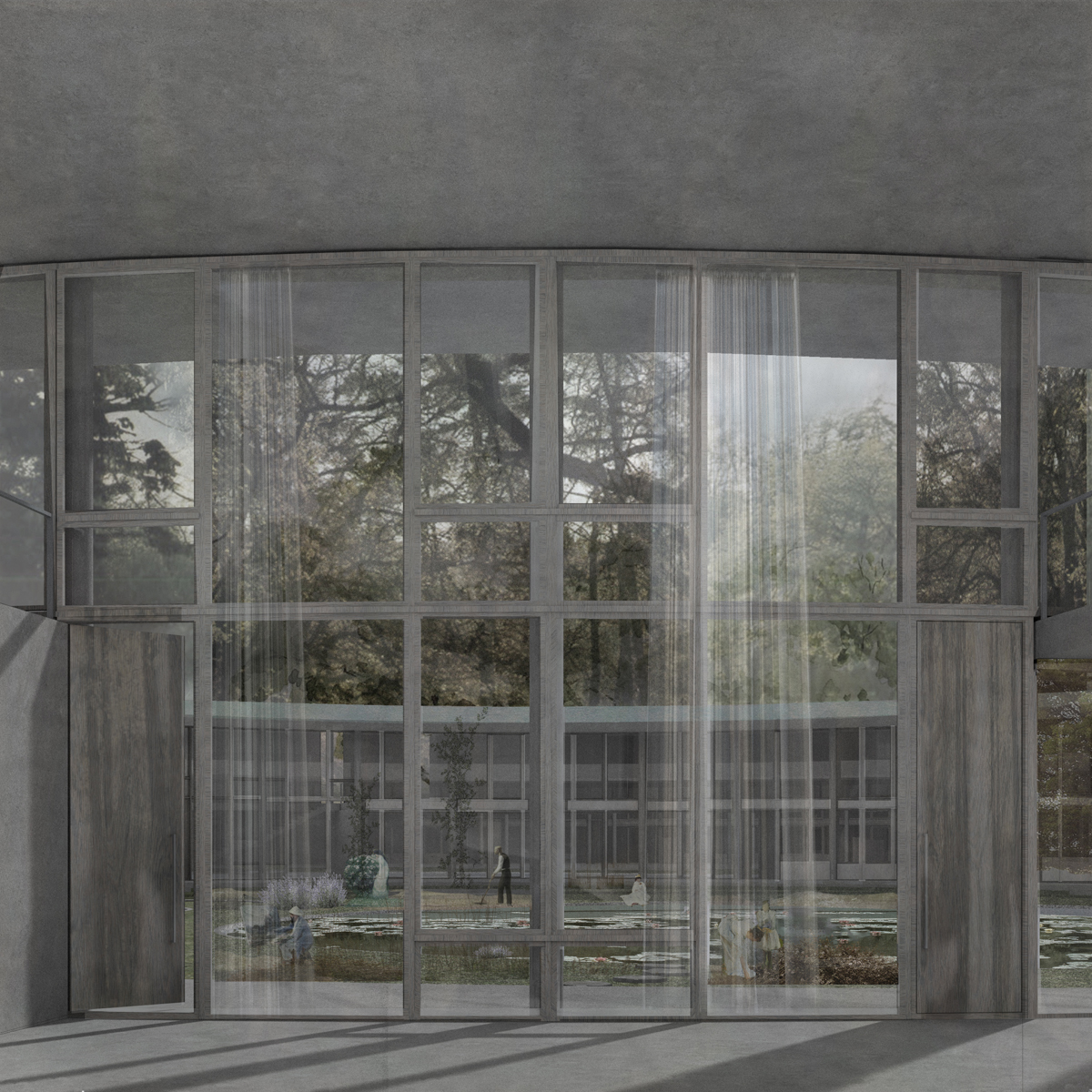In the Bois de Boulogne, we find an atmosphere that favors serenity and mental health. The green, the water, the incidence of light, are elements that define the universe of the park, and that, accompanied by an architecture/refuge, will create a more intimate interior space, but with some similar characteristics, but more typical of a domestic space.