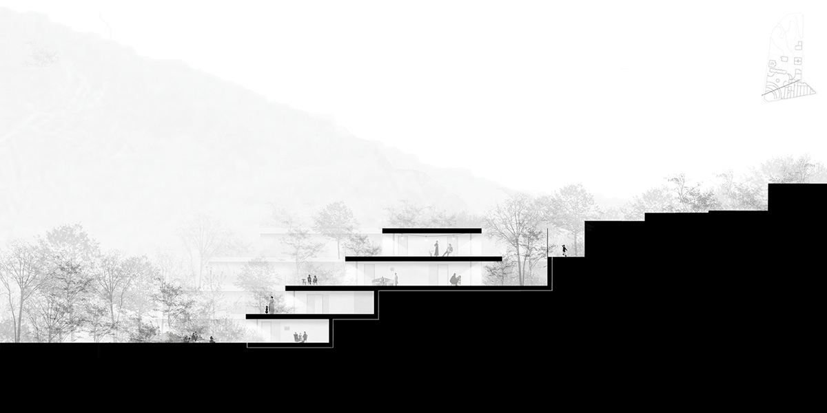 Partimos de la idea de hacer un edificio invisible, que se retrasa del frente urbano formando un gran jardín aprovechando el desnivel para fusionar montaña, naturaleza y entorno.