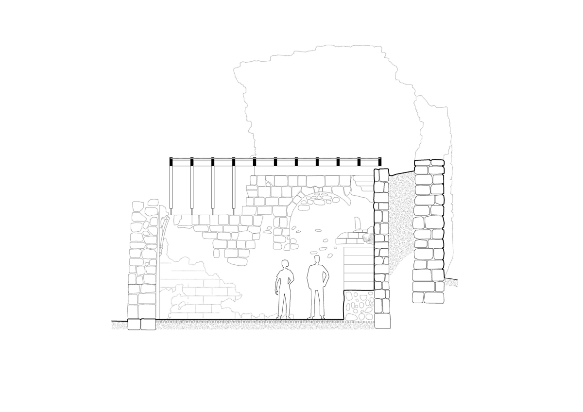 El proyecto responde a este descubrimiento y plantea la cobertura de este espacio para evitar la entrada de agua y permitir los futuros trabajos arqueológicos. La cubierta se materializa con una estructura ligera de madera laminada que reconoce la traza histórica y un cerramiento de planchas de policarbonato para potenciar la iluminación natural. La difícil accesibilidad y la geometría irregular de los muros imposibilitan trabajar con elementos prefabricados y comportan la elección de un sistema constructivo ligero realizado in situ. La nueva estructura se adapta a la preexistencia y se sustenta puntualmente con varillas roscadas aprovechando la cimentación original, permitiendo así su reversibilidad.