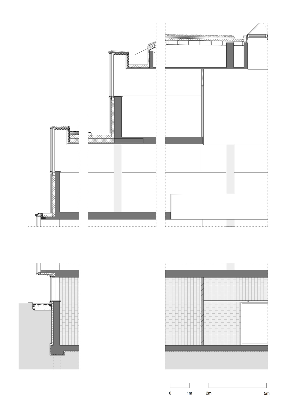 As described the atelier house was principally designed from the inside out. As a result, the inner logic of the building is directly transmitted onto the outside facade. Up to 5,3m long and up to 2,3m high fixed glass windows are forming continuous horizontal glass bands that are dominating the exterior. The building has a glass plinth and its pair of roof edges are also made out of glass, giving the building a very particular and transparent character that is underlined by the open glass corners. The large panorama window of 14m x 4m in the middle of the house subtly pops out of the otherwise smooth facade offering deep views into the interior of the school. Between the horizontal glass bands, corrugated aluminum plates with vertical channels are placed. Similar to the window frames, they are anodised in a brass tone that is matching the surrounding brick buildings. The perforation of the aluminum plates with a pattern of circular holes adds additional lightness to the facade.
