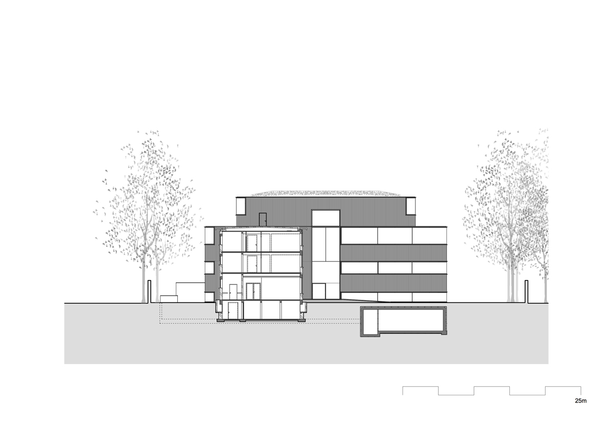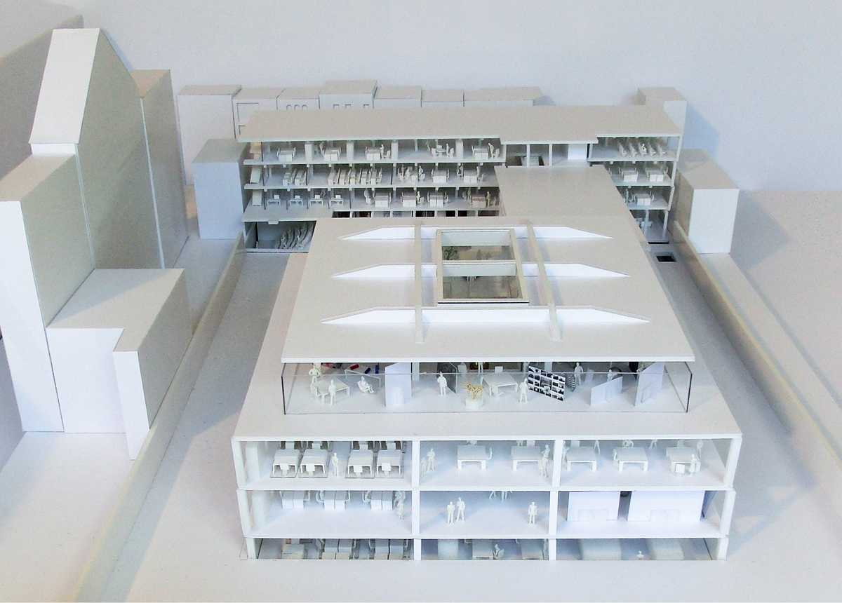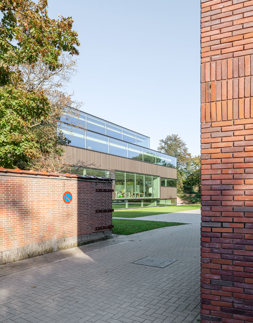 The starting point of the design was the transformation of an existing nursing school from the late 1950s. The pleasant building was still in good shape after almost 60 years of use but offered only small and inflexible classrooms which are inadequate conditions for contemporary art education and art production. As the budget did not allow for complete demolition of the existing house, Atelier Kempe Thill decided to go for a combined strategy of part re-use, part transformation and part demolition to make space for a substantial new extension of the institute. The main building along the street and the side-wing were maintained, while the two smaller auditoria on the garden side were demolished.