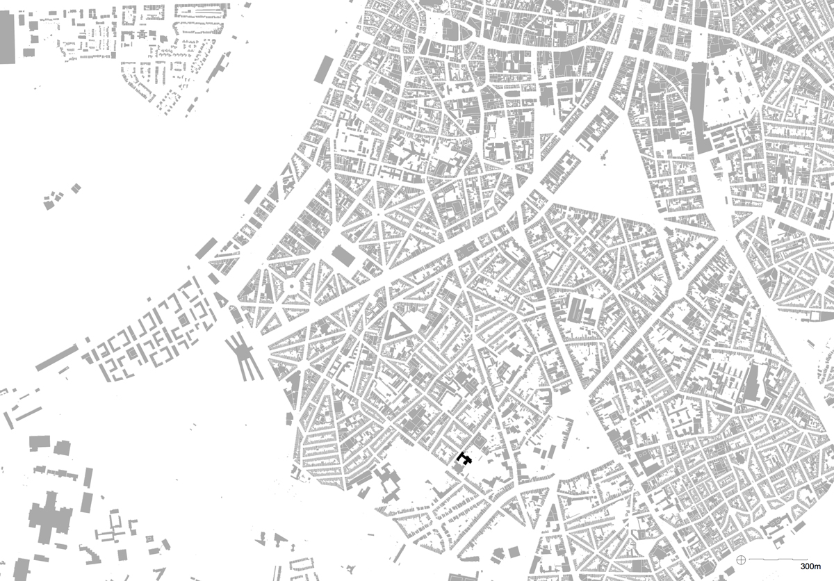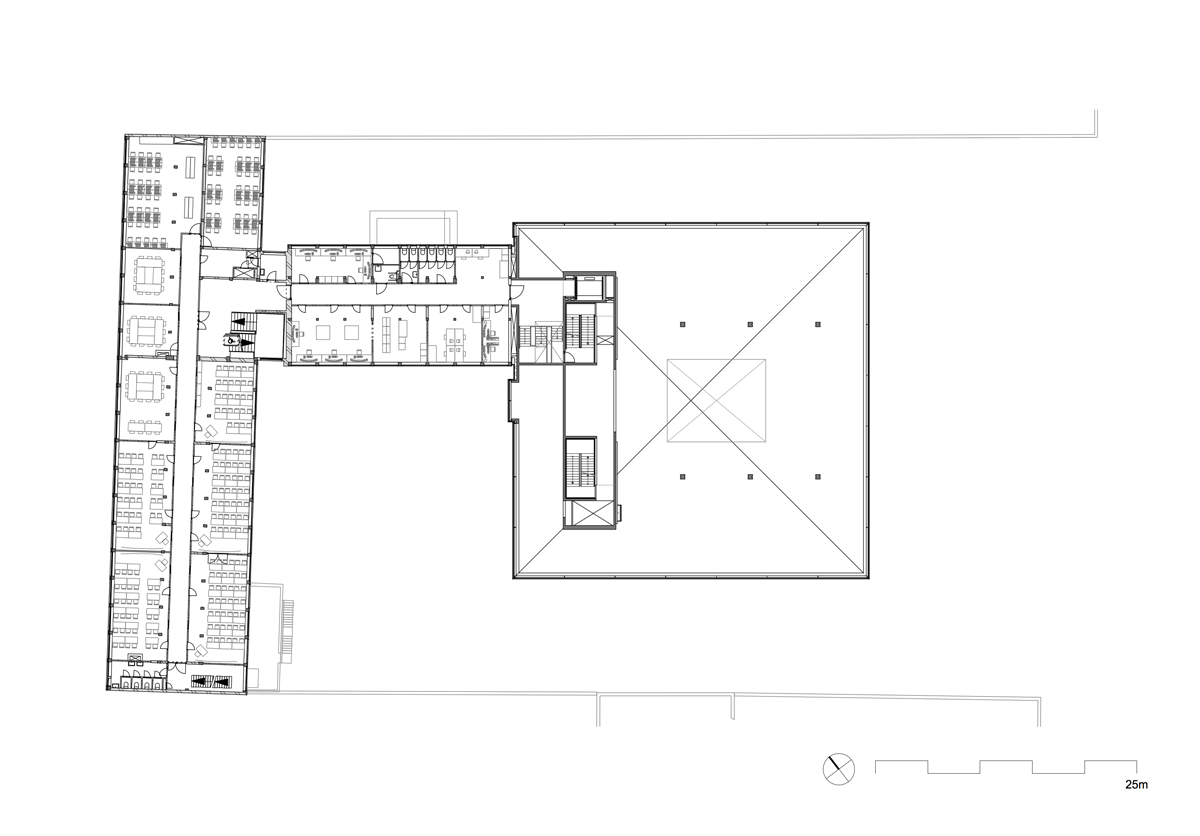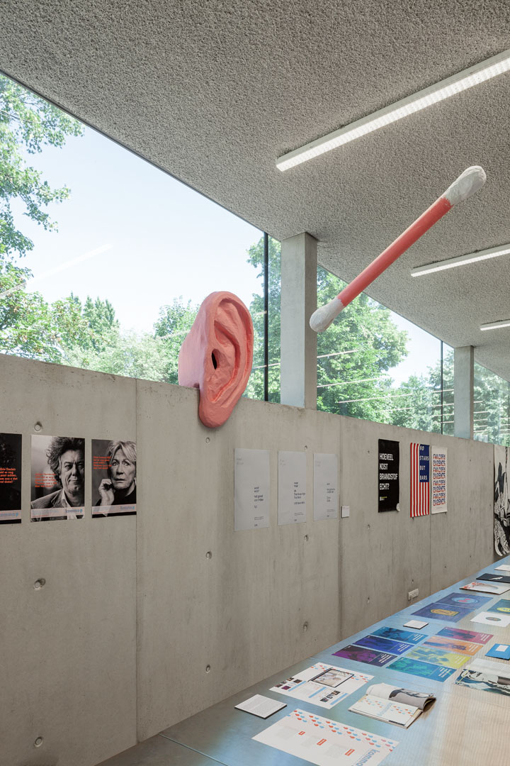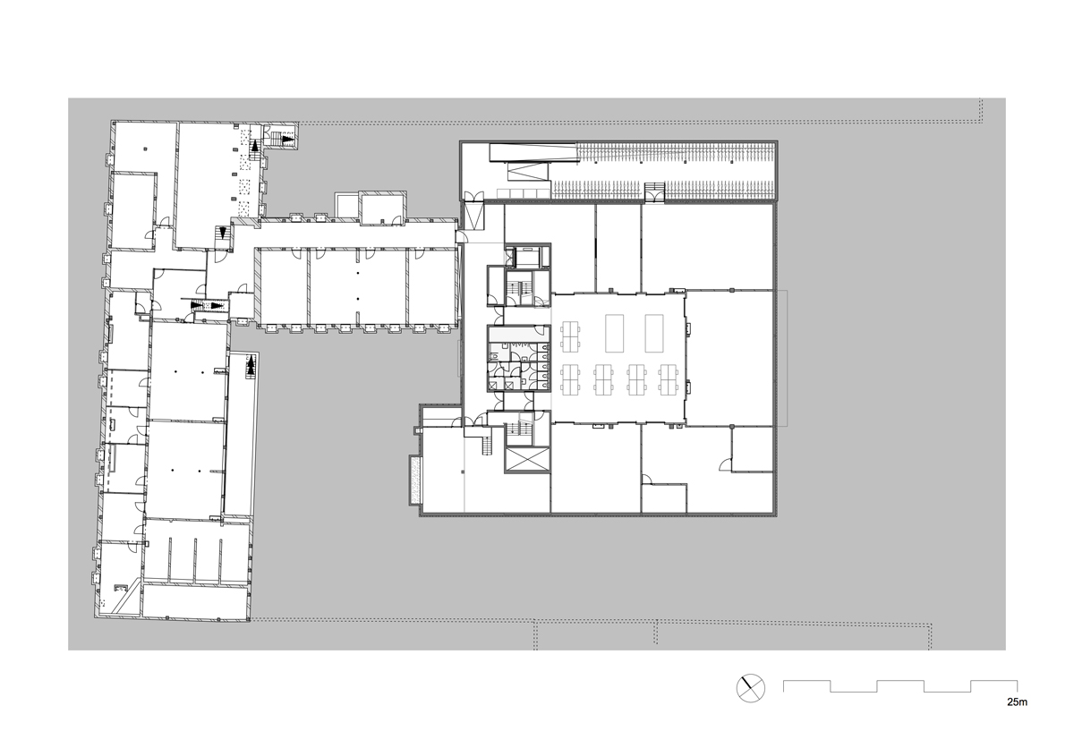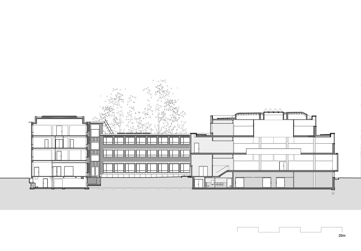 The transformation focused mainly on the ground floor level of the existing nursing school. In order to give the school a more public character, nearly all non-loadbearing and partially load-bearing walls have been removed to realise more prominent and flexible spaces. The facade towards the street has been opened up by the introduction of new large windows to create a strong visual interaction between the street and the school. Functions like the public art library and an exhibition hall have been placed along the street facade to maximise interaction with the public and the city. A student restaurant, serving as a community hub, has been realised in the central side wing, creating a visual connection with the green courtyard and the entrance hall. Additionally, a significant photo studio was placed on the roof of the existing school. To create the studio, the existing roof had to be partly removed to ensure higher and more flexible spaces, and a new secondary construction had to be added.
