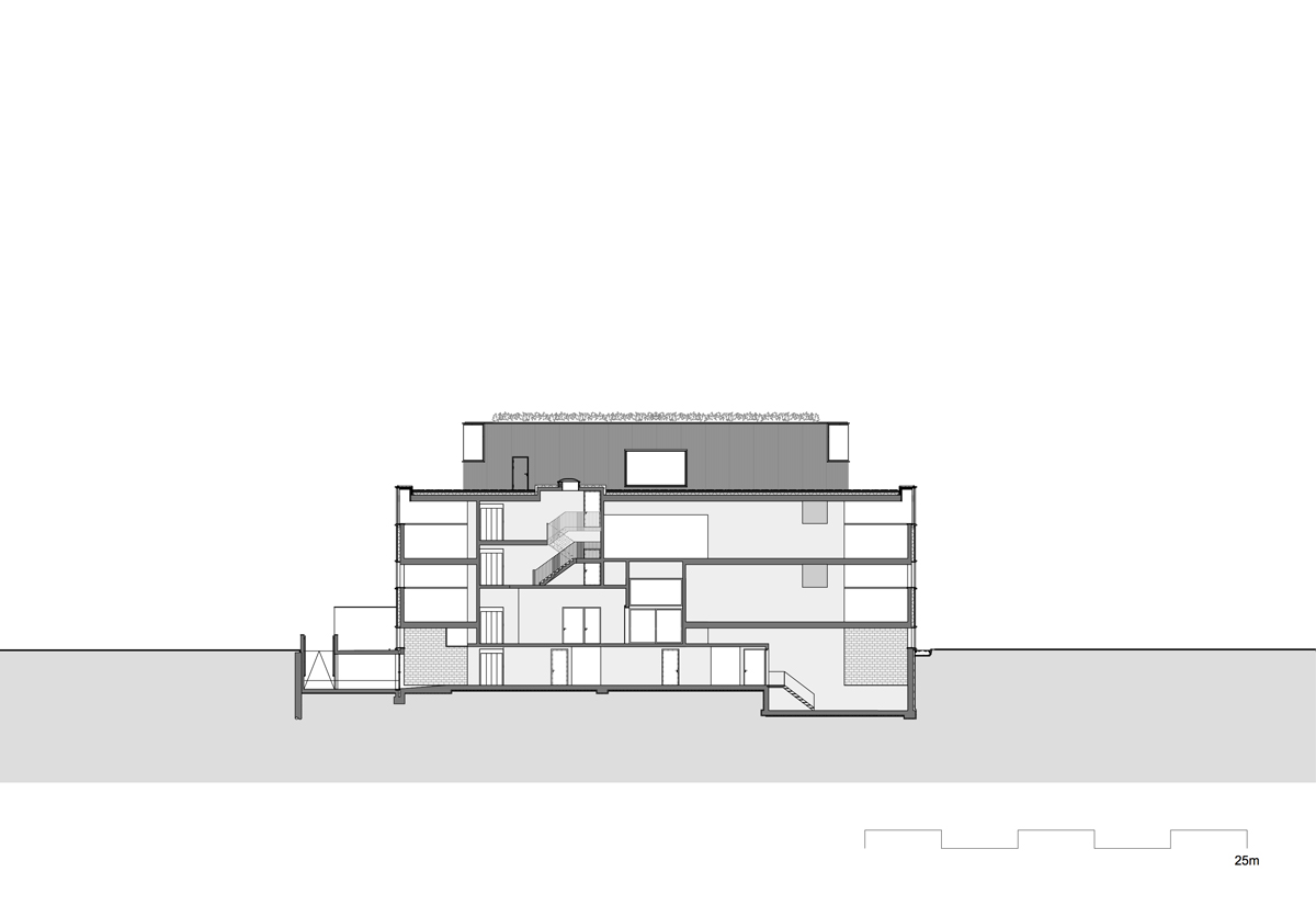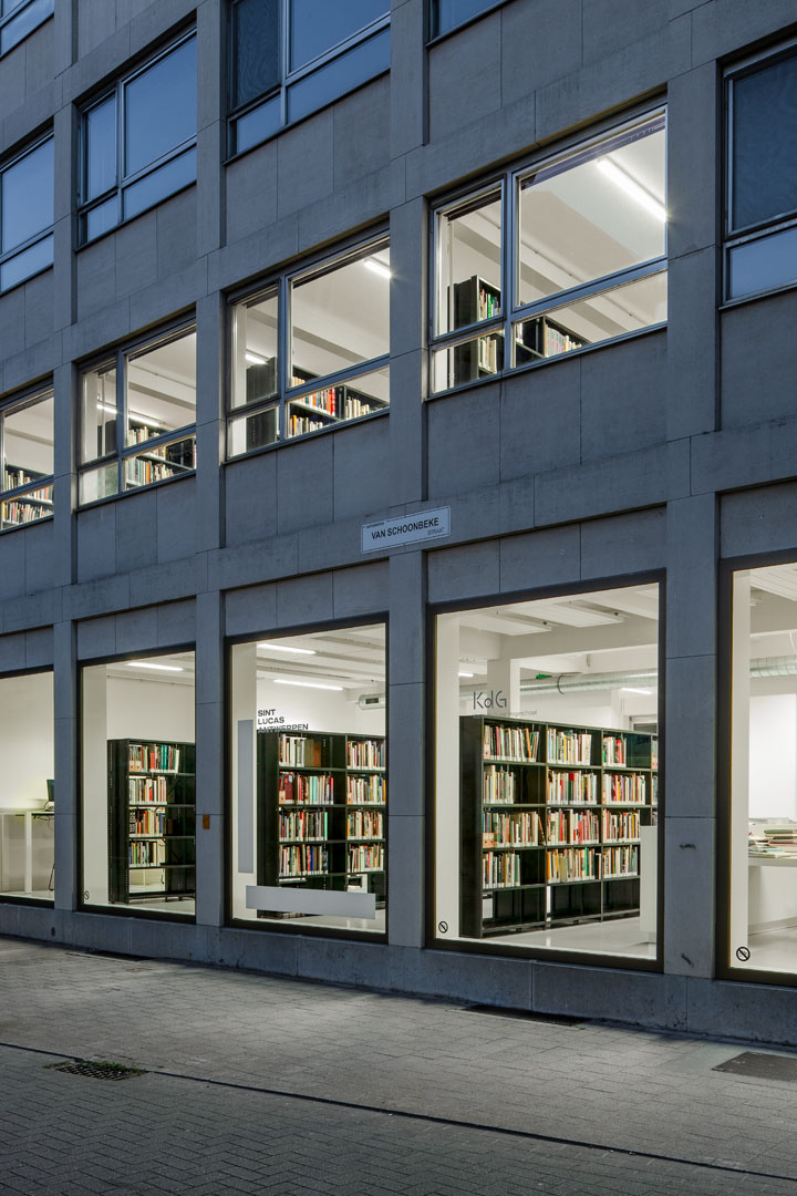 The resulting project can be seen as an interesting contribution to the discussion about the future of art schools. With its open plateaus, the school is supporting more collaborative working methods on various levels, offering enormous flexibility towards the future, and stimulating unexpected expressions of art. The public character of the building is supported by the open library and the permanent exhibition space, which both interact directly with the public space. Semi-annually the school organises large exhibitions of student works and the building suddenly functions as a big exhibition hall. The atelier house with its big void and perfect daylight conditions has the appearance of a contemporary art museum during these shows, attracting thousands of visitors, and turning the school into a truly public building of the city of Antwerp. As a consequence, the students get the opportunity to present their work to a broader audience in a very elegant environment that supports them to find their way as future artists. The St. Lucas schools’ public representation is not realised by monumental expression of the facades or the use of expensive materials but through almost unexpected impressive spaces and refreshing transparencies. These stimulate interaction with the city, and at the same time, they avoid the usually more closed character of traditional educational institutes.
