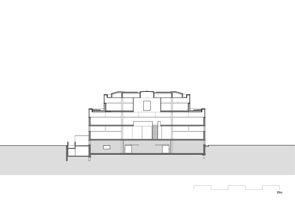 On the garden side of the existing school, a substantial new extension in the form of an atelier house helped offer the institute more flexible and inspiring studio spaces. The new, relatively big, volume had to be implemented sensitively into the existing urban fabric of the early 20th century building block. Consequently, the building volume is partly sunken into the ground to avoid it becoming too high and the last floor of the new volume has a substantial set-back to reduce the visual impact of the new house. The atelier with its open glass facades tries to appear rather light and is in search, with its brass-anodized metal facade, for a dialogue with the monumental Sint Laurentius church and other brick buildings in the close surroundings. The compact volume of approximately 34m x 34m consists of four floors of 3,75m free height. The basement with its excellent daylight conditions, houses workshops, printing rooms and spaces for jewel production. The ground floor and the first floor are used as studio spaces for artists and are connected by a 12m high void of approx. 8m x 13m that is lit by a big, central skylight. On the second floor, one can find spaces for the drawing education program offered by the institute.