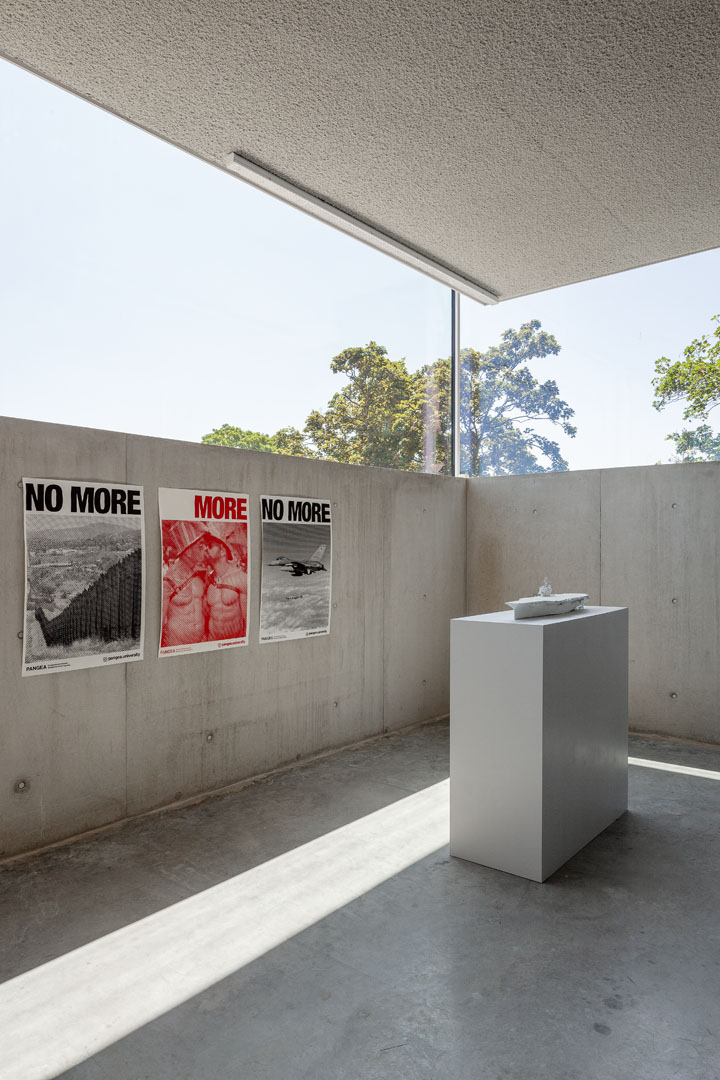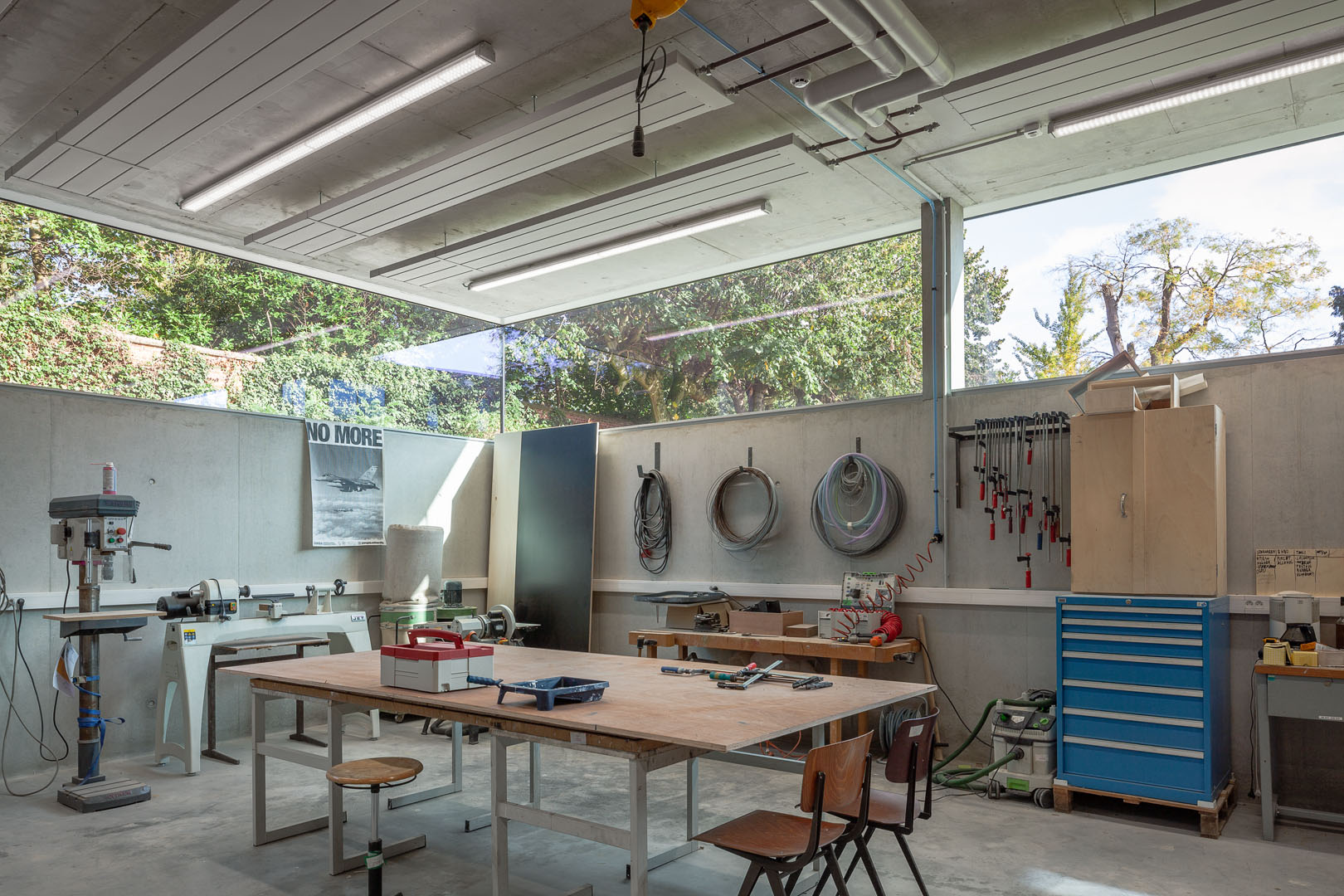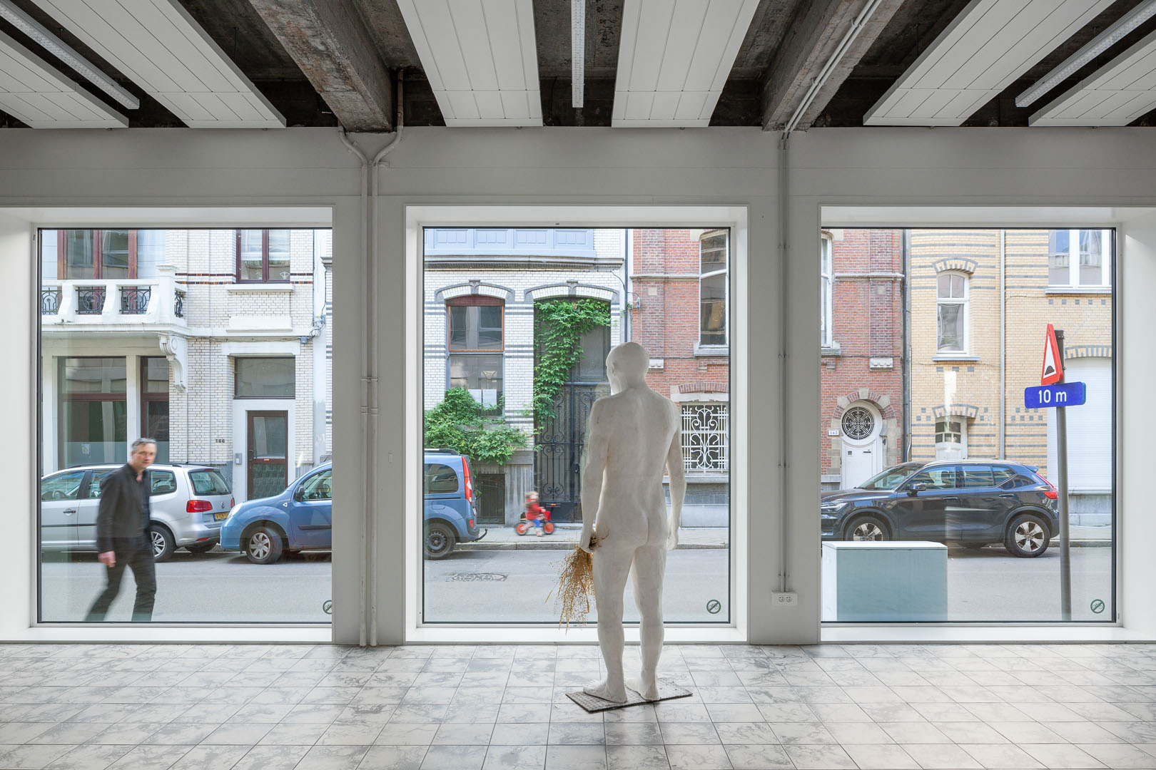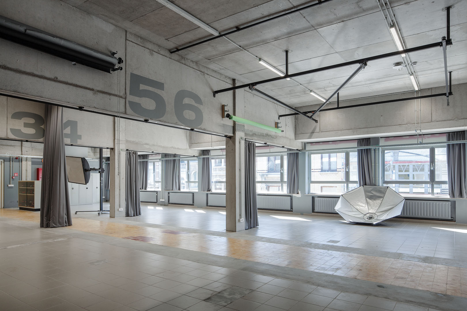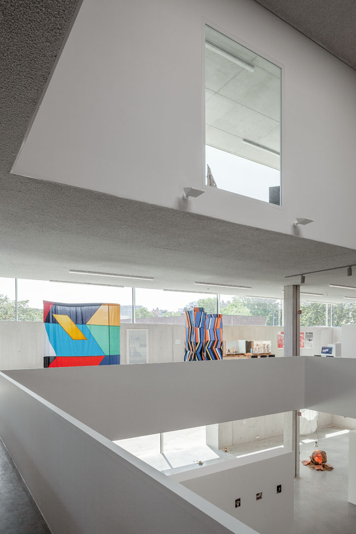 The facade design resulted in a project-specific solution. It offers a maximum of closed walls, providing an ideal solution for the production and the display of artworks. The closed walls are 2,2m high and enclose the big spaces, ensuring a highly concentrated atmosphere inside the building. On top of the wall, large horizontal windows are placed that bring in a maximum amount of daylight and fill the deep volume with natural light. The windows, that offer pleasant views towards the sky and the treetops, avoid an otherwise too hermetic character of the space. Only at the ground floor level, one can find one 14m wide floor-to-ceiling window that provides panoramic views towards the green park-like courtyard of the exceptionally big building block.