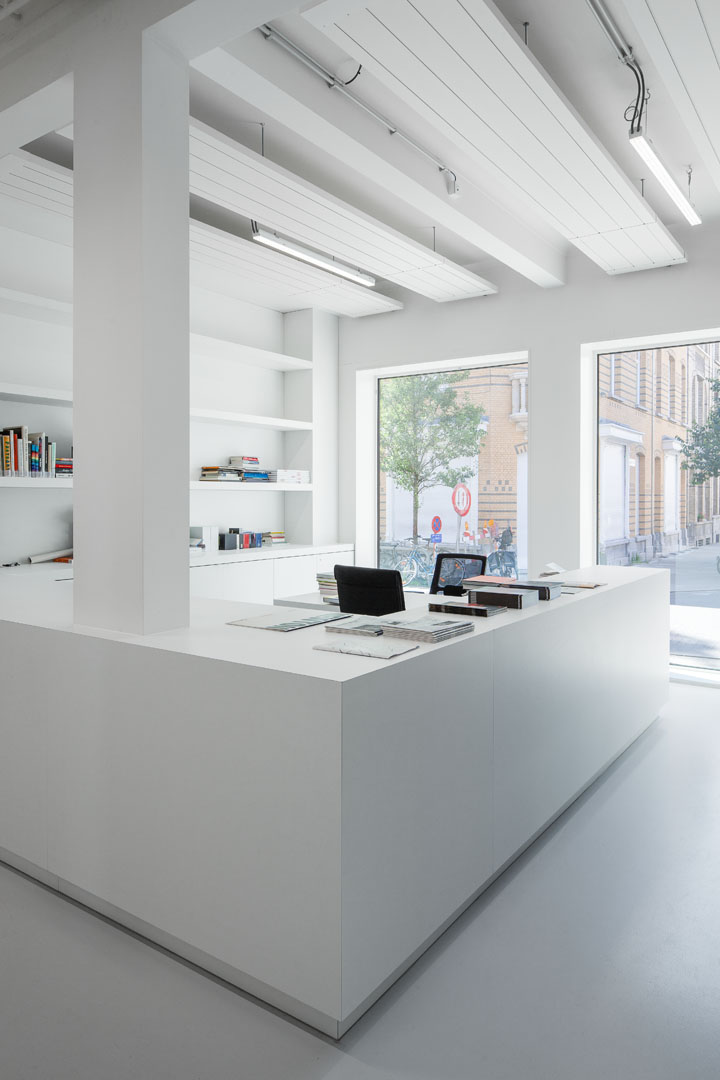 In an effort to stay within the budget, Atelier Kempe Thill tried to find a relatively economical system for the construction of the atelier house. The starting point was the concept of building the house like a parking garage. All the floors are made of massive polished concrete to keep the building rough and to provide it with a lot of resistance. Acoustic ceilings were avoided wherever possible. Walls and columns are designed in in-situ concrete with a lot attention to the quality of the formwork. In general, the aim was to reduce the necessary structure to a minimum. In consultation with the engineers of BAS Leuven, a structural system was developed with a minimum of columns, loadbearing facades and cantilevering walls in the corners to avoid the need for corner columns. The top roof was executed as a “hanging roof” with prestressed roof beams to avoid further column use. The ventilation system of the building was based on the new BaOpt principle. By doing so horizontal air ducts were avoided resulting in a visually nearly “installation-free” building. The raw character of the house was underlined by the painted steel balustrades around the central atrium as well as some painted wooden interior elements, resulting in a tranquil, concrete-dominated interior which reinforces the focused working process of the artist.