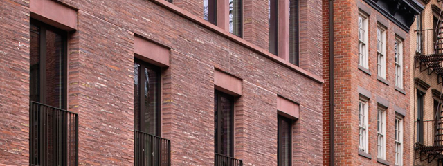 The five storeys that can be seen from street level offer a contemporary interpretation of the surrounding brick townhouses, with a distinct articulation of base, middle and crown. The scale of the entrances as well as the rhythm of the windows, combined with the use of mullions and string courses, reference the rich domestic architecture of the West Village. Local context is also referenced through the colours and materials of the façades.