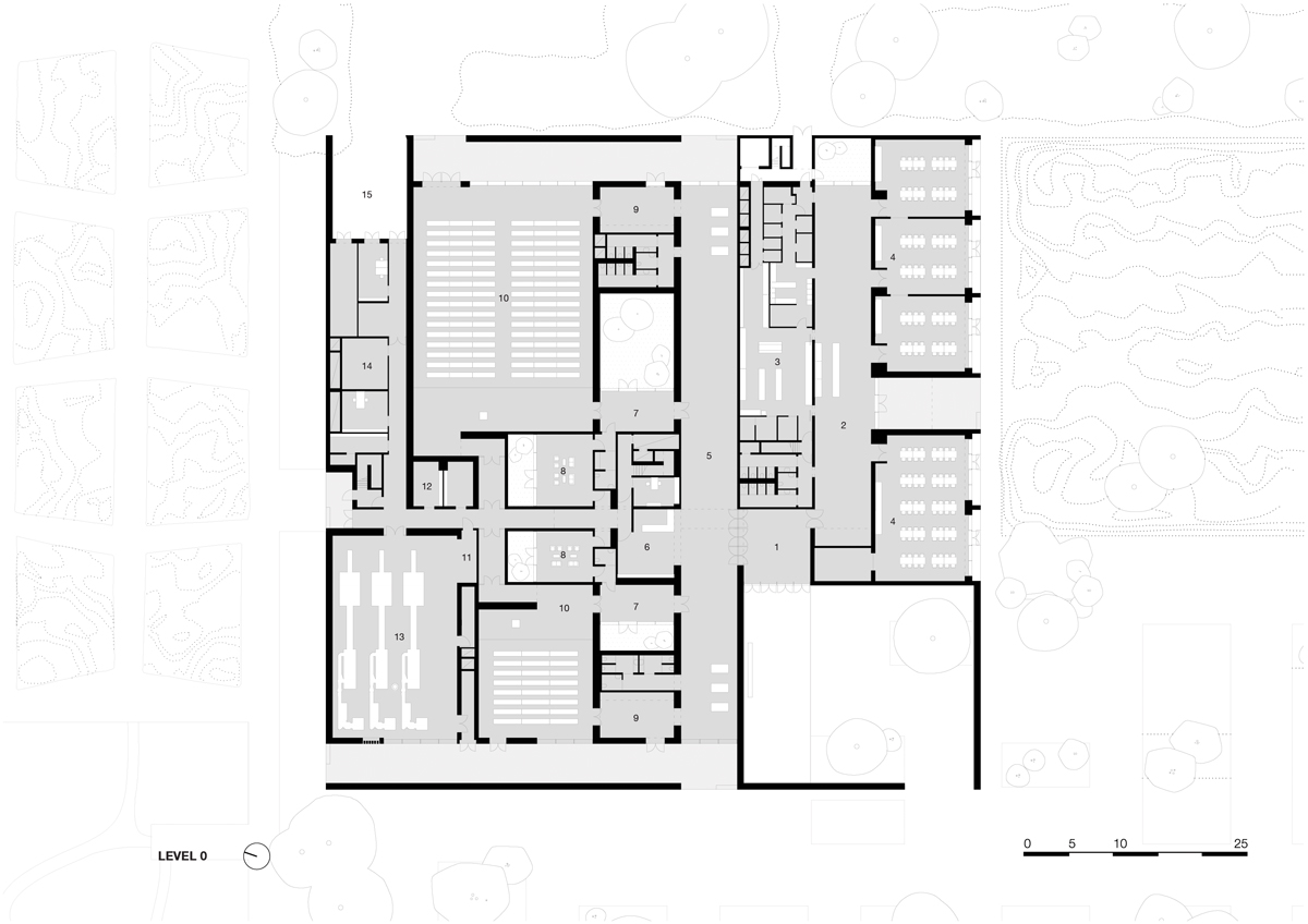 Located in the countryside bordering the western ring road of the Belgian city, the crematorium, with its 74 x 74 metre footprint, merges with trees and shrubs that line the perimeter of the surrounding park, which was conceived by landscape architect Erik Dhont. Approaching the entrance at Blauwenbergstraat, a sense of calm pervades the site and upon arrival, visitors are subtly persuaded to slow down by the undulating gentle green mounds. To the north, a pond serves as a reservoir for rainwater, while small adjacent hills are dedicated to scattered ashes and to an urn garden. At the eastern end, there is a service road for the hearses that is entirely hidden from view so that families are not disturbed during the mourning ceremony, and so that privacy is respected.