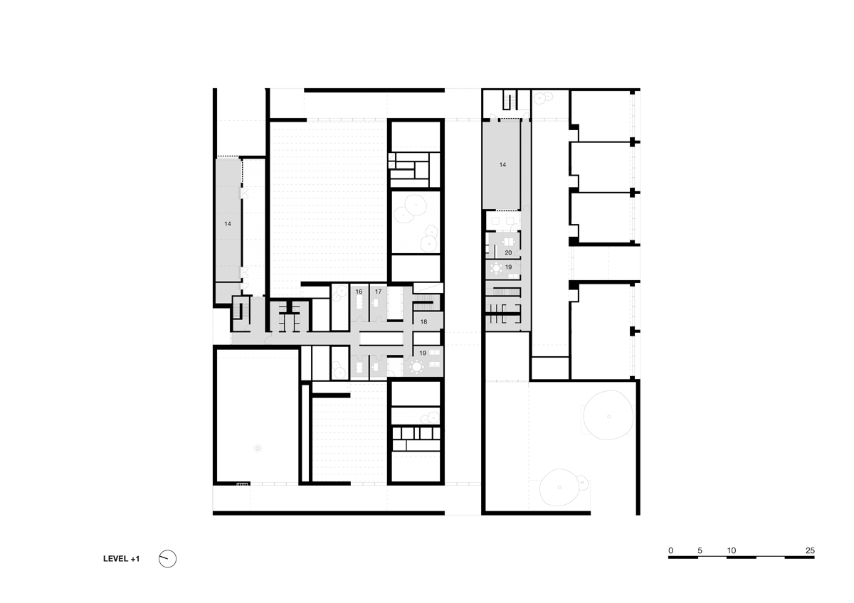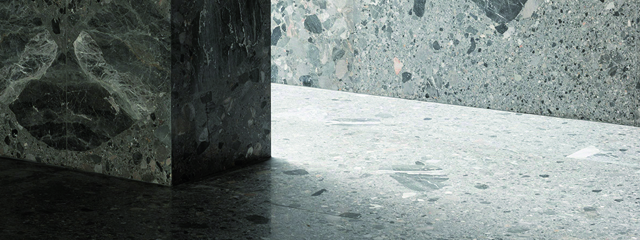 All the spaces express the essence of the architecture, and Breccia Alba marble plays a vital role. After sawing the stone blocks into 2.4 x 1 metre plates, the architects arranged a composition that results in a visually coherent pattern. Floors and walls have been treated in the same way. Identical marble was used for the reception desk in the long foyer, the bar, the lectern, the catafalque and the high skirting of the courtyard walls.