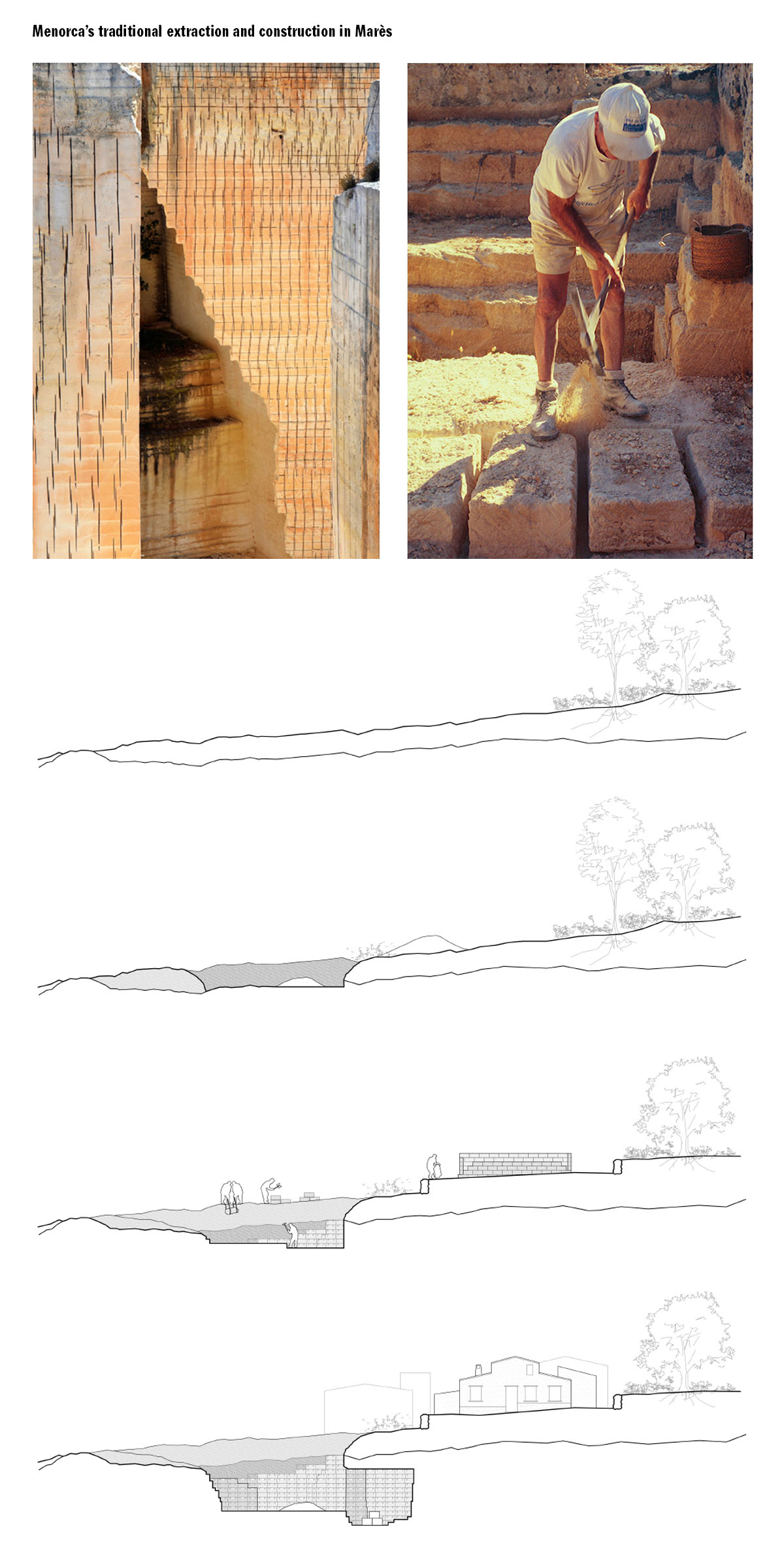 With the aim of truly connecting and embracing with Menorca’s quarrying and building tradition, the research started searching for the essential characteristics of its practice. Below the specific sizes or forms of stone blocks in the island, we identify a direct and tense relation between the activities of quarrying and building hold by the fact that extraction sizes are kept. This creates a language of traces and proportions that connects the excavation in the quarries and the resultant architecture. In order to point out this material gesture in Menorca’s constructive tradition, a new extraction technique is introduced on the island, with its autonomous traces, shapes and sizes, but implemented as a process of excavation and building where quarrying characteristics are kept, giving continuity to the island’s constructive tradition explored.